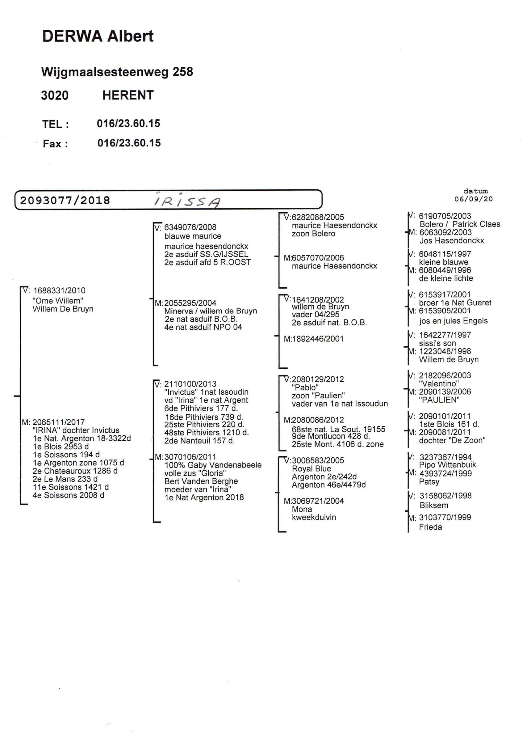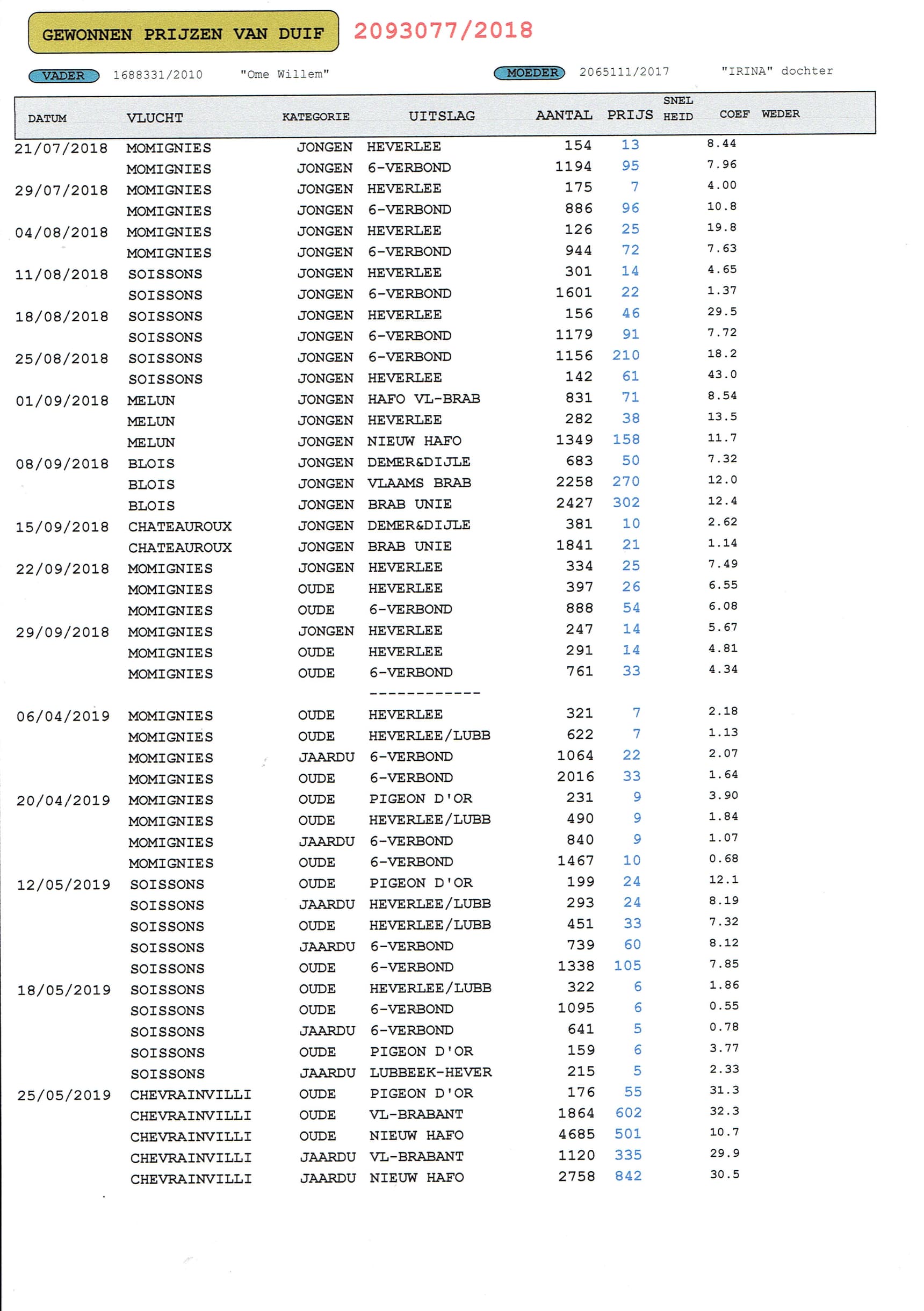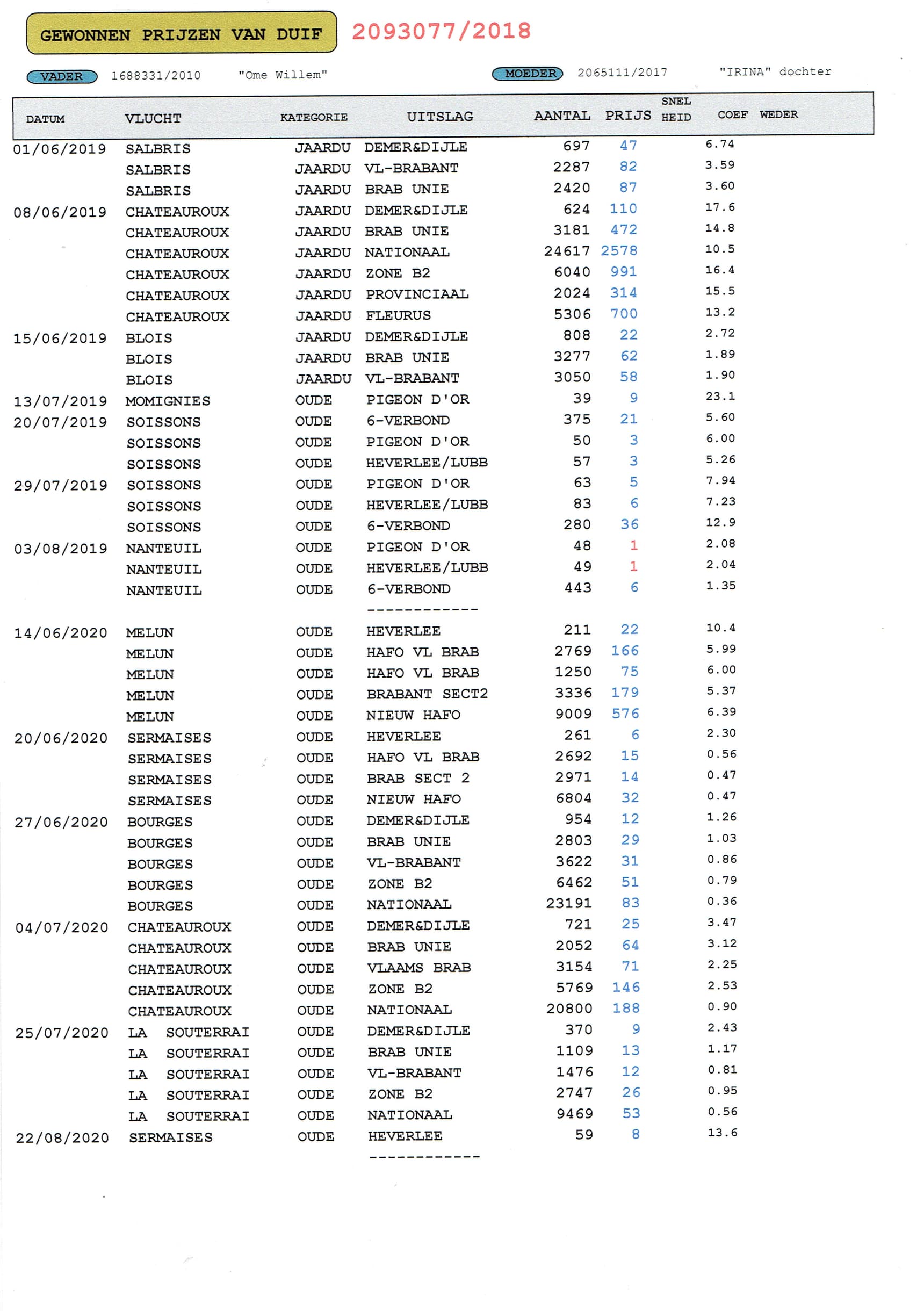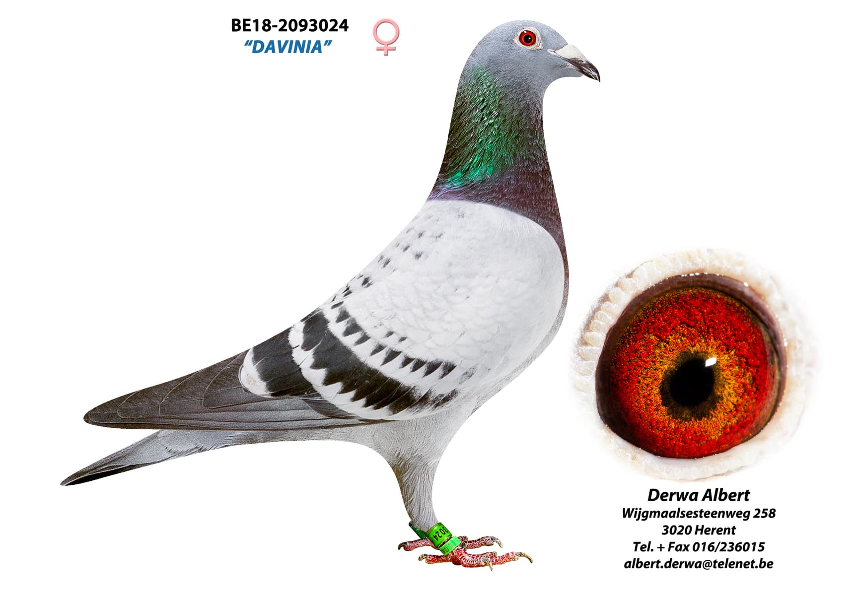 我不再介绍上面的这几羽鸽子了, 每个人都熟知它们,也知道它们的成就。从超级赛将到超级育种鸽,迄今为止,它们无论在自己的鸽舍还是为其他鸽舍,都同样取得了很大的成功。这些鸽仍然是阿尔伯特(Albert)育种鸽舍的根基,不过他愿意偶尔引入一些新血液。这就是他有机会与杨·胡曼斯(Jan Hooymans)共同作育的原因。杨非常喜欢‘宝琳(Paulien)’,询问是否她可以和他的 "哈利" 配对,接下来的事情就顺理成章了。此外,坤·明德豪(Koen Minderhout)的世界铭鸽'黄眼'也找来了,所以您可以在鸽舍找到一些 "哈利"和‘黄眼’的代表,这些合作非常成功!最新的成功案例之一是“黄眼直子”X“哈利直女” 再加上一些德瓦血系作出的一羽鸽,起名叫 ‘达维尼亚(Davinia)’ (BE18-2093024) ,上个赛季获得: