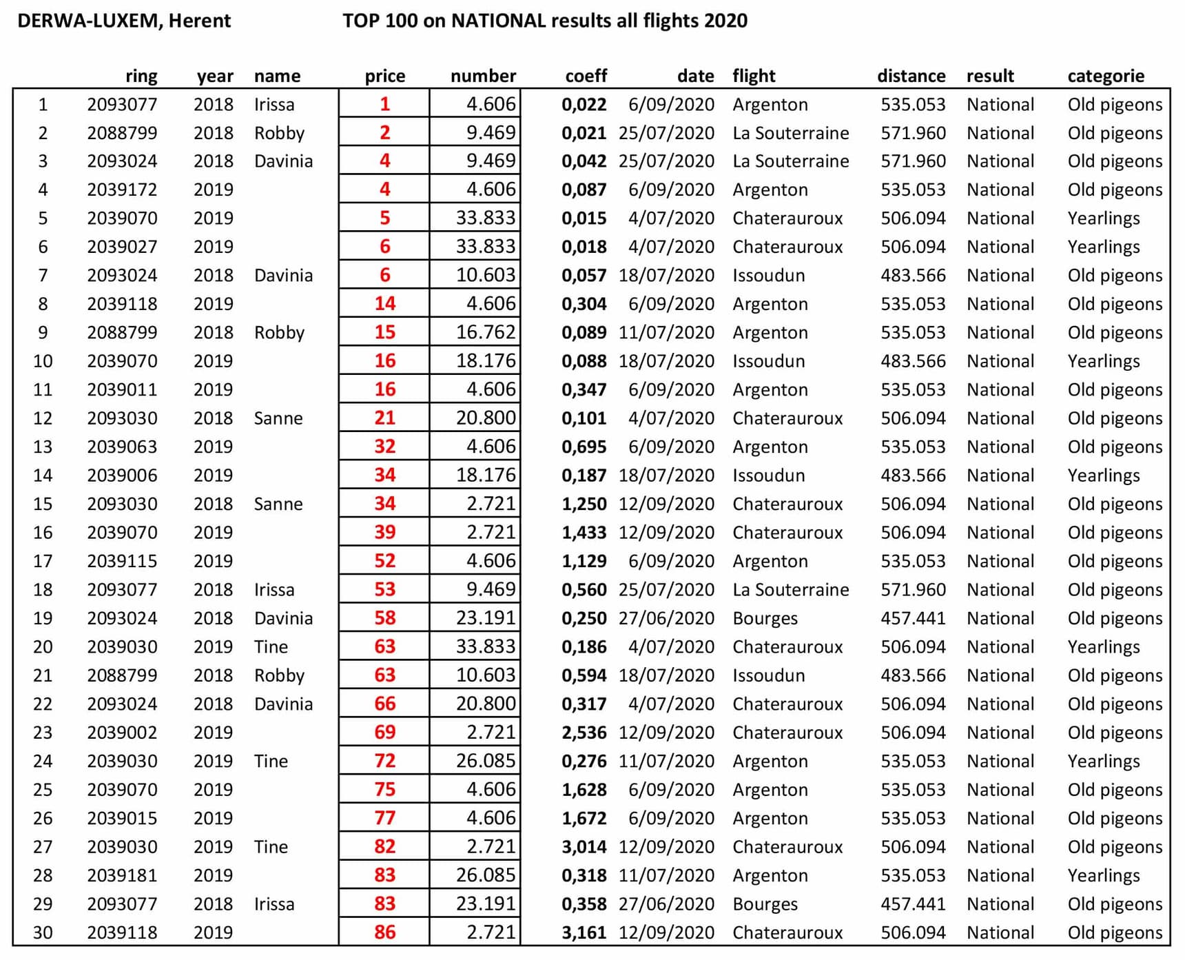 2020 阿尔伯特·德瓦(albert derwa, herent),2020年kbdb中长距离老鸽& 一岁鸽最佳鸽舍全国1位