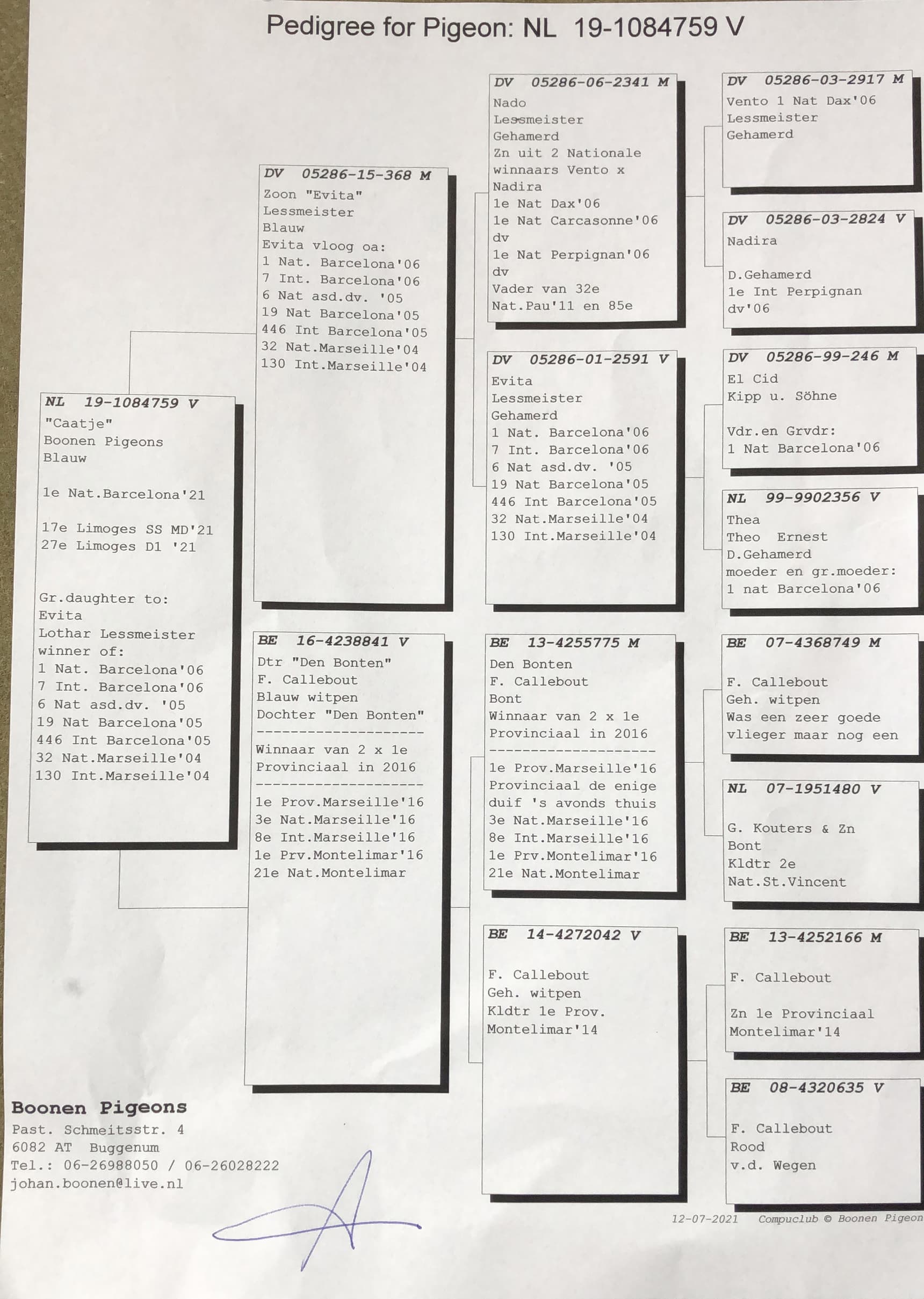 With huge team the brother Boonen went to Barcelona. Johan got to the start with 33 pigeons and Johan with 32 pigeons. The 33 were divided in 11 widow cocks, 3 nest cocks and 19 nest hens. And the national gold was won by the 2-year old nest hen NL19-1084759 who got the name ‘Caatje’ after her victory. And this is named after the wife of Johan who is called Carin but Johan calls her a lot of the time ‘Caatje’ as well. The hen left on youngsters that were 2 to 3 days old to Barcelona and her last race this year was Limoges and also on that race she had prize in the district namely 27th against 143 pigeons while this wasn’t a provincial prize anymore. Coincidence or not, on Limoges she left as 1st signed. After that Limoges they tossed the pigeons a lot. Sometimes 3 times in the weekends and this on Fridays, Saturdays and Sundays and the nest pigeons always went along. The most far releasing point was Sankt Vith that is situated in the Belgian province of Liege close to Luxembourg and Germany. They wanted to keep on that Eastern line keeping in mind the races out of Marseille, Barcelona and Narbonne. The pedigree from ‘Caatje’ is a surprise. Her father was a cock from 2015 who was bought from Lothar Lessmeister out of the German city Hütschenhausen. He is a son ‘Evita’ who won in 2016 the 1st National Barcelona in Germany and that was good for a 7th prize on an international level. This ‘Evita’ was bred out of a pigeon from Kipp and son and a pigeon from Theo Ernest from Halsteren. In 2016 Lothar Lessmeister won the 1st international Barcelona and the winner of this race was 6 years old and her father was a brother to ‘Evita’. This Lessmeister-cock isn’t in possession of Johan and Wil anymore as not that long ago they decided to sell him via the site of Herbots. At a certain moment choices have to be made and the breeding team can’t keep on growing. The mother to ‘Caatje’ is also from foreign offspring and she comes from Francois Callebaut out of the Belgian city Meldert (positioned between Lummen and Diest). They got into contact with this fancier due to a taken in pigeon. Francois Callebout caught a youngster from Johan and called for it. As thanks the brothers gave him a couple of eggs. And a bit later gave Francois Callebaut them a youngster out of his best long distance pigeon from his loft namely ‘de Bonten’ who raced in 2016 really early out of Marseille an Montélimar. And the mother to ‘Caatje’ is from the year that her father raced really early prizes. And this hen is still on the breeding loft in Buggenum. Striking enough Johan didn’t had any idea anymore where Francois lived.