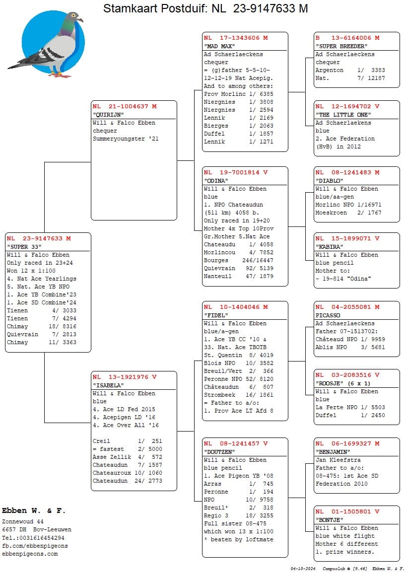 虽然不是“莱纳斯”的直接后代,但绝对值得介绍的是“超级33”(NL23-9147633),他的祖母是“莱纳斯”的半姐妹。作为一羽幼鸽,已经是艾本(Ebben) 联盟的超级战将,8 次参赛 5 次前 1/100,获得 NPO 全国幼鸽鸽王 5 位。在2023年,没有多少更好的幼鸽参赛,因此“超级33”这个名字完全契合它的表现。但他似乎没尽全力,仍然前程似锦、前途无量,尽管2024 年天气多变,高位入赏也接踵而至。如果比赛天气正常,那么“超级33”会处于领先地位,是令人心动的实力王牌。不少于 7 次前1/100 次进入他的记录中。连续两年不凡的表现,这使他跻身于最优秀鸽之列,翔绩不会说谎。