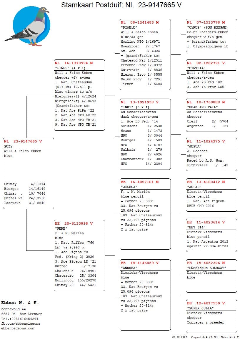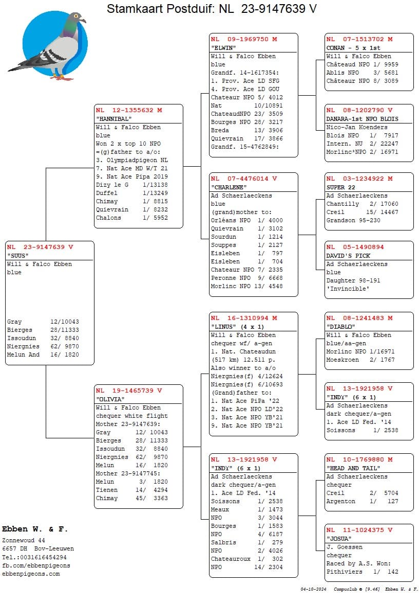 - ‘Suzy’ (nest sister ‘Salvador’), won five prizes 1:100 in 2024 including 4th Chimay 11,374 pigeons, 10th Chimay 7,646 pigeons, 14th Bierges 16,149 pigeons, 24th Duffel 13,910 pigeons, 31st Issoudun 8,840 pigeons and so on.