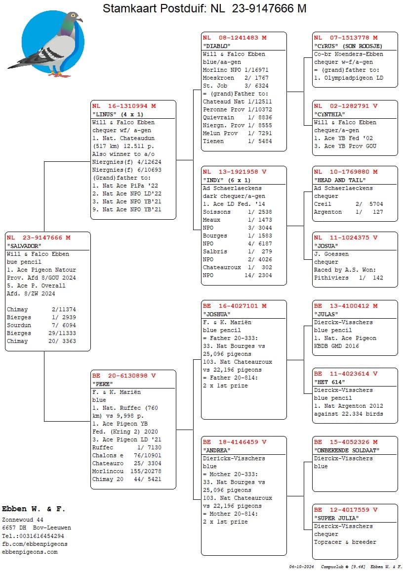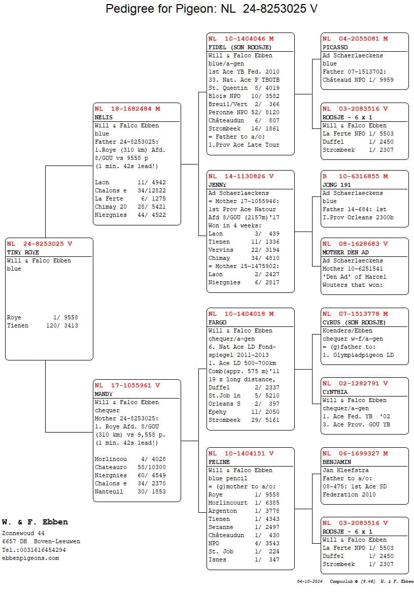 - 超级鸽 ‘飞姆雌’ (阿德里·范德林登)之母是艾本(Ebben)原舍血系。‘飞姆雌’ 荣获:索利厄全国(630公里)6,218羽冠军、道夫尔全省(243公里)13,945羽冠军、NPO朗格尔(549公里)5,039羽亚军、NPO莫林科(439公里)6,957羽4位等。