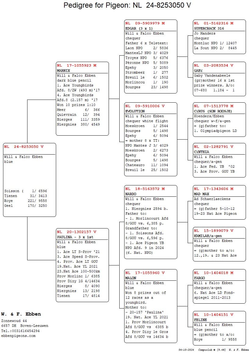 2周后,NL24/8253050脱颖而出,独占鳌头,她是“马尼克斯”(Marnix)X “宝琳娜”(Paulina)直女。“宝琳娜”(Paulina)获得摩林科全省6385羽冠军。 “小玫瑰”的血系再一次占据了至高无上的地位。她的 DNA 在她的血统书中出现了 3 次。这一配对也作出了是法兰斯·斯特里克(Frans Strikker) 的第 9 区幼鸽鸽王1位。 这是一对新的奇迹配对吗?“小罗伊”以1分42秒的优势获胜,而050在苏瓦松的6596羽赛鸽中脱颖而出,领先近2分钟,飞行距离为312公里。赢后再取胜,正日益成为艾本(Ebben)鸽舍的标志。