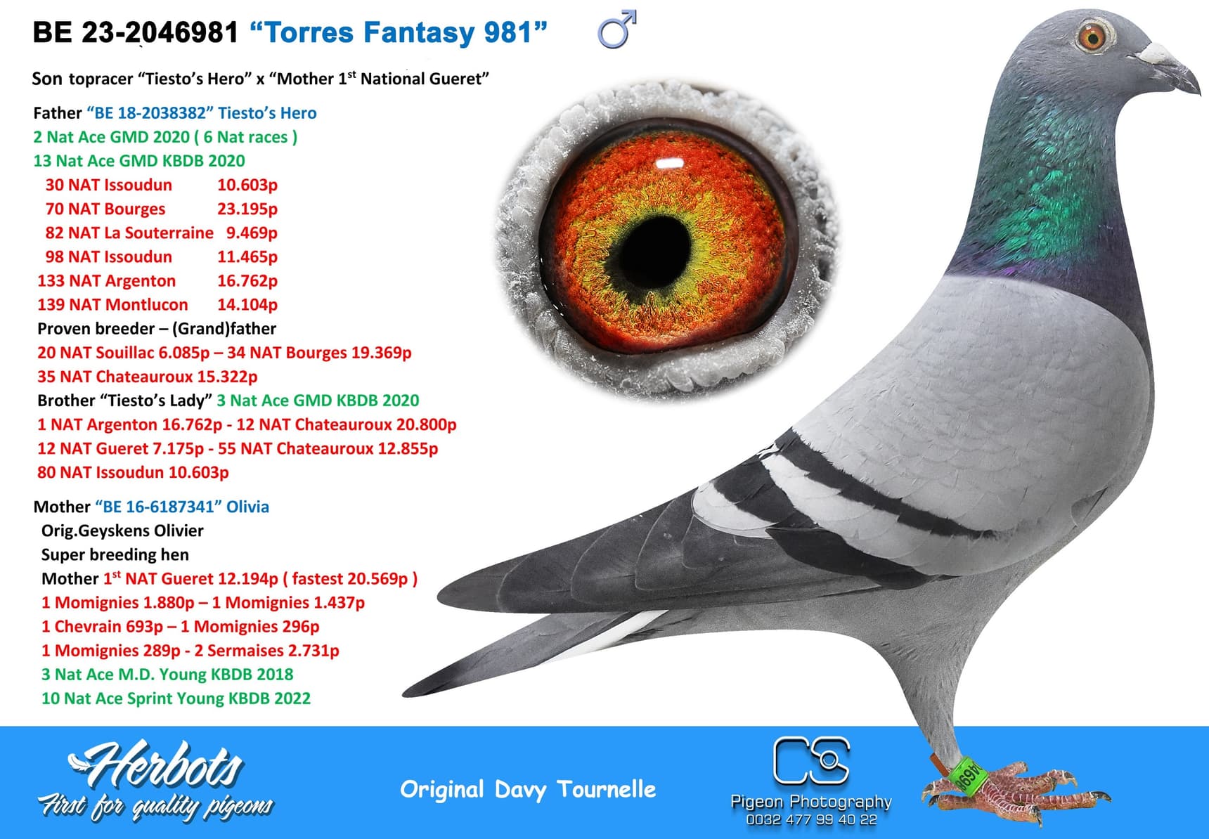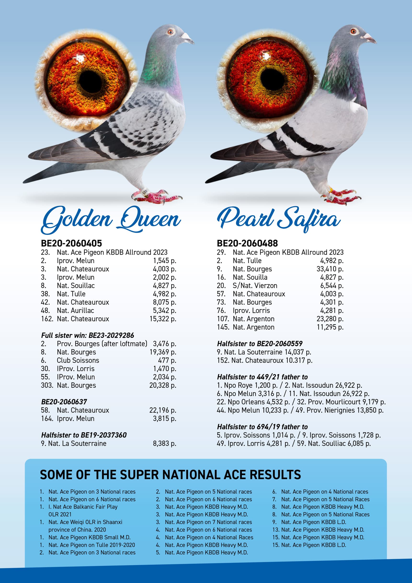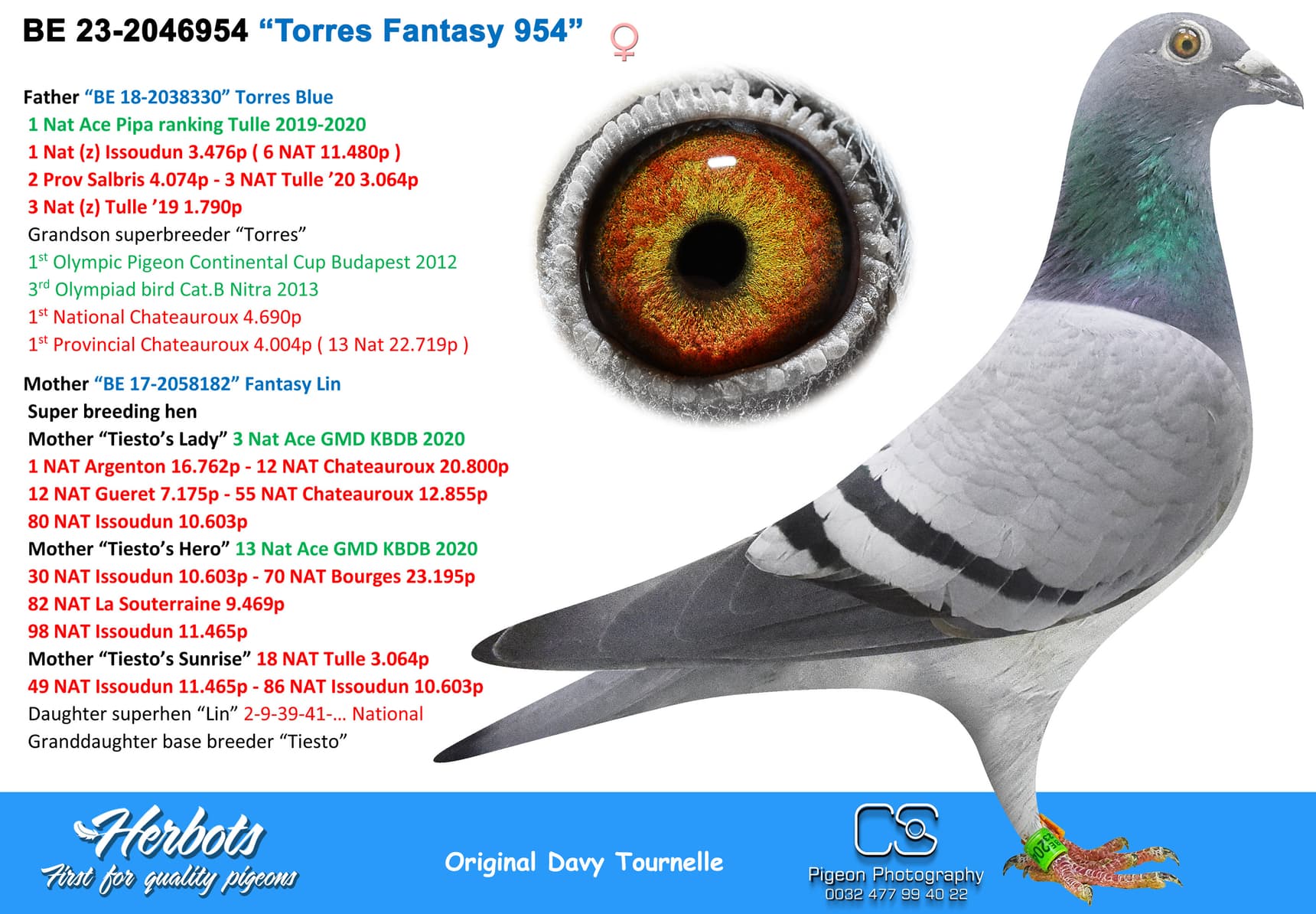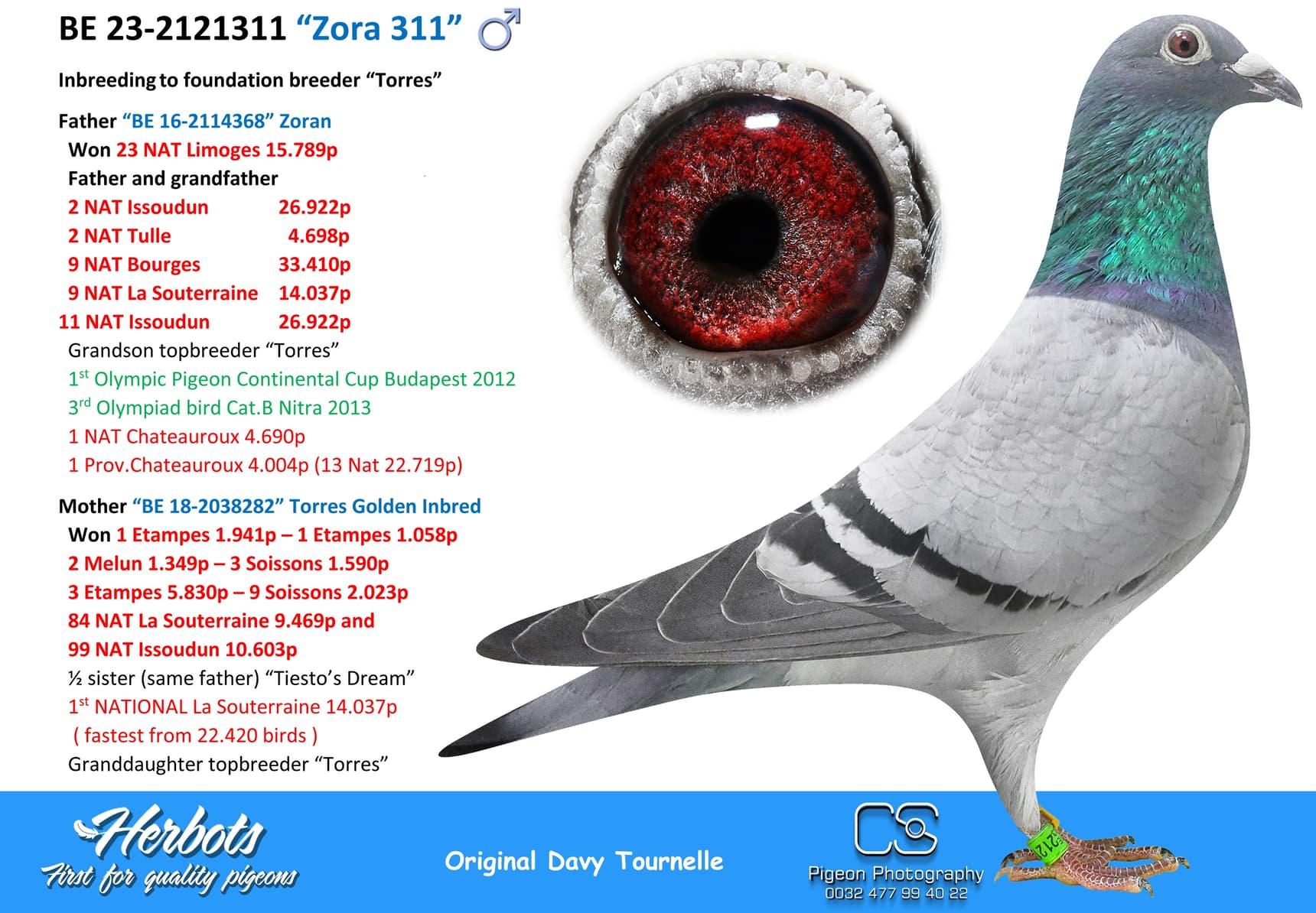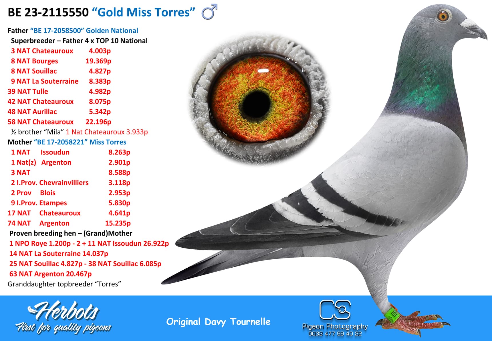 BE 17-2058221 “Miss Torres” won in her own career 1st National Issoudun 8,248p – 3rd National Argenton 8,588p – 2 I.Prov.Chevrain 3,118p – 2 Prov Blois 2,953p – 9 I.Prov.Etampes 5,830p – 17 Nat Chateauroux 4,641p – 74 Nat Argenton 15,235p