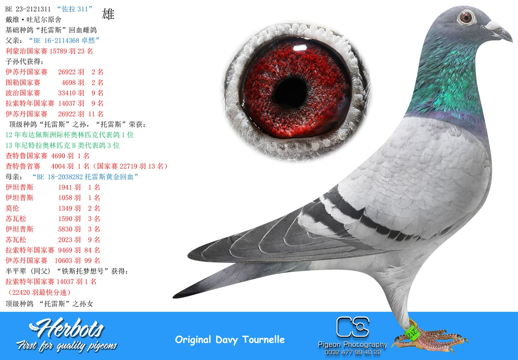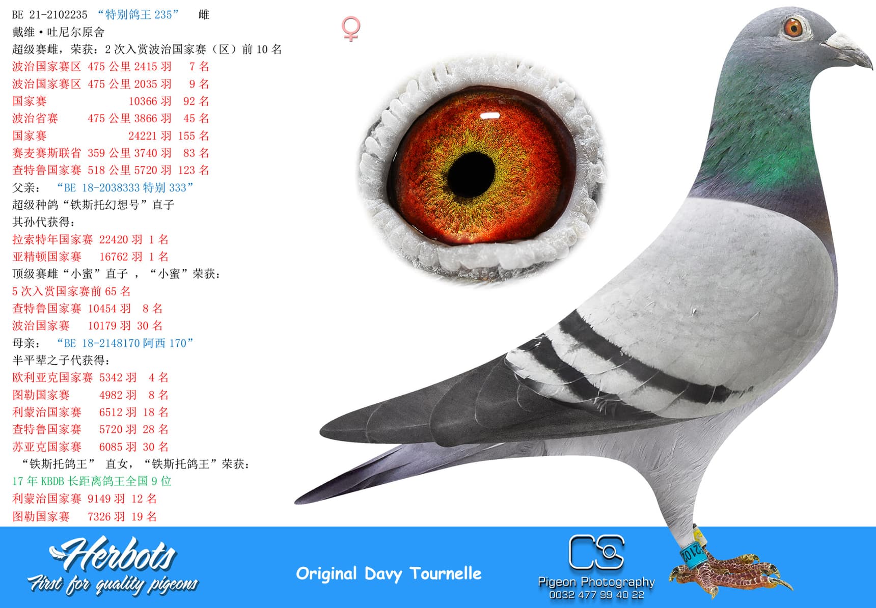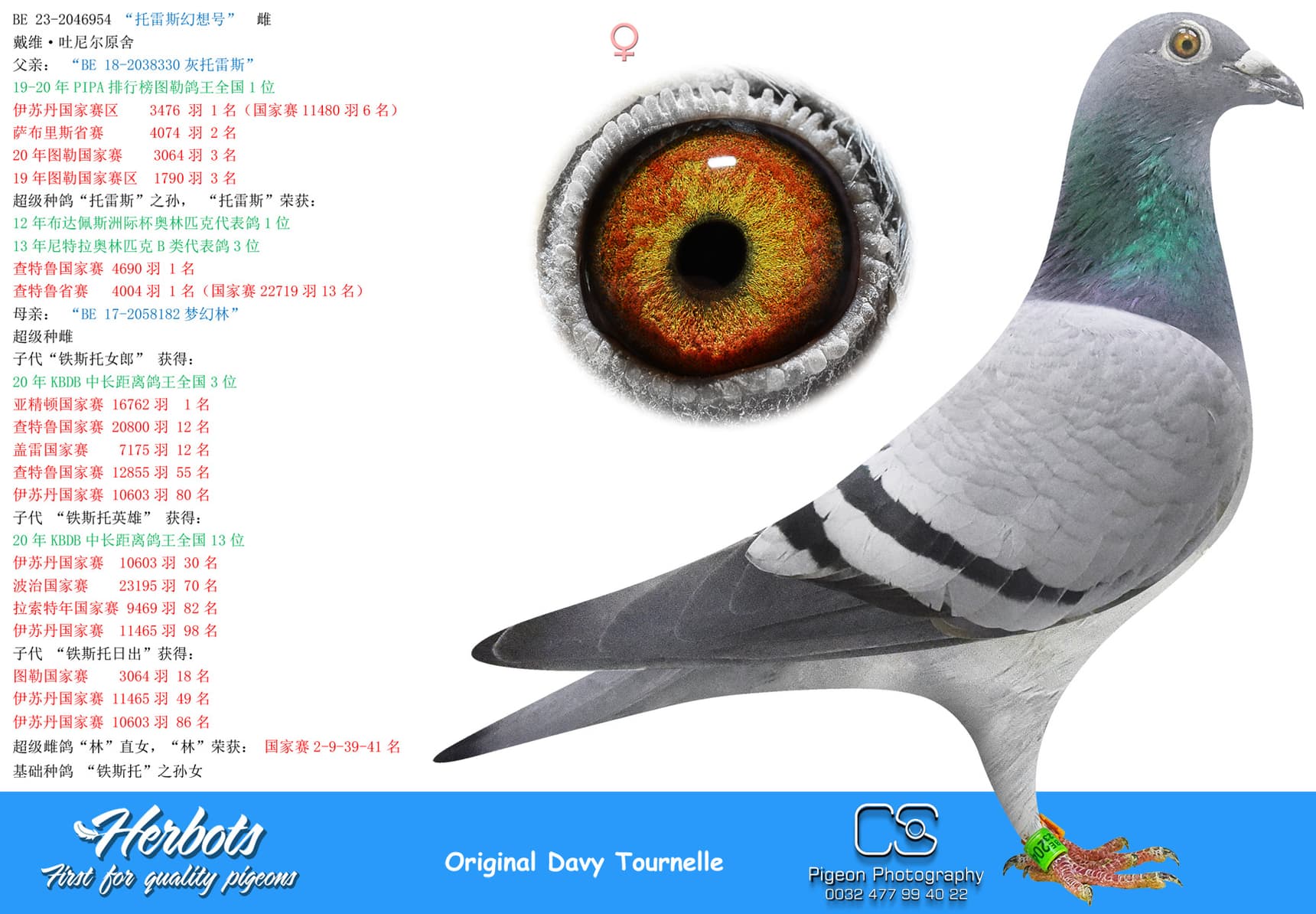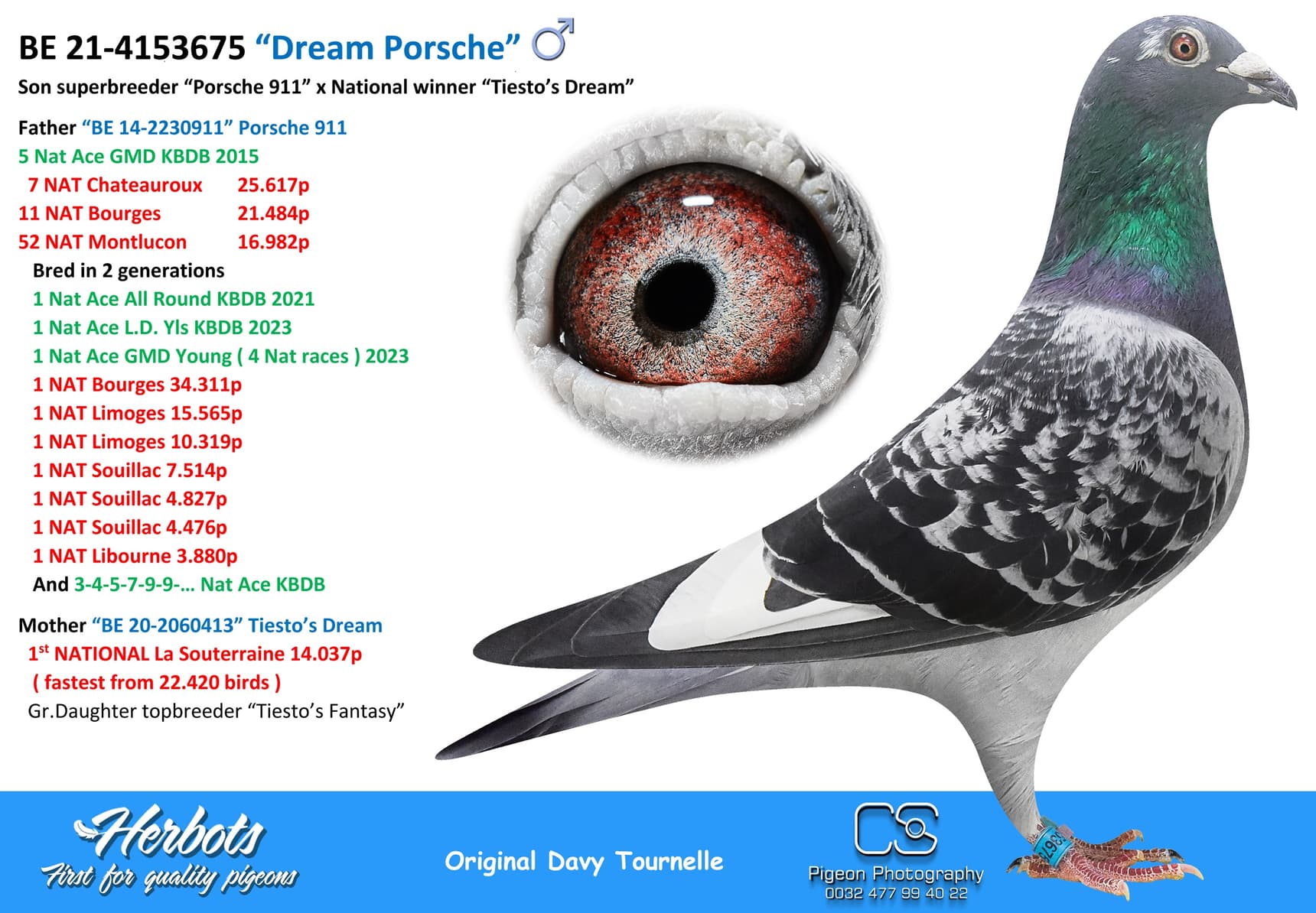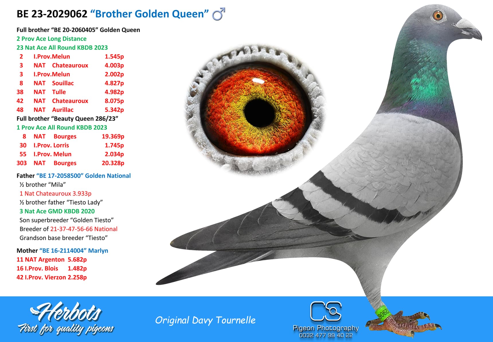 BE 17-2058221 “Miss Torres” won in her own career 1st National Issoudun 8,248p – 3rd National Argenton 8,588p – 2 I.Prov.Chevrain 3,118p – 2 Prov Blois 2,953p – 9 I.Prov.Etampes 5,830p – 17 Nat Chateauroux 4,641p – 74 Nat Argenton 15,235p