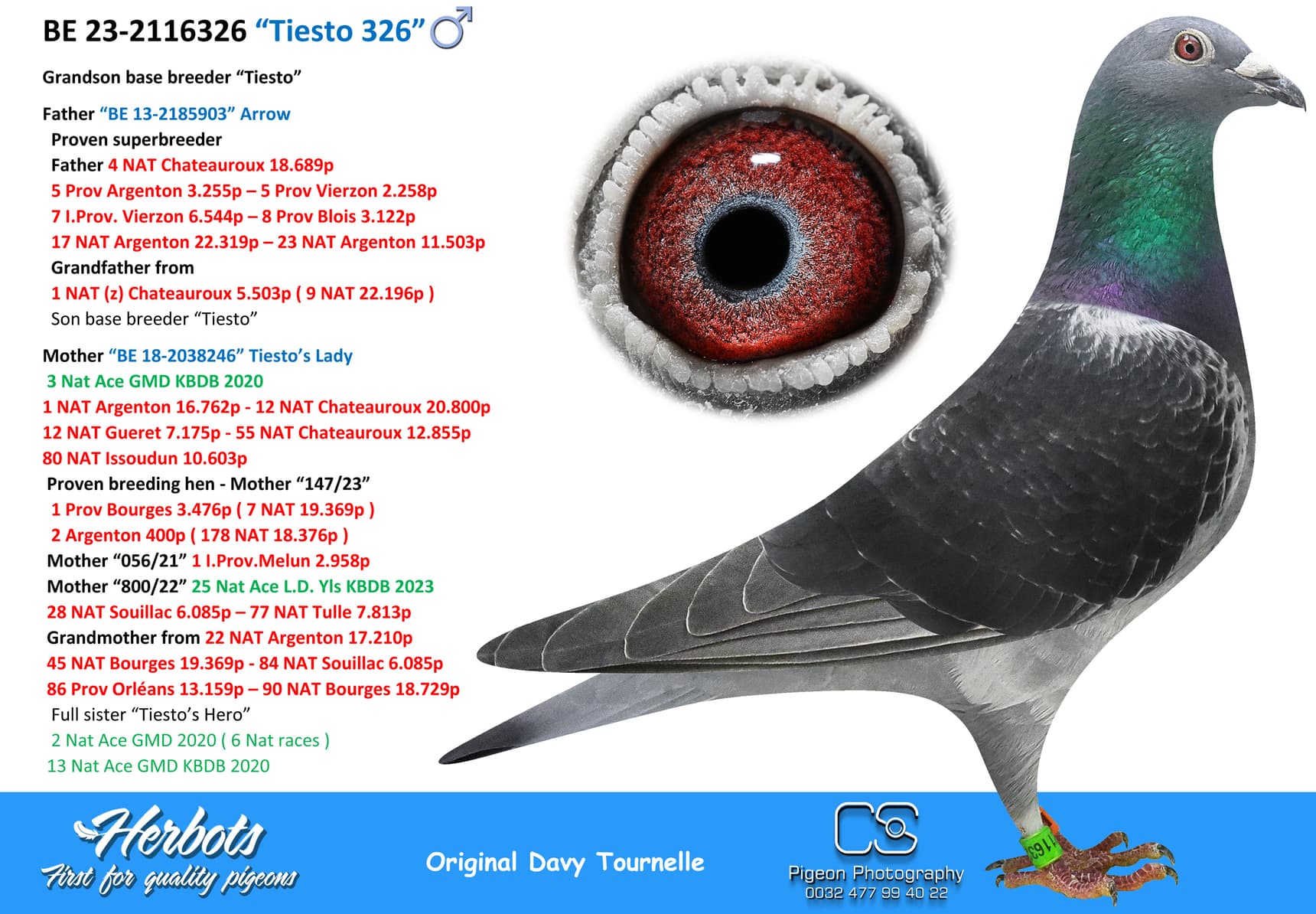 This cock is a son of top racer "Tiesto's Hero" who became 2nd National Ace Pigeon heavy middle distance over 6 KBDB races in 2020 and is father of 3 x TOP 40 National.