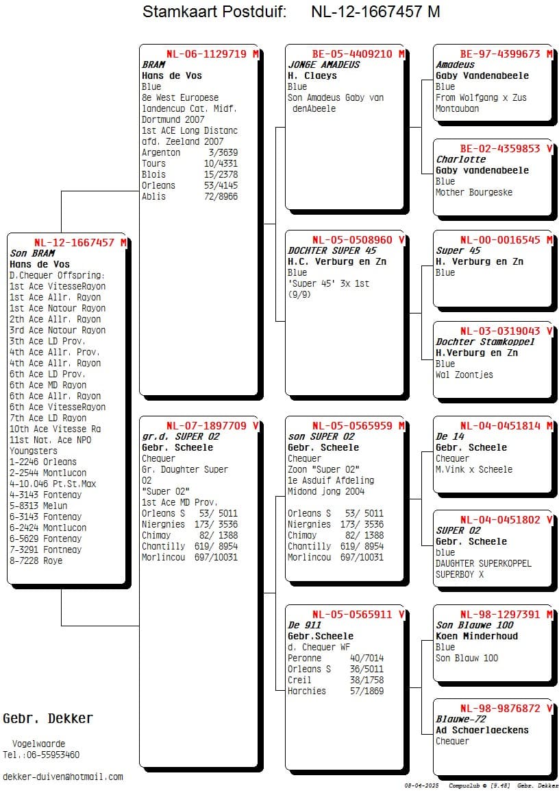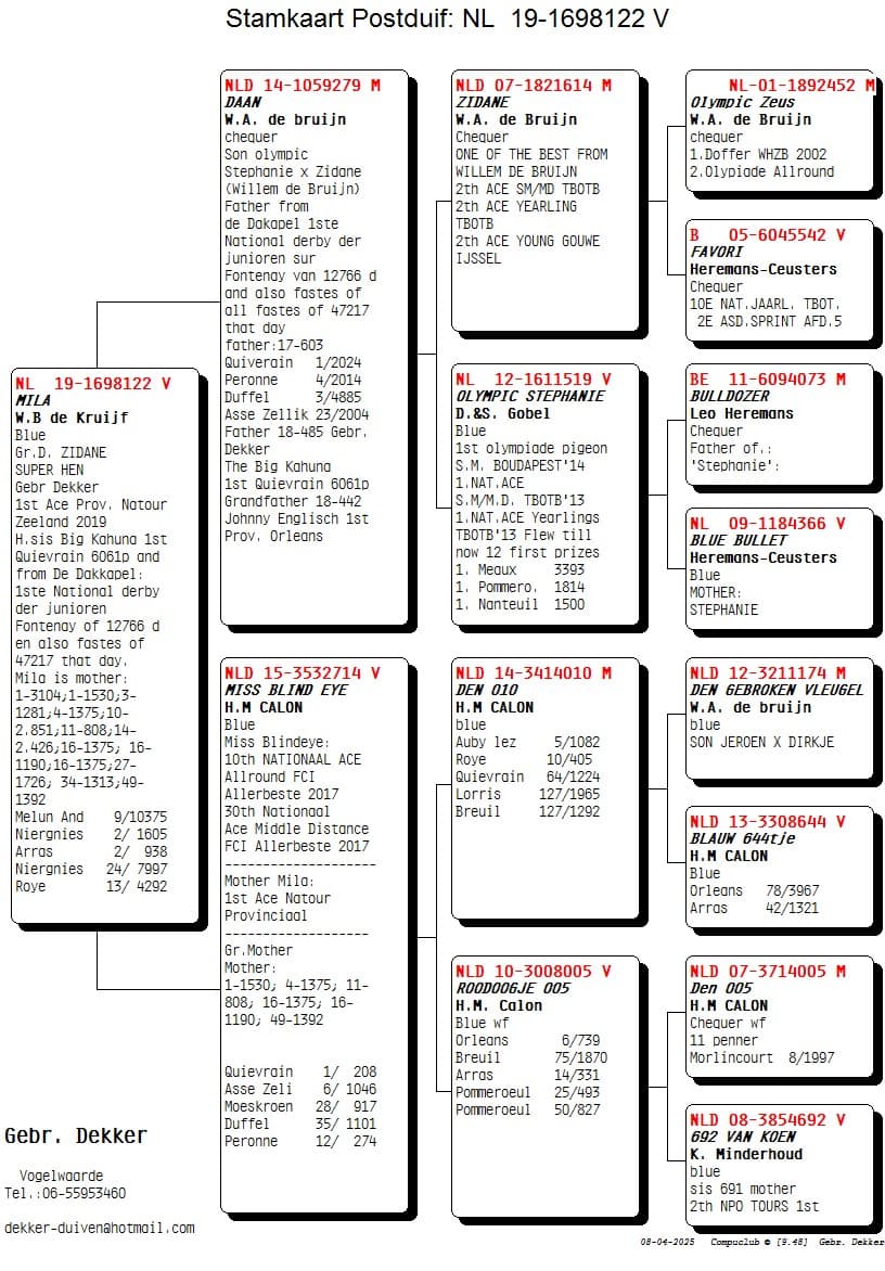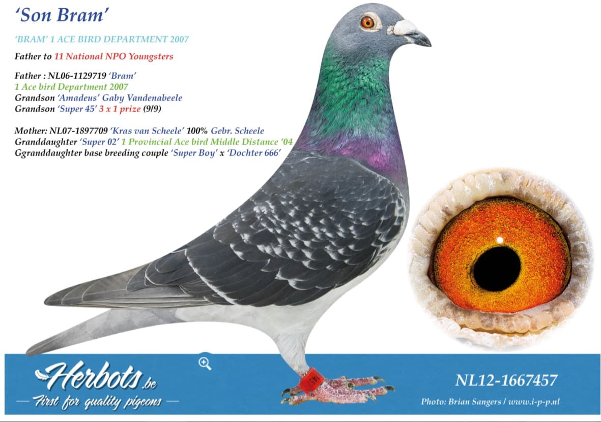 The basis of their colony was laid with pigeons from Tonny de Bruijn and Gebr. Scheele, whose lineage still runs through their current colony. In their search for reinforcement especially the contribution of Buck and Martijn de Kruijf became of great value. Also successful long-distance pigeons came from Maurice Noordam and Henk Zegers. In recent years further investments were made in pigeons from Gerard Koopman, especially from lines of national winners and Olympiad pigeons. The first results of this are very promising, including a 4th and 5th provincial ace Marathon pigeon and 6th national on Tarbes. They bought their progenitor through the Herbots family at an auction of Danny de Voogd's program pigeons. Son Bram has a pedigree to make your mouth water. Father is Bram ( 1st Provincial Ace Pigeon Dagfond 2007) of Hans Vos . Mother of son Bram is a grandchild of stock pigeon “Super 02” of Gebr. Scheele.