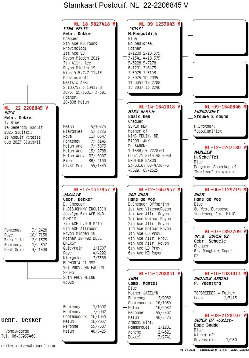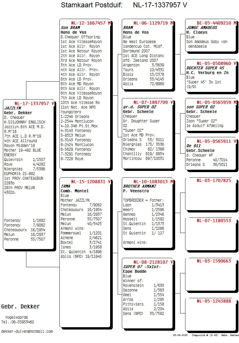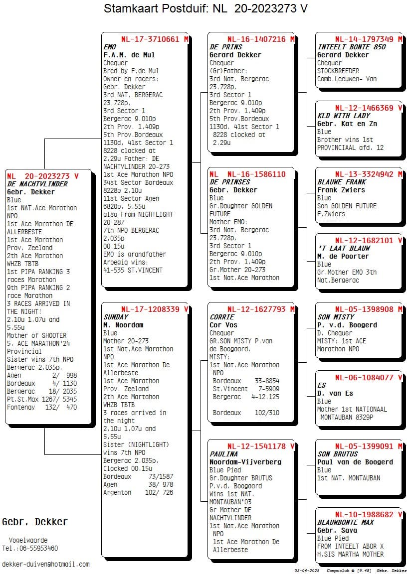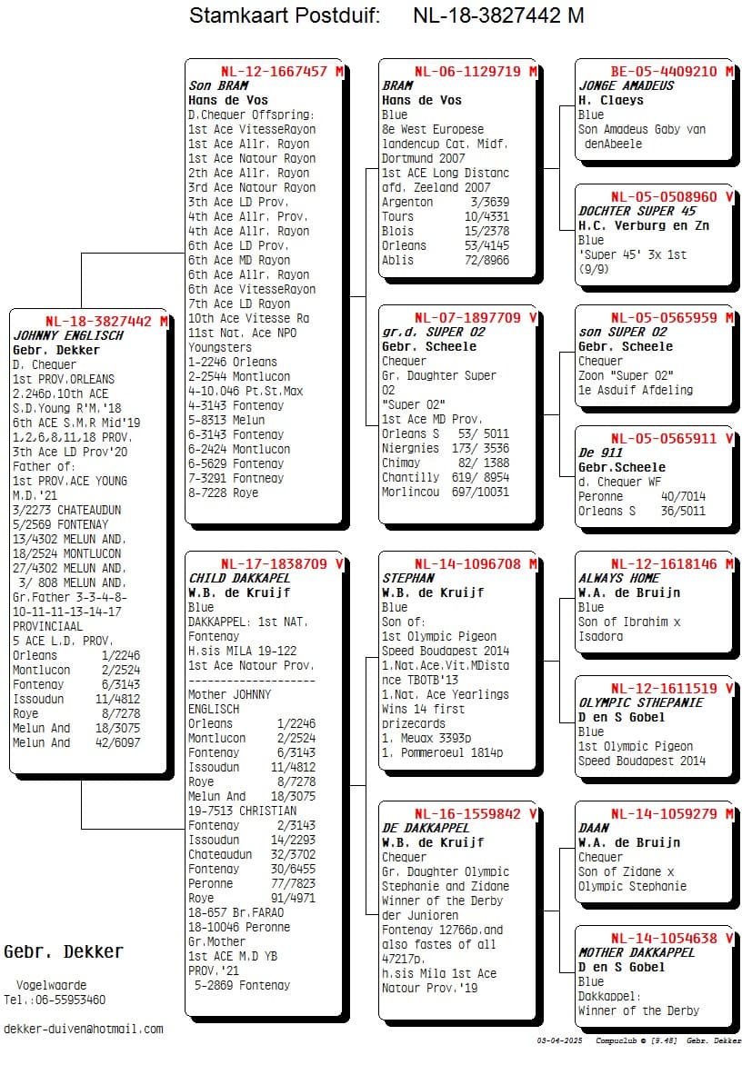 The basis of their colony was laid with pigeons from Tonny de Bruijn and Gebr. Scheele, whose lineage still runs through their current colony. In their search for reinforcement especially the contribution of Buck and Martijn de Kruijf became of great value. Also successful long-distance pigeons came from Maurice Noordam and Henk Zegers. In recent years further investments were made in pigeons from Gerard Koopman, especially from lines of national winners and Olympiad pigeons. The first results of this are very promising, including a 4th and 5th provincial ace Marathon pigeon and 6th national on Tarbes. They bought their progenitor through the Herbots family at an auction of Danny de Voogd's program pigeons. Son Bram has a pedigree to make your mouth water. Father is Bram ( 1st Provincial Ace Pigeon Dagfond 2007) of Hans Vos . Mother of son Bram is a grandchild of stock pigeon “Super 02” of Gebr. Scheele.