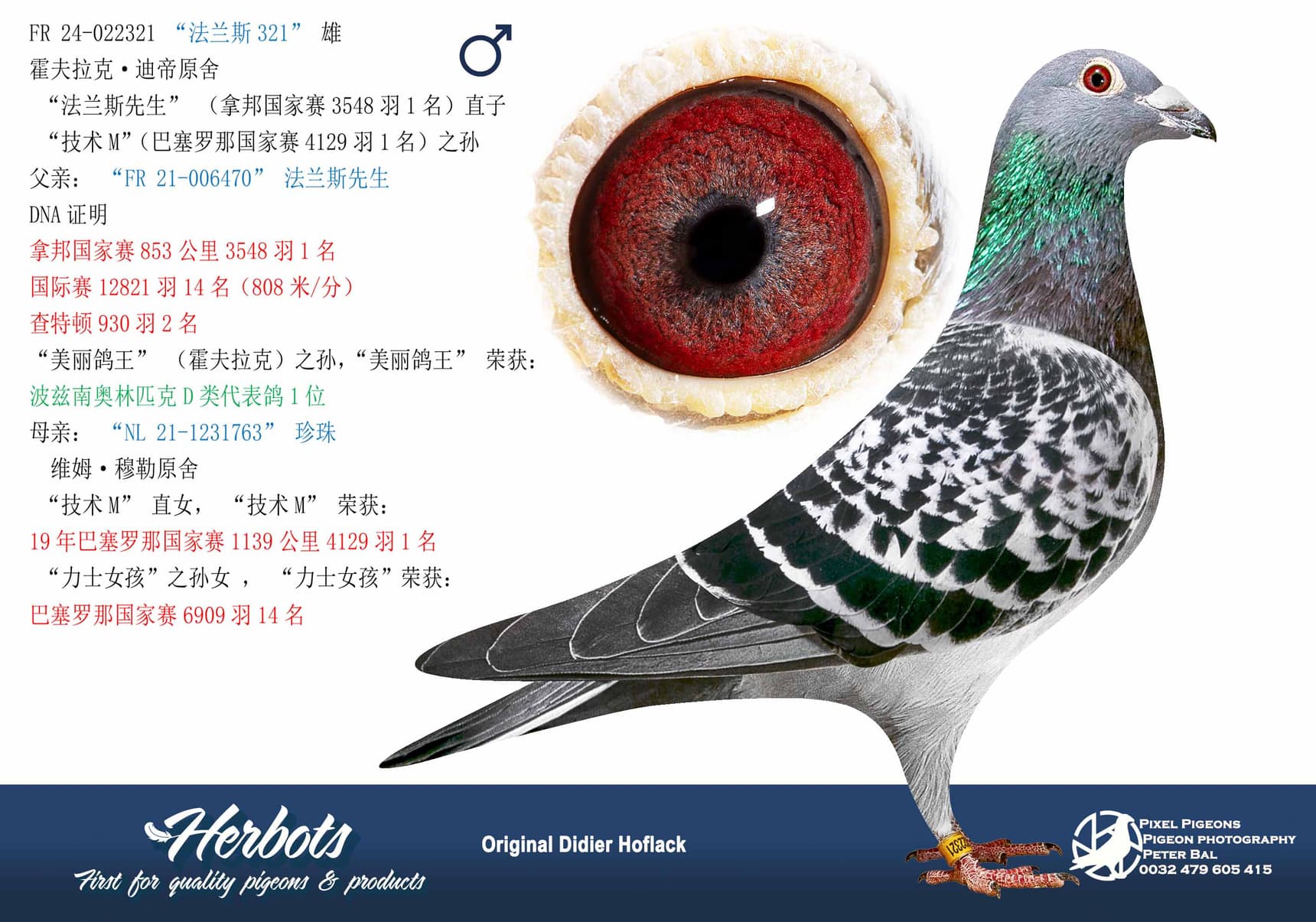 Son of “NL 547-20” Orange Oil Junior is a son of “Orange Oil” 1 Int.Nat Ace Pigeon Barcelona 2017-2019 x “FR 577-19” Won himself 11 Int.Nat (h) Barcelona 5,840p and 32 Int.Nat Barcelona 16,485p in 2021 ( Frans Bungeneers x Chris Hebberecht )