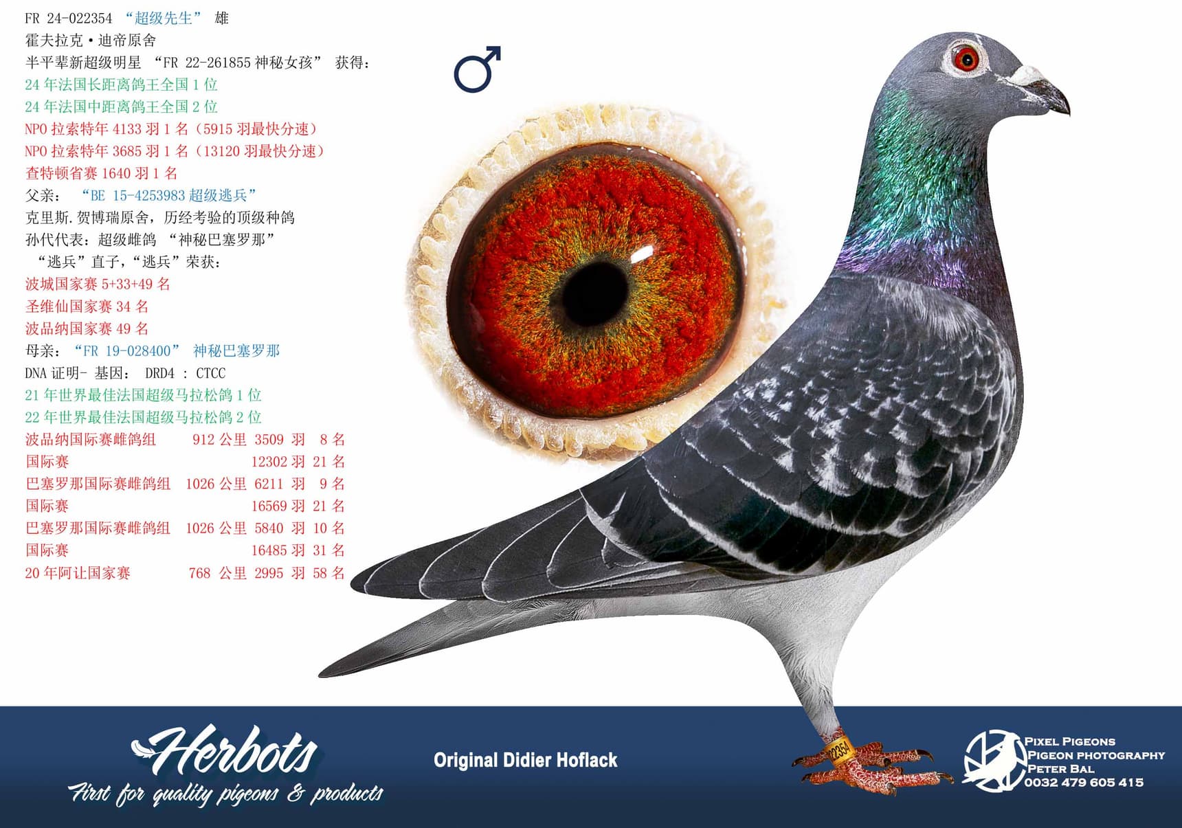 Also a son of “Misty Barcelona” 2 x 1st World Best Pigeon at the Super Marathon in 2021 and 2022.