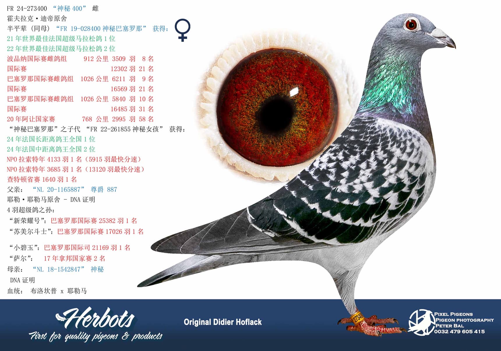 This is a half-sister of wonder hen “Misty Barcelona” 2 x 1st World Best Pigeon at the Super Marathon in 2021 and 2022.