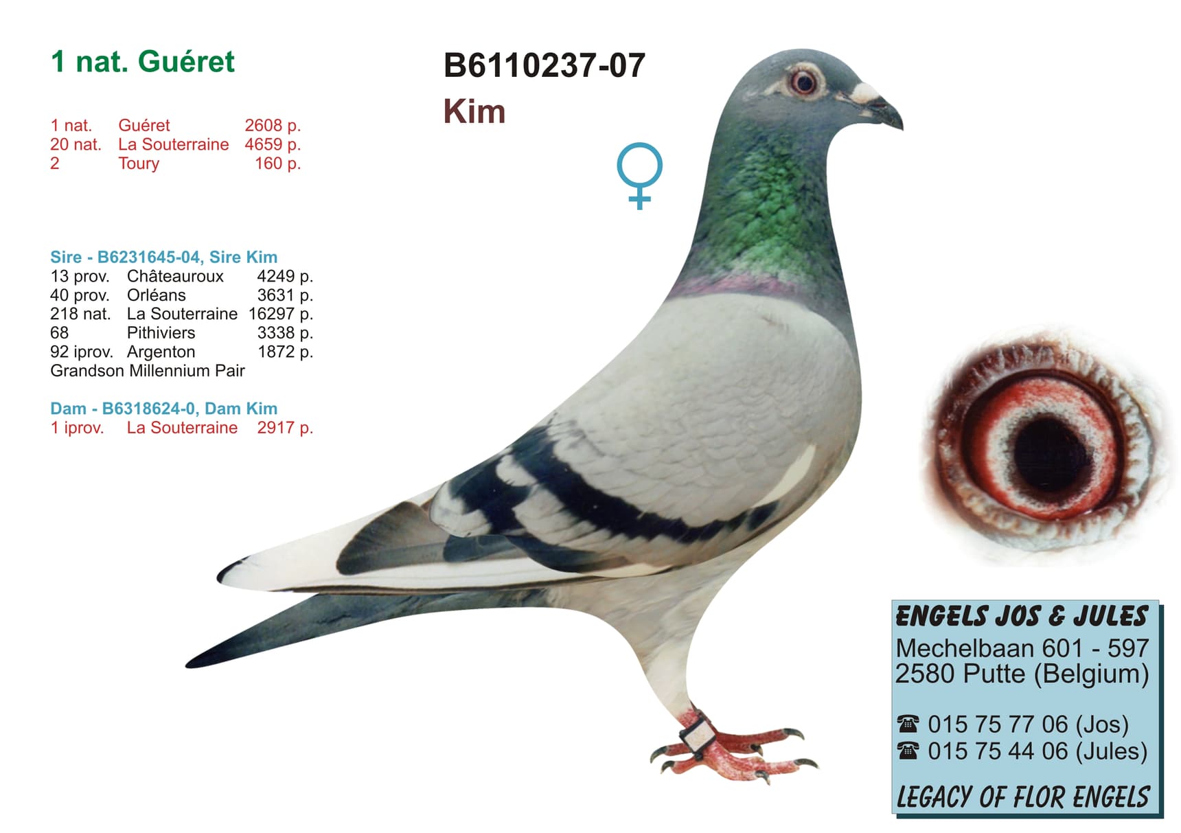 ‘Kim’ is an inbred to the Millennium couple and has on both sides the blood strain of ‘Marieke’. Her grandmother is a bought back Engels pigeon at Jef Van Winckel out of a brother and a sister from his 4 national Bourges.