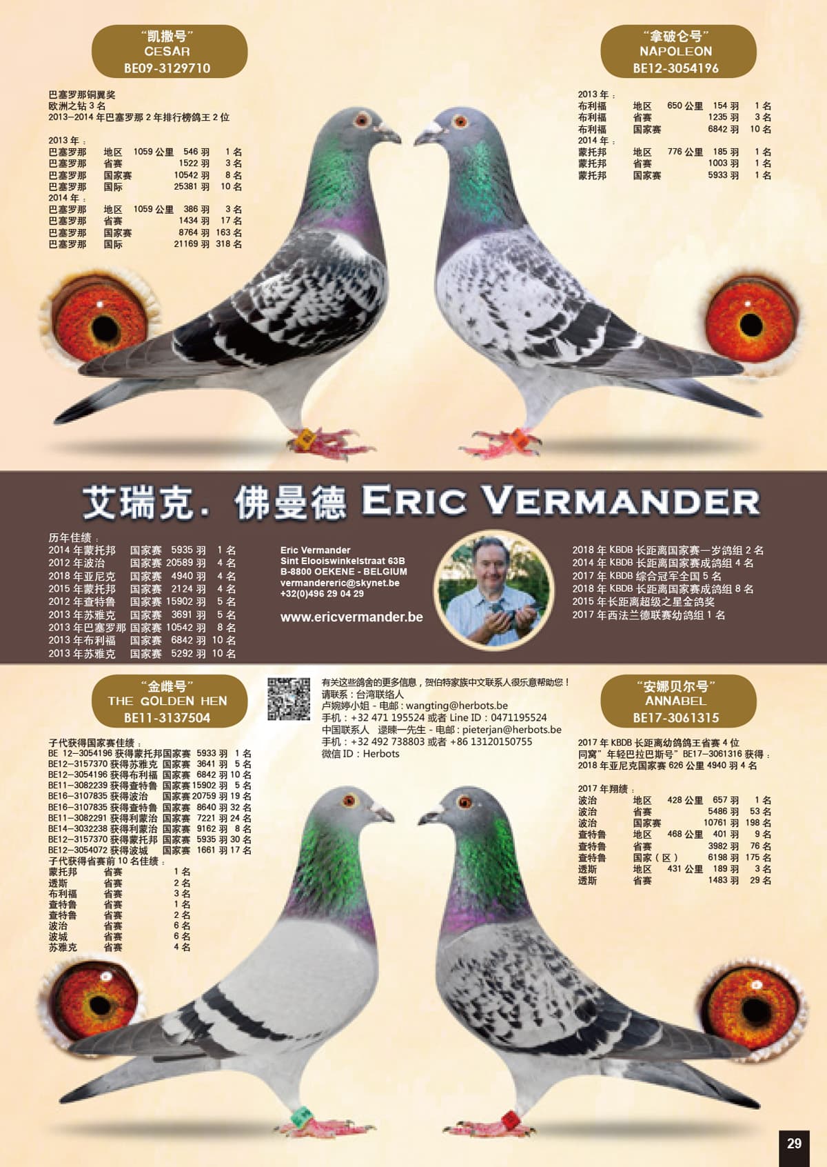 Het hoeft dan ook niet te verwonderen dat de duiven van Eric gegeerd zijn. Een kleine kolonie die met harde hand wordt geleid, waar een strenge selectie in de hand en in de korf wordt doorgevoerd, waar duiven allrounders moeten zijn en moeten presteren om hun plaats op het hok te behouden, geven aan veel andere hokken een boost in de kweek. Eric is een gepassioneerd duivenspeler, met een fijn oog voor de goede duif, een sterke analist en observator en dirigent die zijn ploeg tot sterke resultaten kan brengen. Hij dwingt met resultaten zijn plaats af op de nationale podia met een kleine ploeg duiven. Pure klasse !