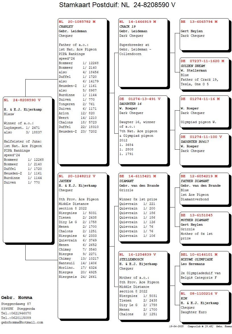The first two pigeons arrived simultaneously, shoulder to shoulder. First to arrive was the NL24-590: a direct Eijerkamp hen and half-sister of none other than ‘Juna’, the 1st National Acebird Shrews PIPA Rankings 2024. Shortly afterwards followed the NL22-785, a hen from Marco Zandvoort, half-sister to ‘Mazati Haas’, which already won a first prize in the department twice.