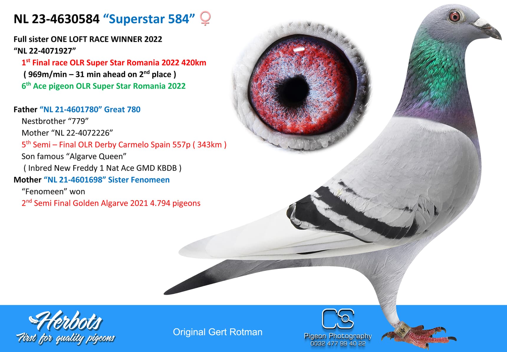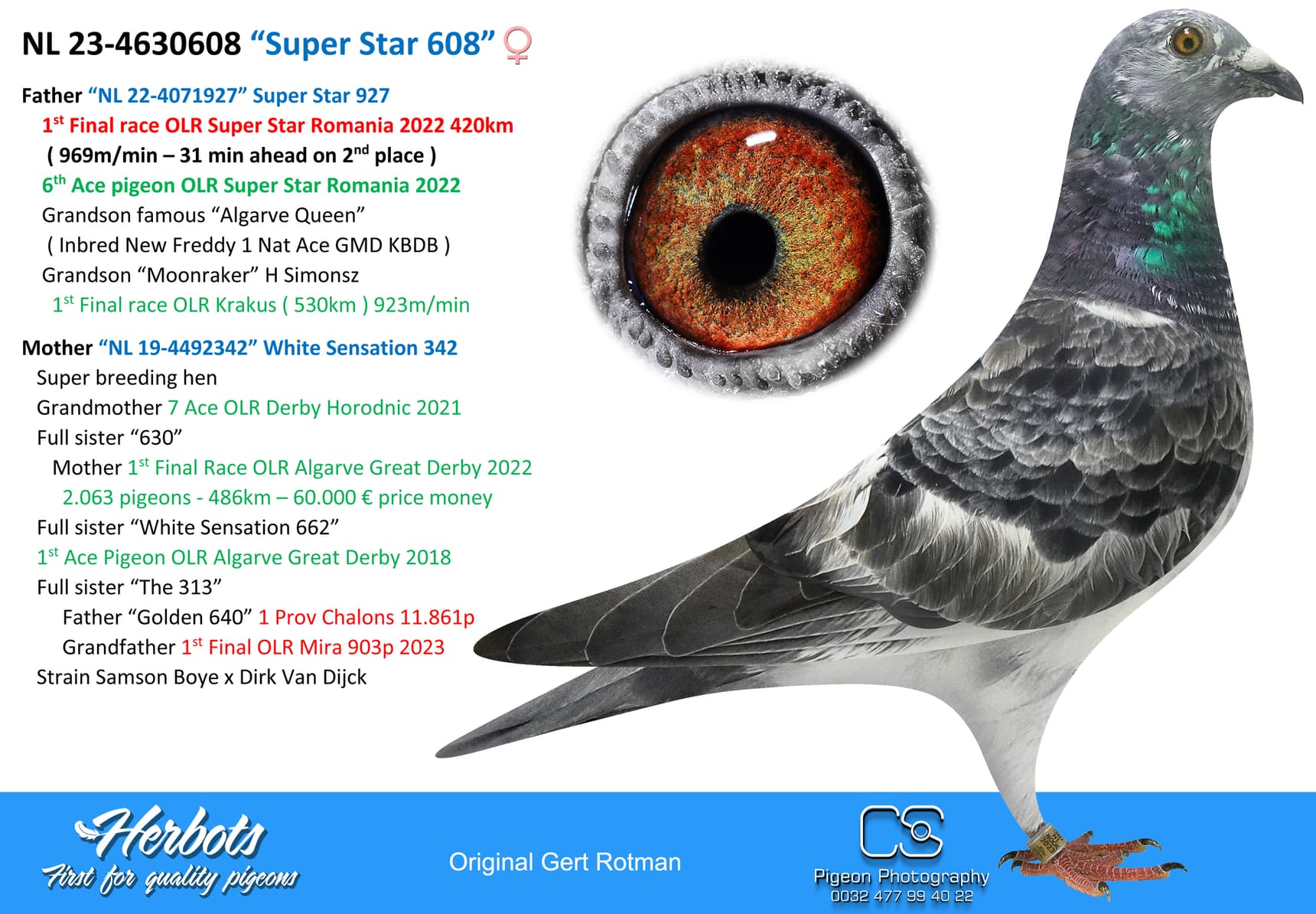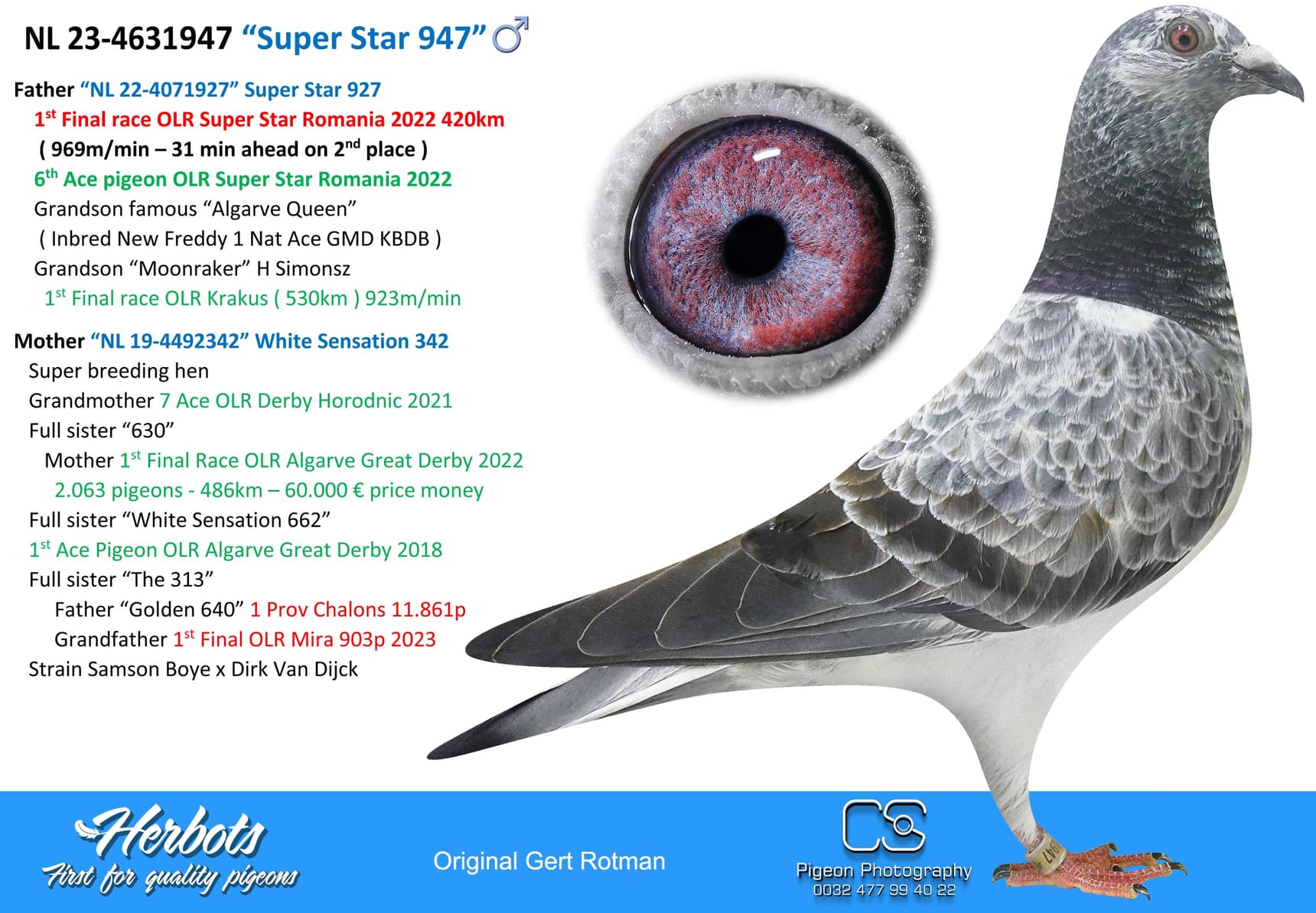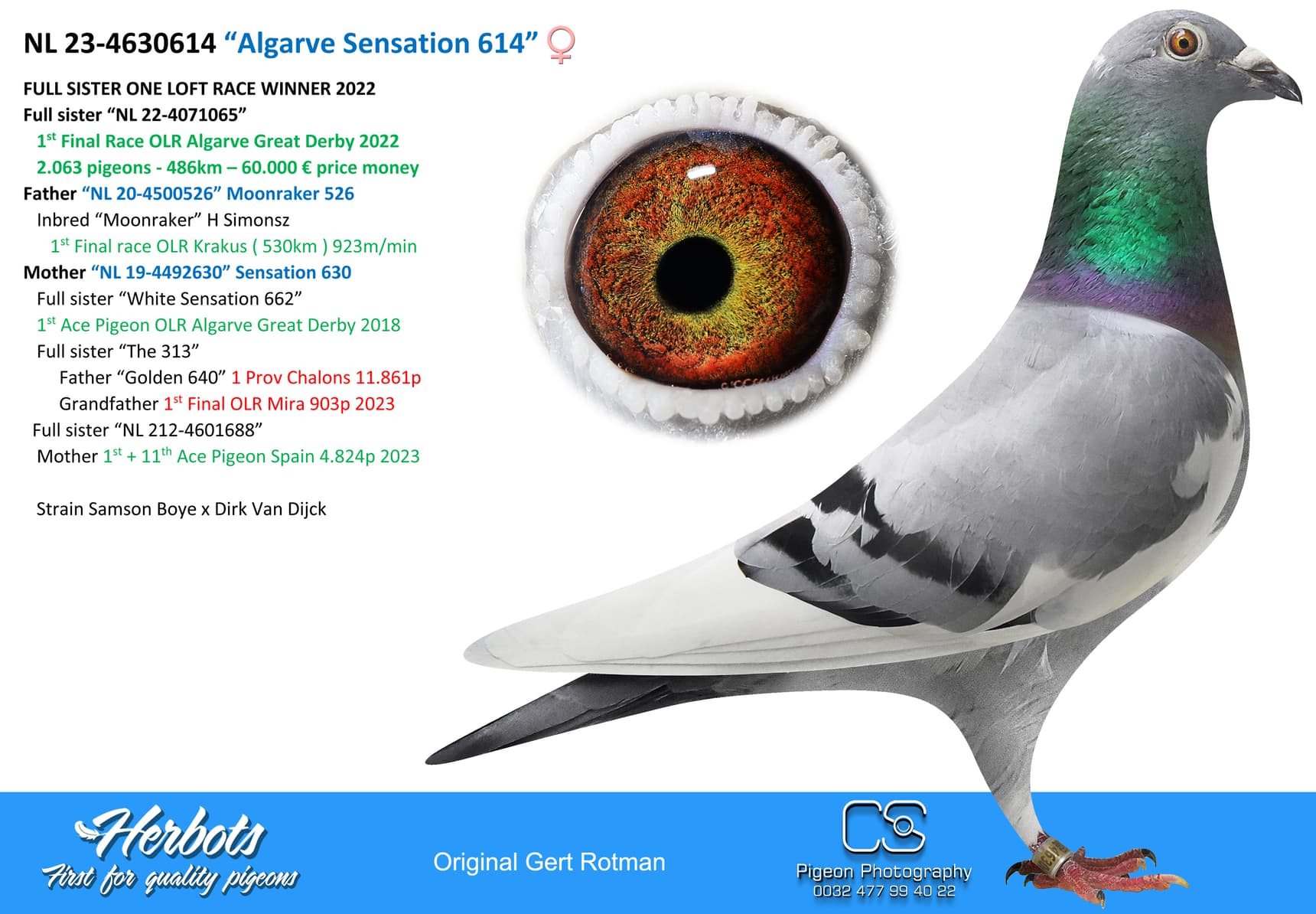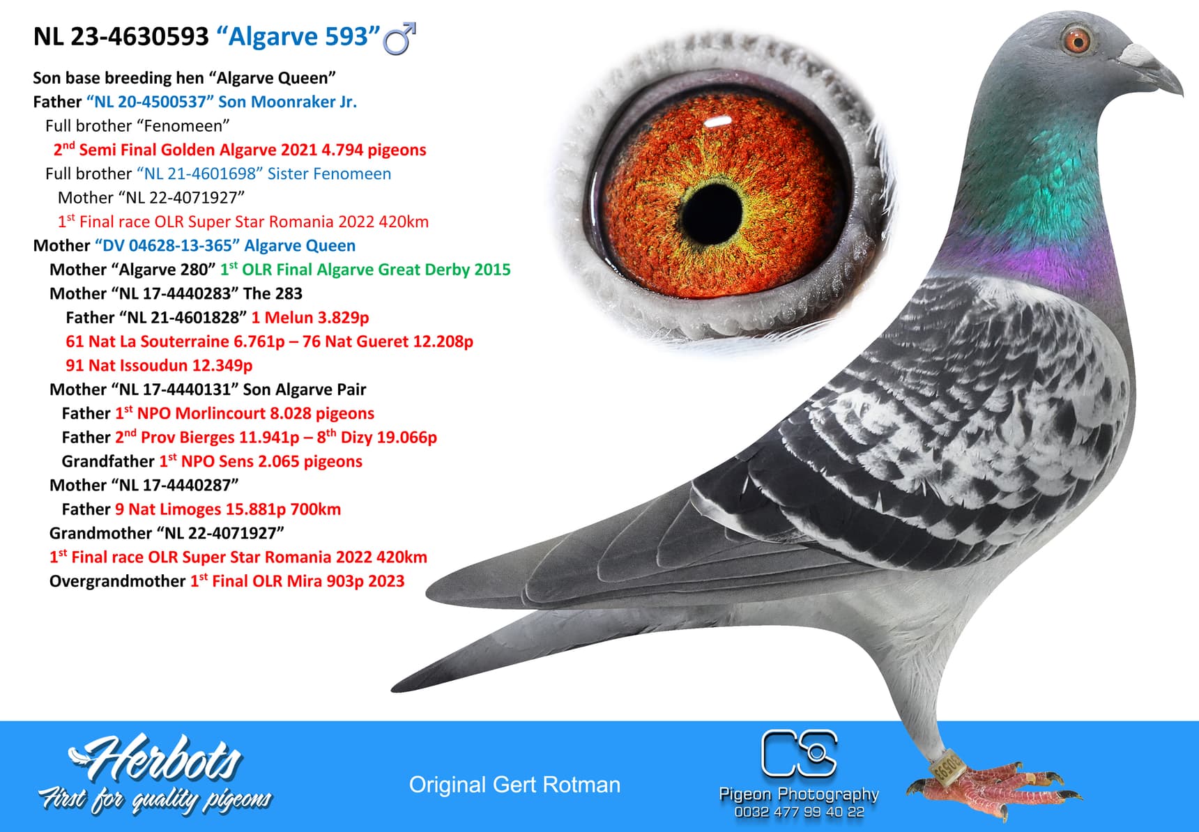 The father of this pigeon is a direct pigeon from Gert Rotman who is again a grandson of stock mother "Algarve Queen" where so many top results have been achieved on OLR flights and is also a son of brother "White Sensation 662" who was 1st Ace Pigeon Algarve OLR 2018 became.