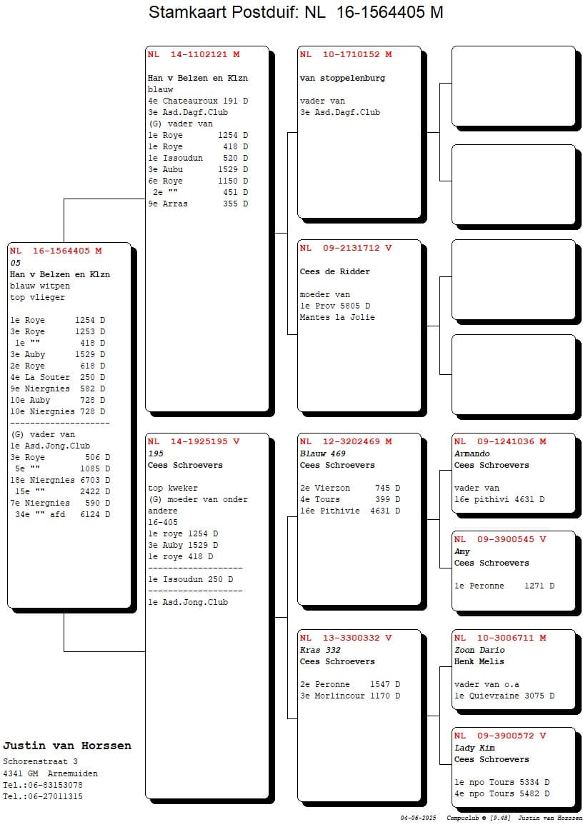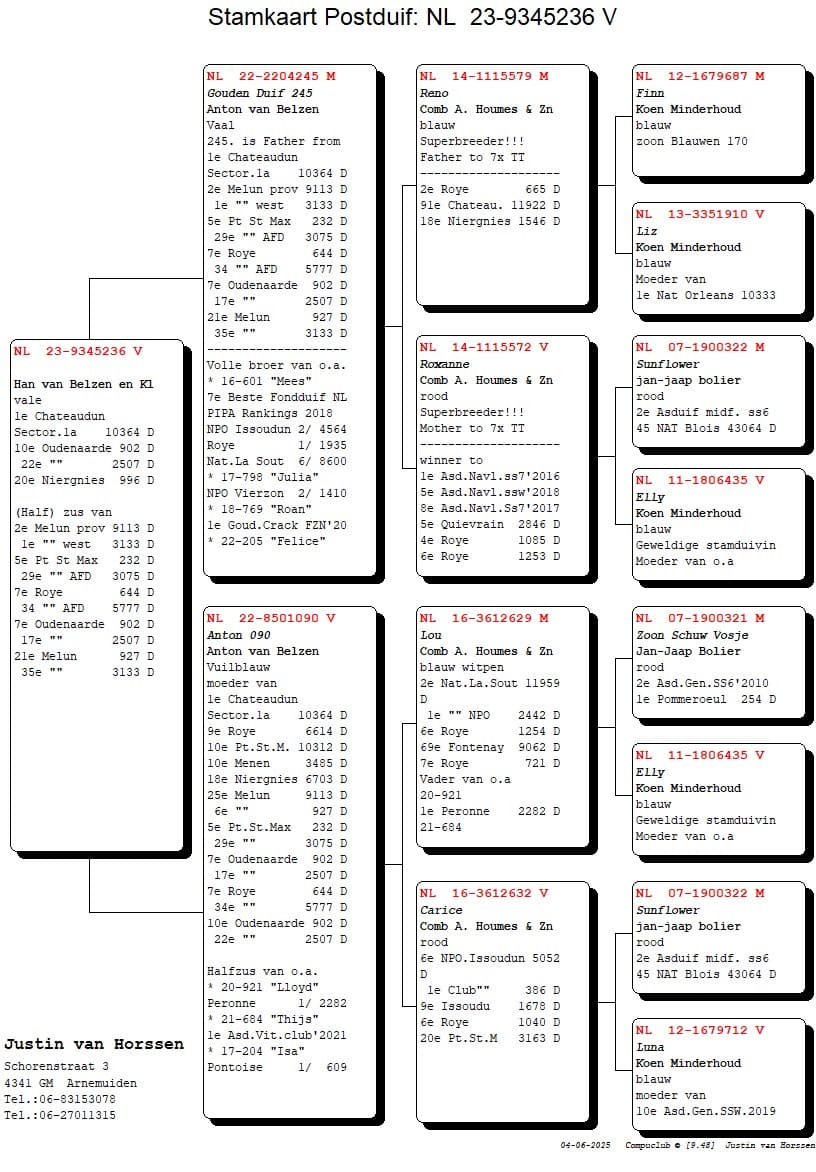 The basis of their colony consists of pigeons from well-known fanciers such as C. Schroevers, M. de Ridder, P. van de Woestijne and the Meulmeester combination. However, most of the pigeons come from A. Houmes & Zn, purchased by Han's son Anton van Belzen. Every year, intensive co-breeding takes place with Anton.