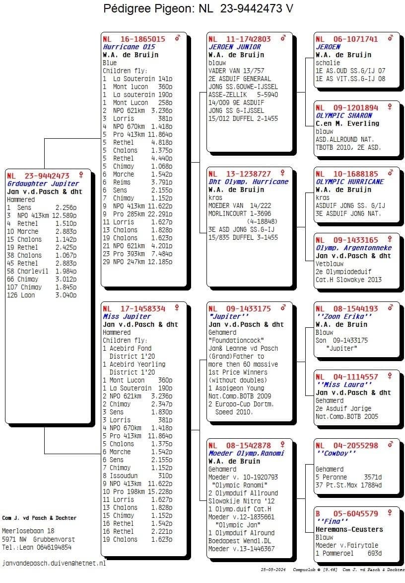 Son of “803/11” Jeroen Junior x “727/13” Daughter Olympic Hurricane x Olympic Argentonneke and co-breeding between Jan Van de Pasch and Willem De Bruijn