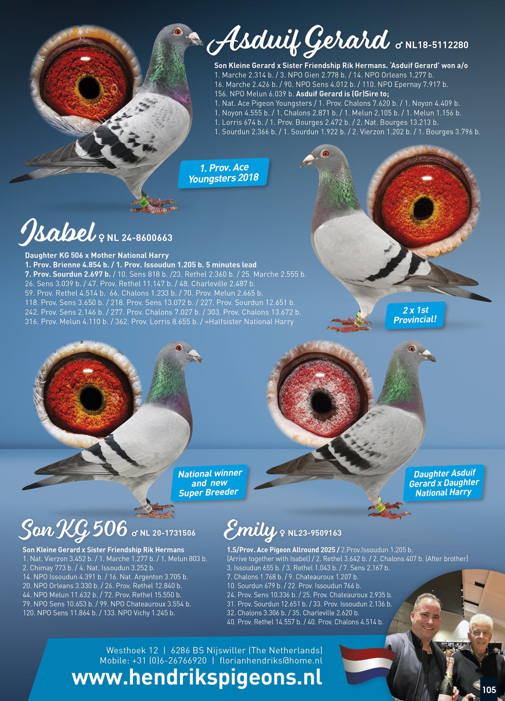 bred his 1st Prov. Bourges 2,472 yearlings (2nd Nat. 13,213 p.) 2025 from "Son Asduif Gerard", who is also the sire of 16th Nat. Ace Pigeon 2022, 1st Sourdun 2,366 p., 1st Sourdun 1,922 p., 2nd Interprov. Vierzon 1,202 p., 46th Nat. Souillac 4,637 p., etc.