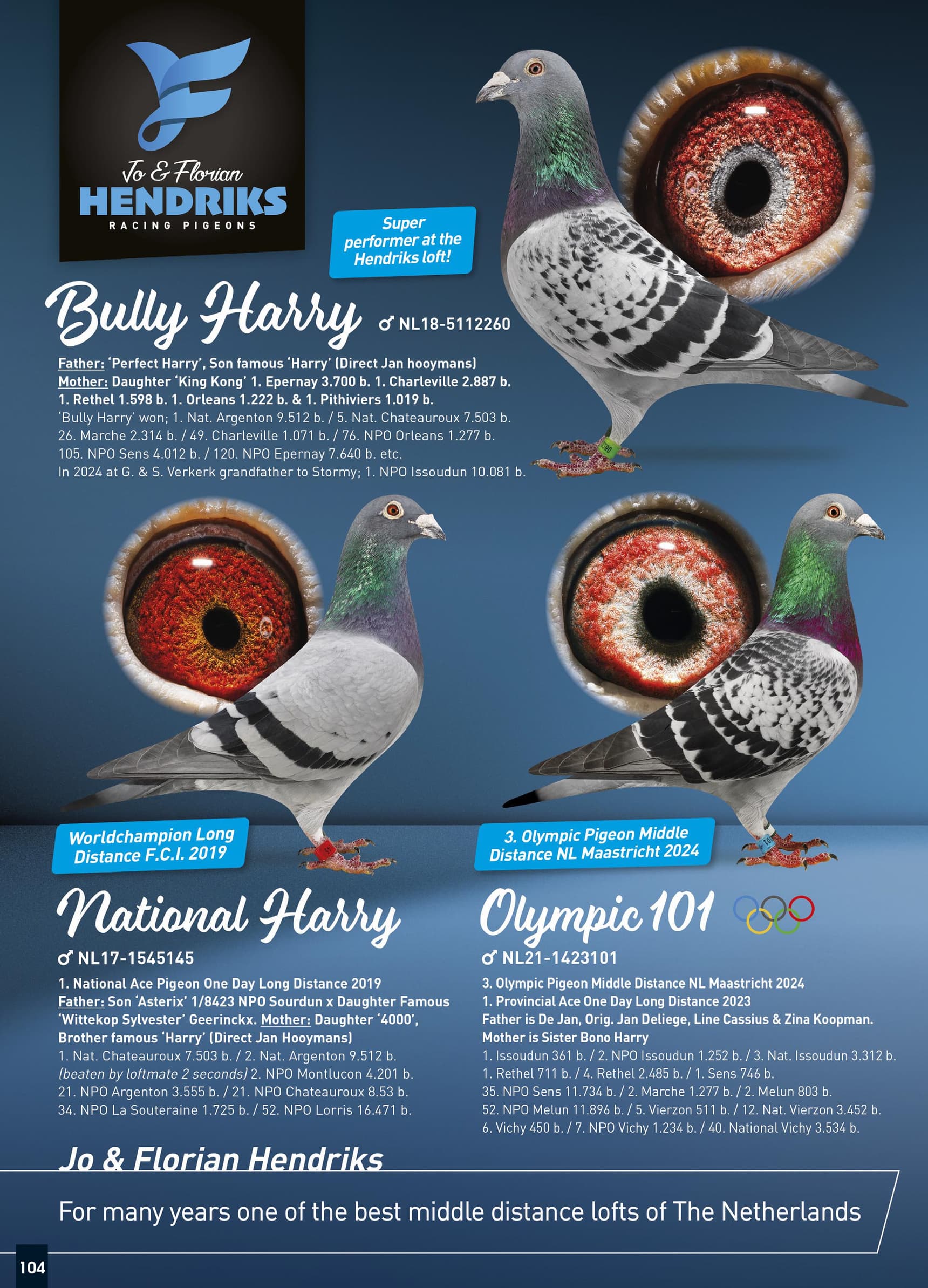 won 1st Prov. Bourges 4,790 youngsters (26 m/m lead) / 15th Nat. 18,985 p. (bred from a Hendriks cock out of "Zoon National Harry" x "Luna") and 1st-2nd Prov. Bourges 3,796 yearlings (27 and 16 m/m lead, 1st Prov. is 50% Hendriks from "Asduif Gerard" and 2nd Prov. also has a Hendriks cock as sire, from "Kleindzoon National Harry" x "Daughter Asduif Gerard")!