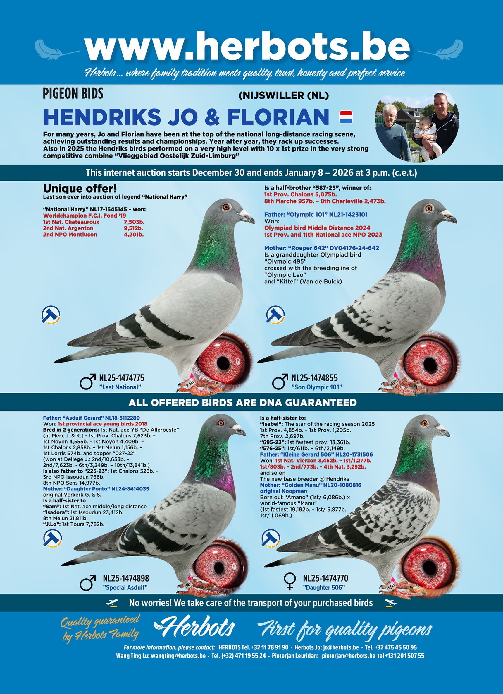 Specially for internet sales of Pigeon Bids, Kevin and Noah bred and selected a beautiful group of 2025 pigeons from their very best pigeons, including the last child ever offered by Jo & Florian out icon "National Harry".