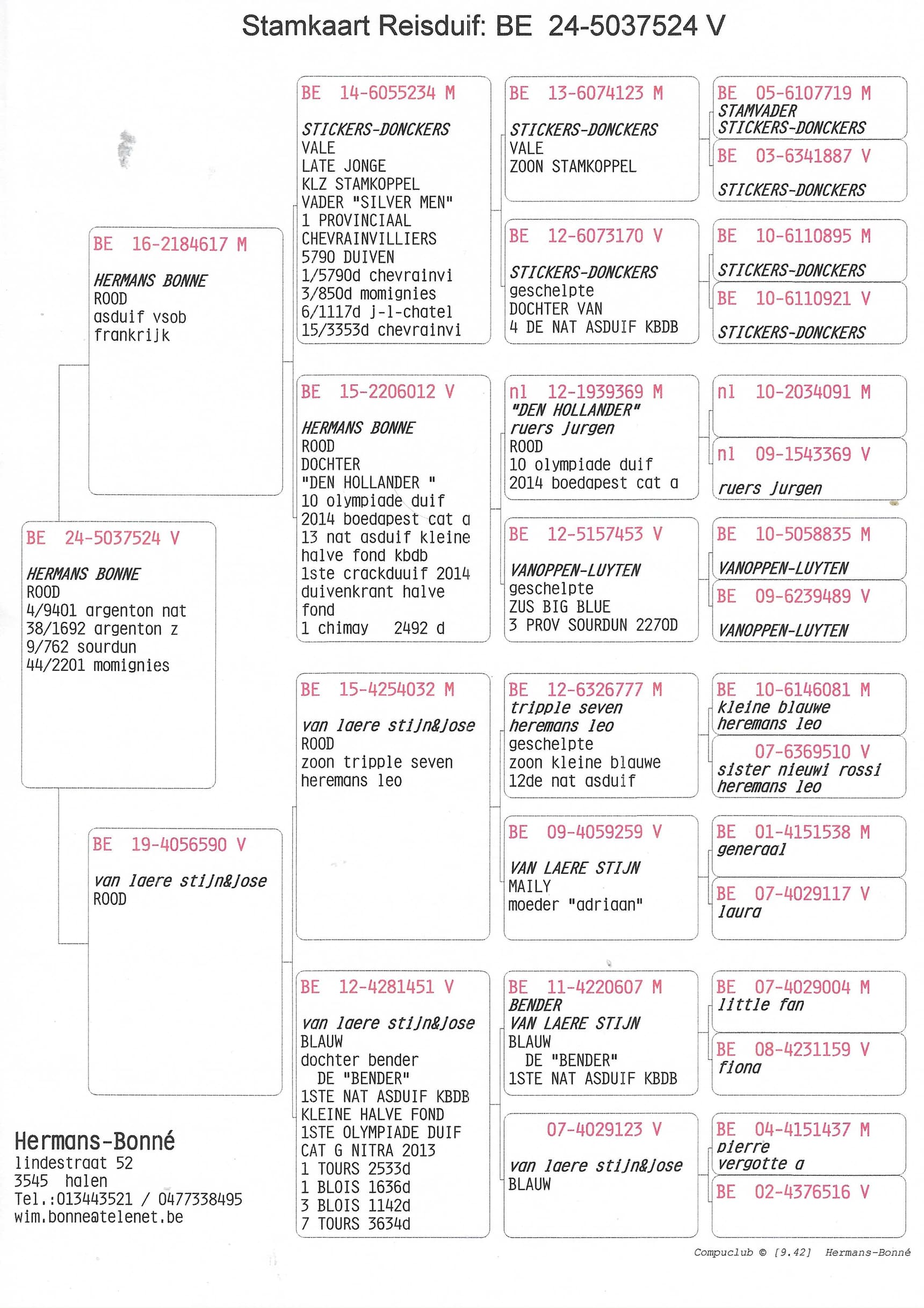 Argenton is becoming a bit of a refuge for the Hermans – Bonné colony from Loksbergen in Limburg. This year they already won a 1st and 7th National Argenton against 11,177 yearling pigeons and last year they also won a 5th National Argenton with the young pigeons. This past Sunday they were celebrating again with a 1st Nat (z) Argenton against 555 young pigeons and a 4th National of 9,401 young pigeons. The father of this young top hen is again a grandson of stock father “Den Hollander” crossed with the pigeons of Stijn Van Laere. It was a double celebration for Wim and Roger because the gold came to Loksbergen at Sourdun the day before. Here they won 1st Provincial Sourdun against 1,677 young pigeons and this was the fastest pigeon in the entire province. The weekend couldn't have been better and for them it was a fantastic end to their super season... or who knows what will happen next Saturday at Chateauroux.