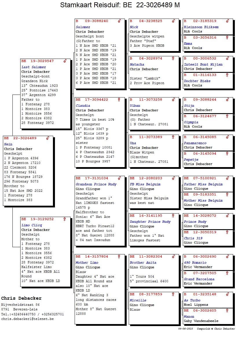 Out of daughter "Bieke" x speedsters, "Lambiek" was born and she became the 1st pigeon with a provincial win in 2002. Sister "Lambiek" ("Natascha") x son "Emma" ("Nick") became the foundation pair of the colony. They became the parents of many good pigeons including "Panamarenko" with 7 x 1st prize, "Staf" was 3rd prov. and grandfather of "Serosero" of Anthony Maes and the "Bonte Crack" with 1st nat. Ace long distance. Also "Stuart", "Randi" and "Salomez".