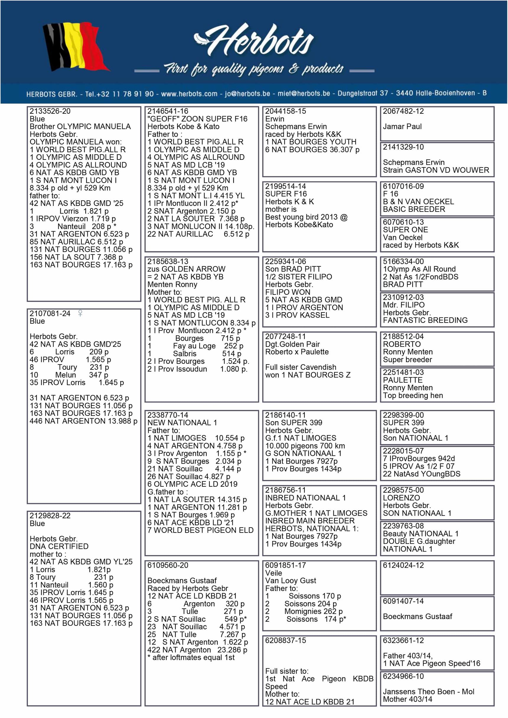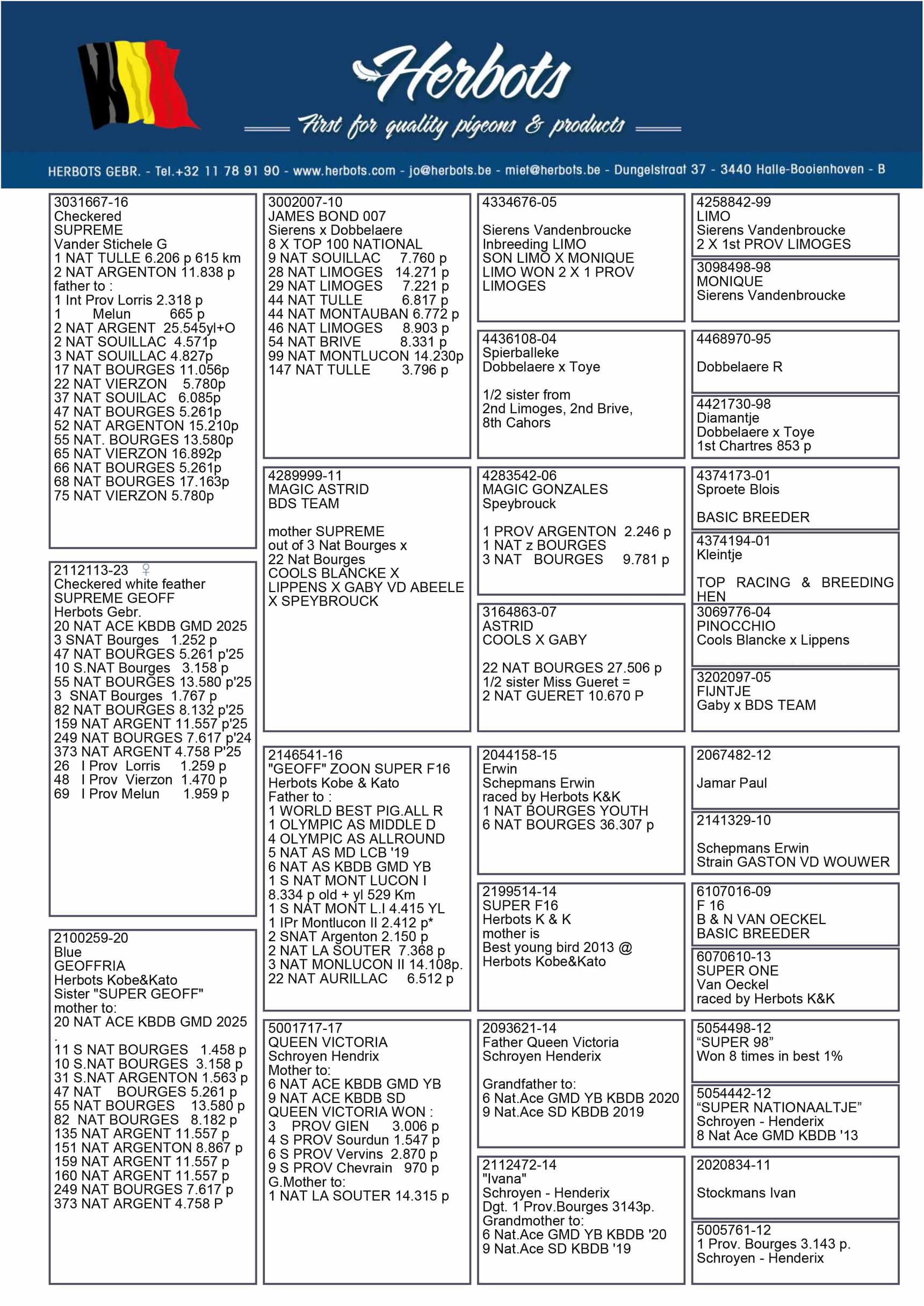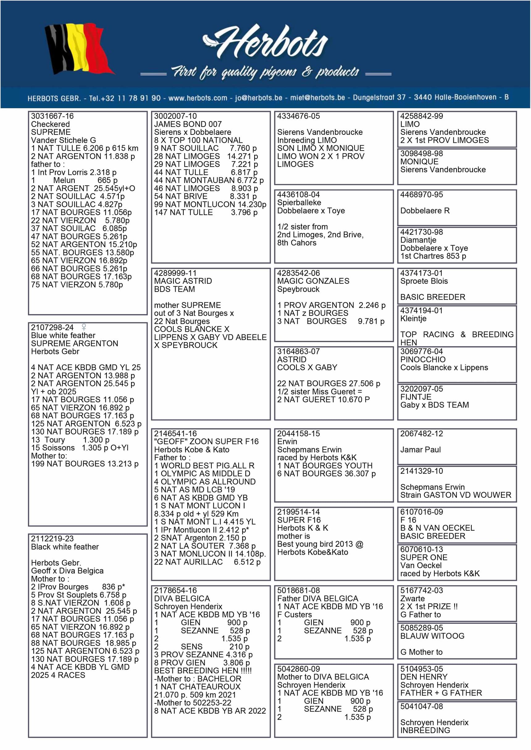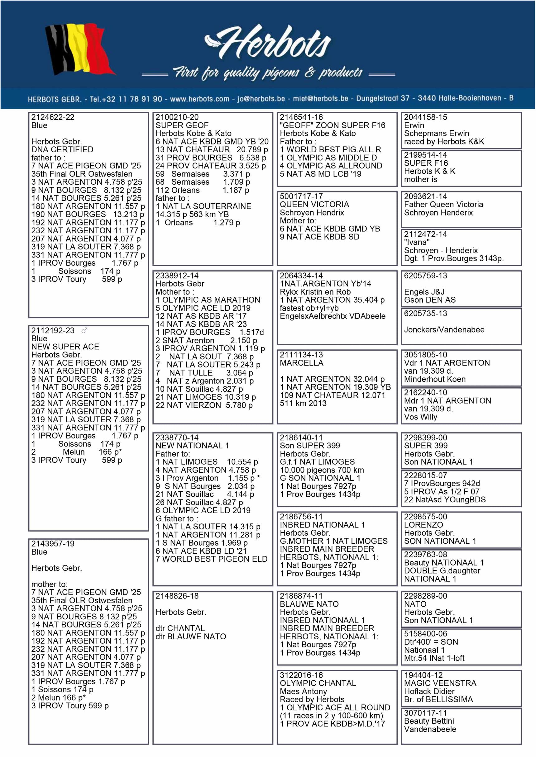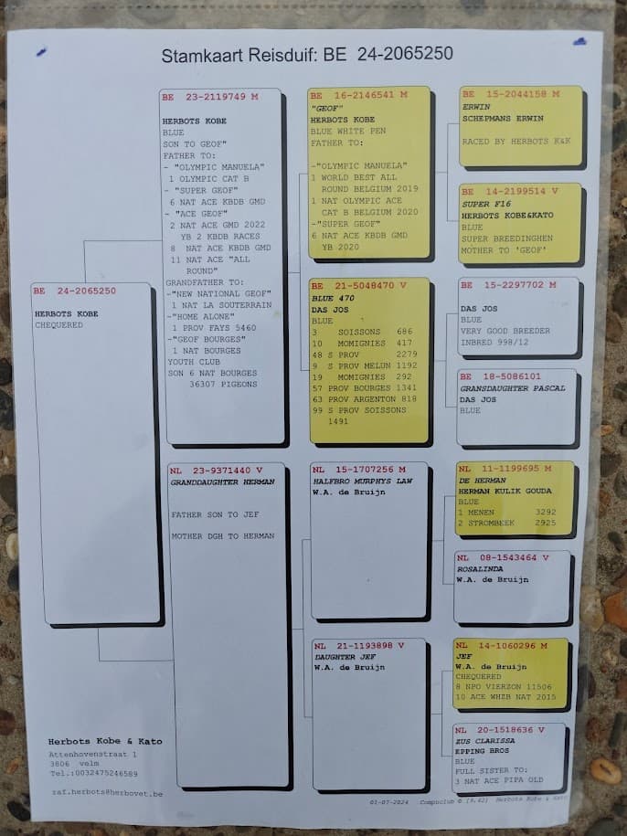 Not only this season are the pigeons of Kobe and Kato Herbots performing fantastically at other locations, which makes both them and other fanciers happy. But this season was truly exceptional, with all the references we know so far thanks to the "Geof" line. A breeding line that, judging by these pedigrees, crosses easily with other bloodlines and is therefore very successful. Take a close look at these pedigrees, and you'll find many other top pigeons paired to these children or grandchildren of "Geof."