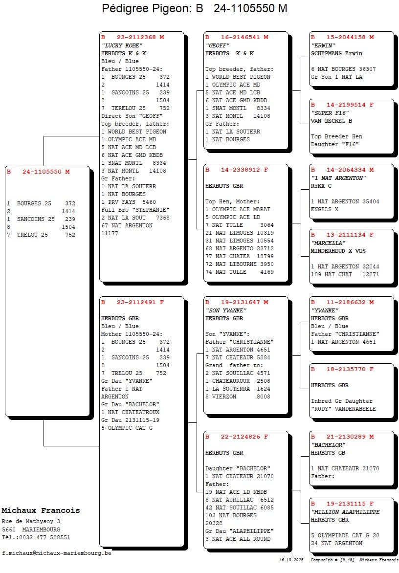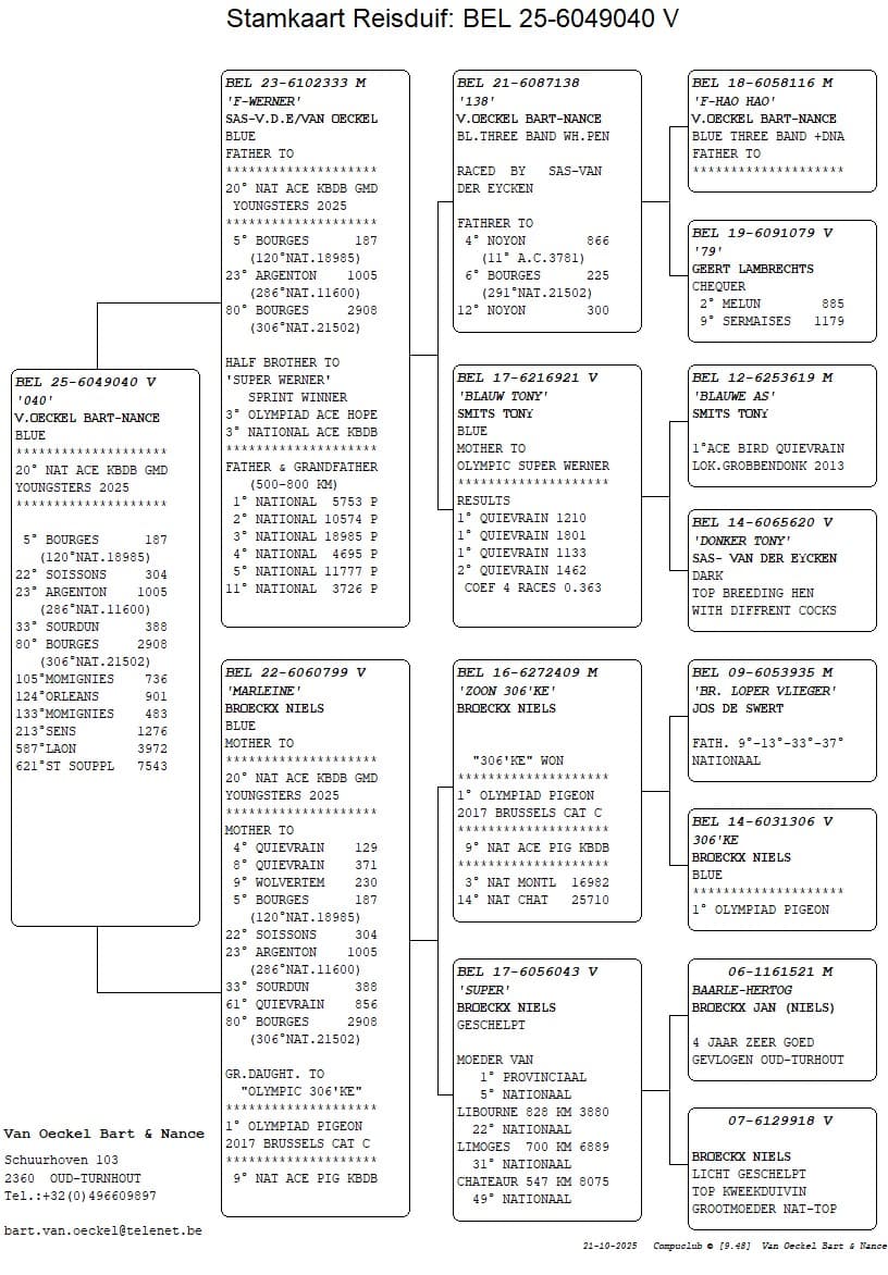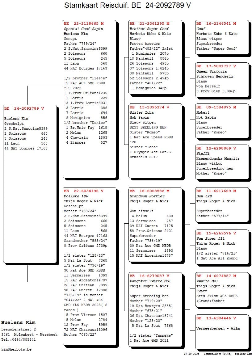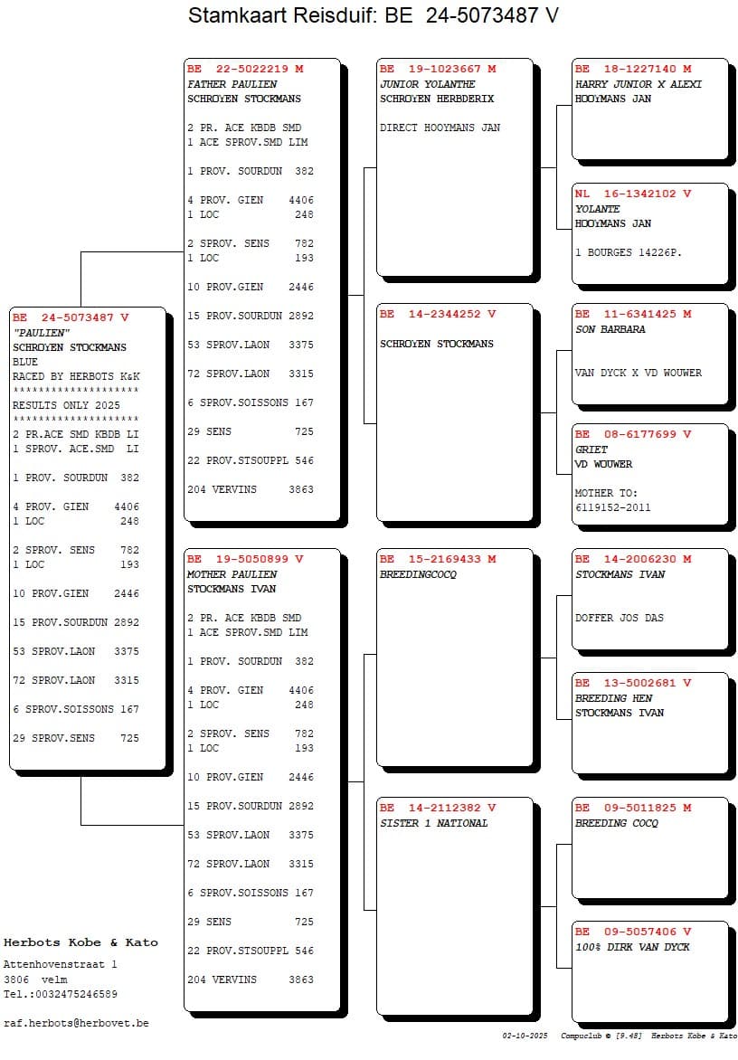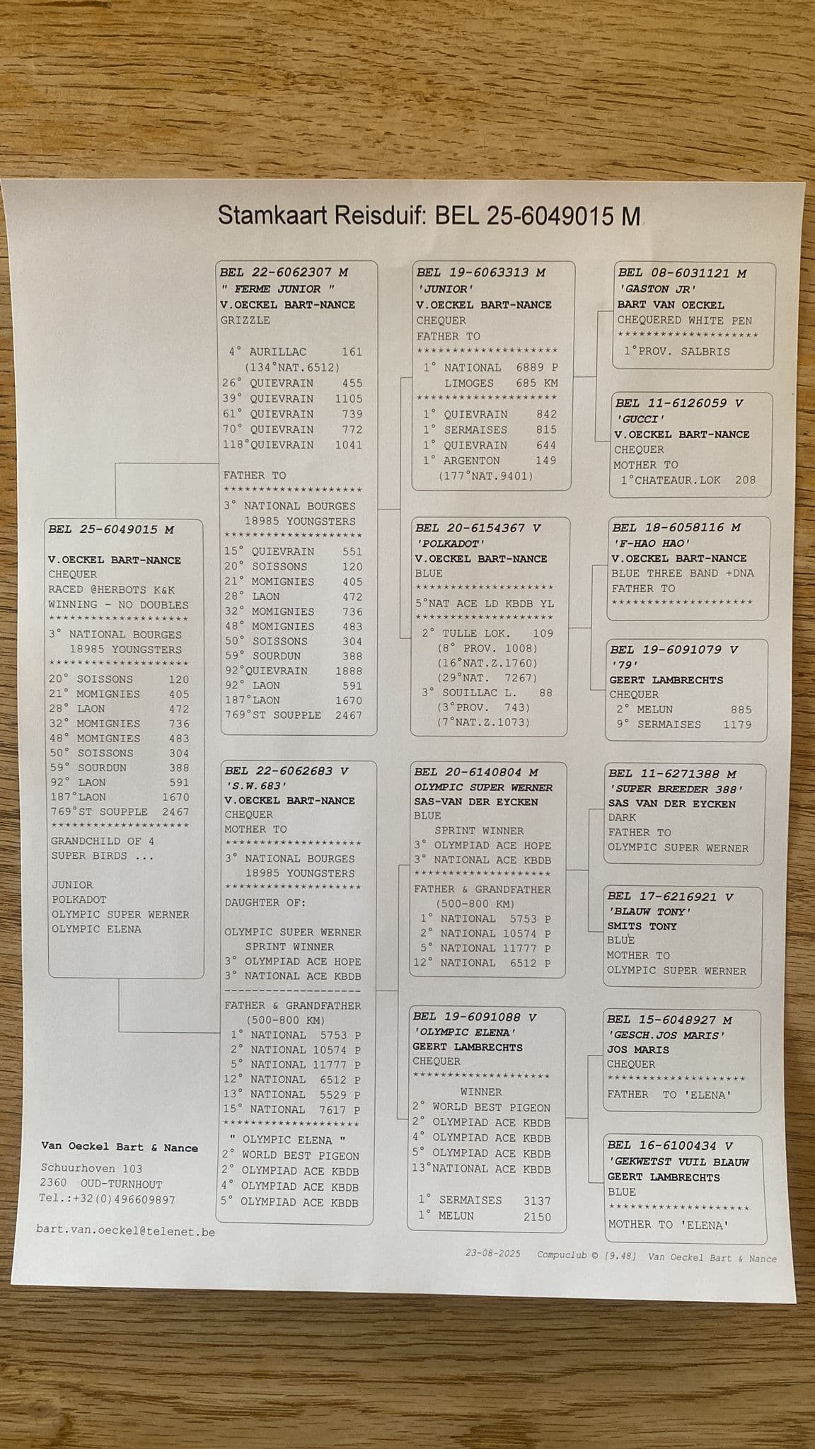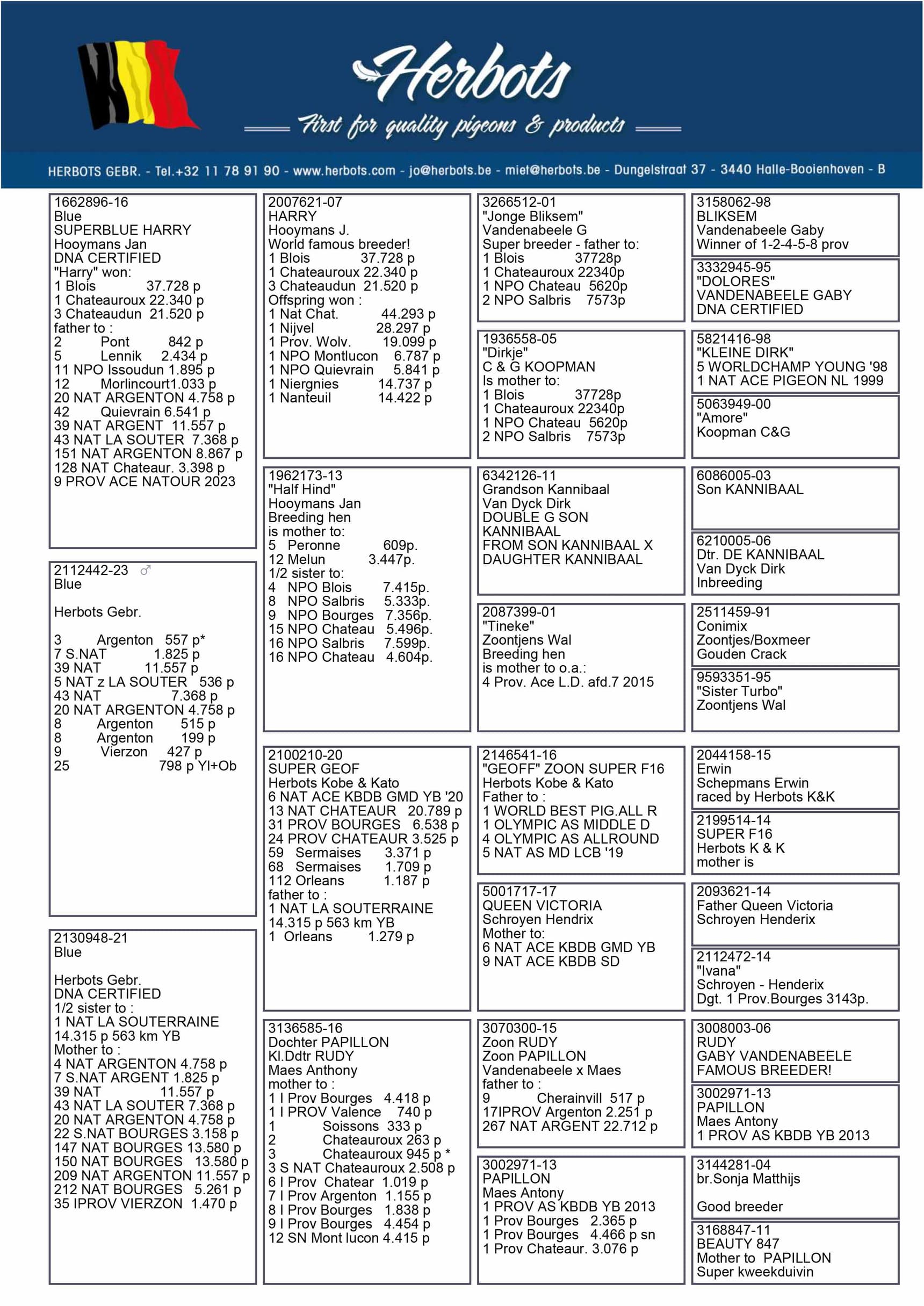 Not only this season are the pigeons of Kobe and Kato Herbots performing fantastically at other locations, which makes both them and other fanciers happy. But this season was truly exceptional, with all the references we know so far thanks to the "Geof" line. A breeding line that, judging by these pedigrees, crosses easily with other bloodlines and is therefore very successful. Take a close look at these pedigrees, and you'll find many other top pigeons paired to these children or grandchildren of "Geof."