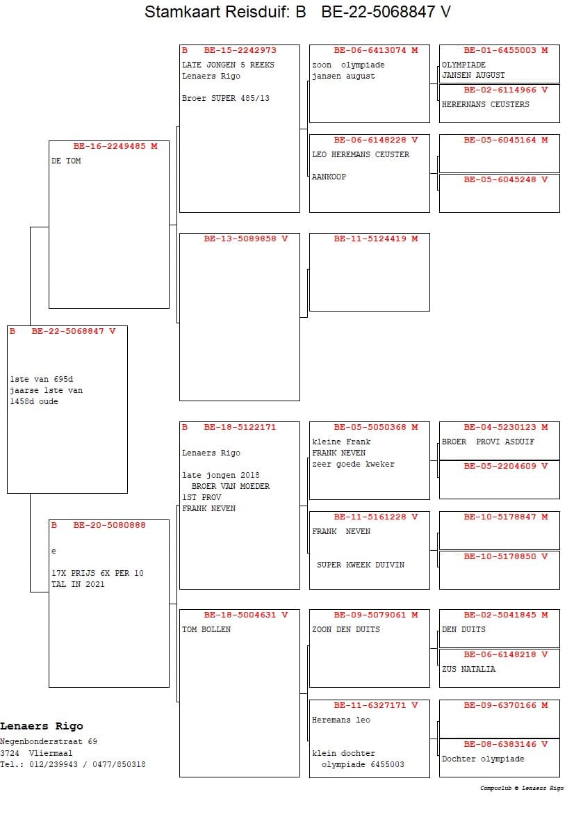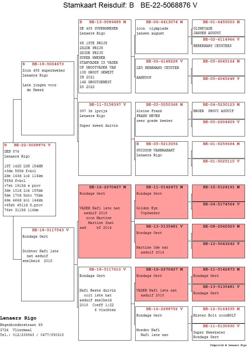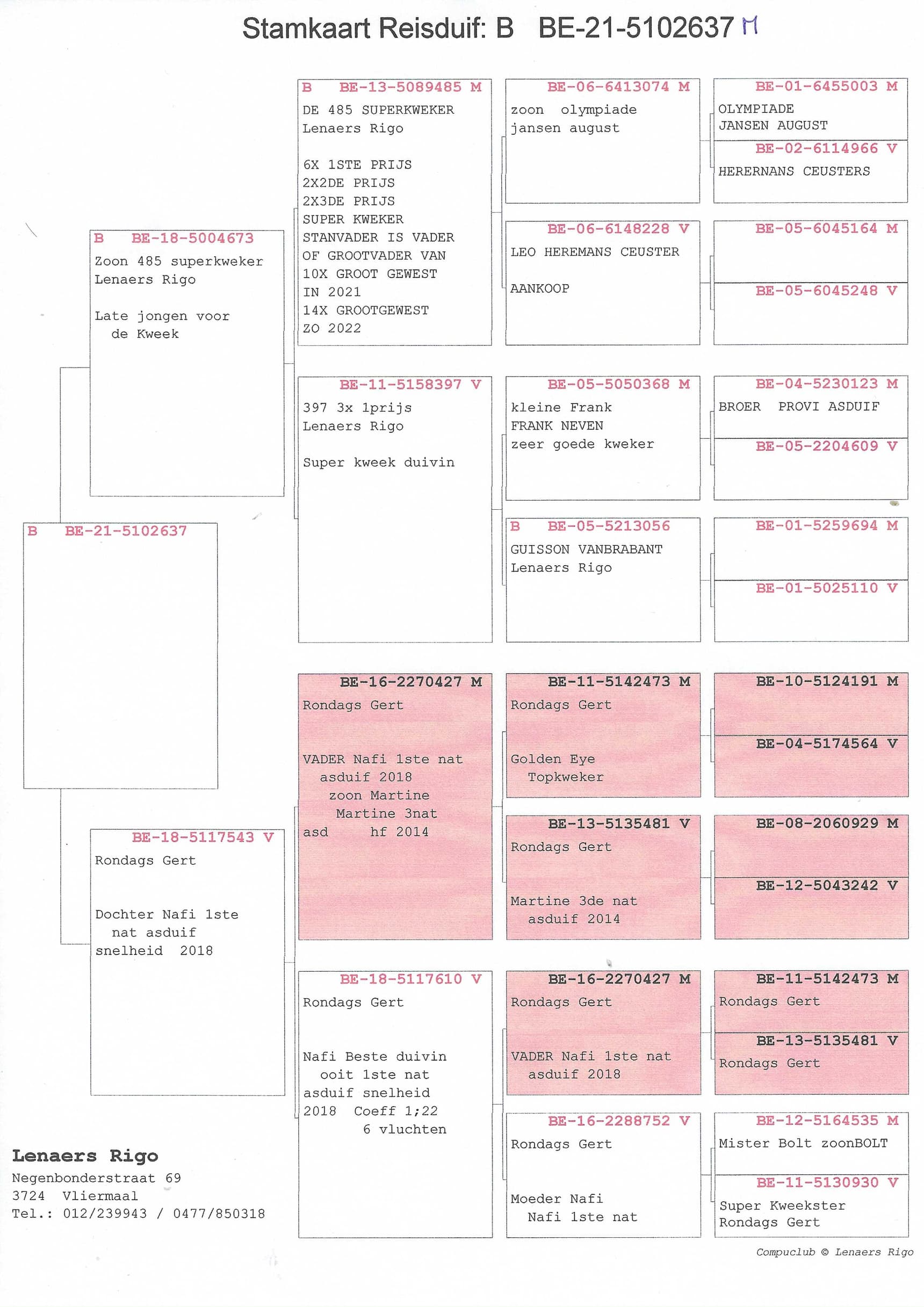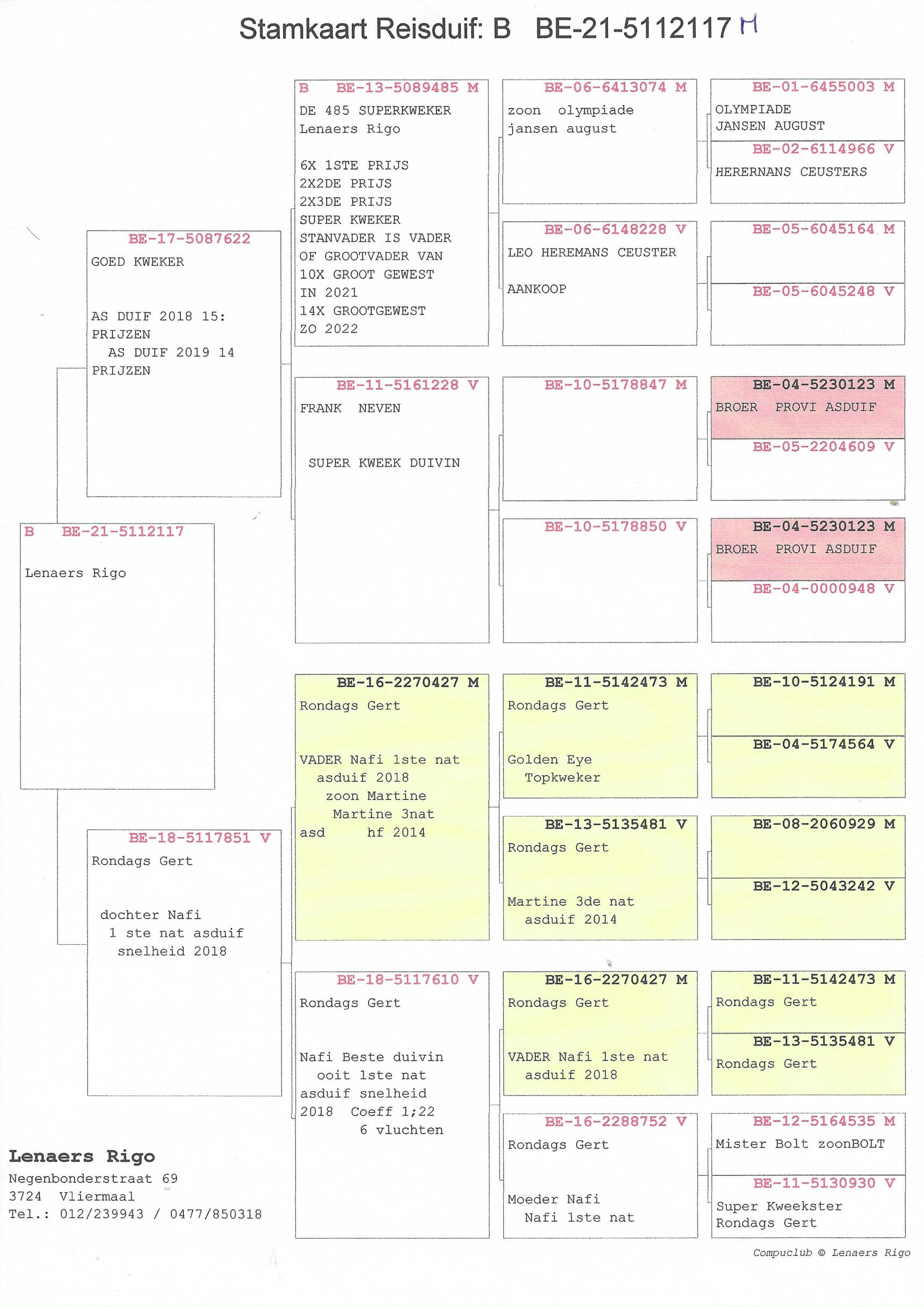 去年冬天,我们首次向您介绍了林堡-弗利尔马尔的里戈·雷奈尔鸽舍。现在本赛季已经过去一个月了,我们将再次拜访他,因为他在新赛季取得了良好的开端。一周又一周,他赢得了几个顶级奖项,总共赢得了林堡东南部地区赛8次1名。这一切都归功于他的超级种鸽“超级485”(“奥林匹克003”之孙--里奥·贺尔曼)的贡献以及与弗兰克和格特·隆道格(“纳菲”回血)的杂交作育。此外,我们不应该忘记“超级485”与弗兰克·尼文鸽子的杂交作育。因此,您拥有3个确保目前在这里取得所有成功的基本鸽系。