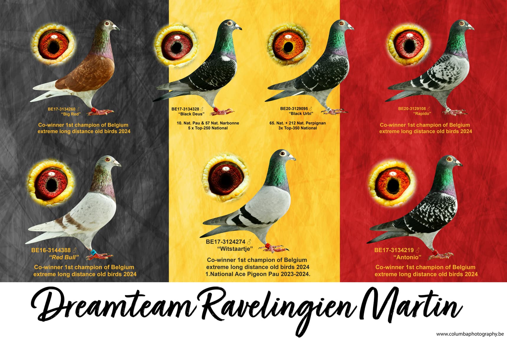 The basis of this colony was laid with pigeons from Vandendriessche-Benoit with whom Martin was a familiar face (and this strain was built on the Catrysse brothers, Pol Bostyn, Andre Lietar, Jozef Huysentruyt, Noël Peiren, Marcel Desmet...). Later on pigeons were bought from Marcel Demeyere from Tiegem and under Marcel's impulse the heavy long-distance card was fully drawn.