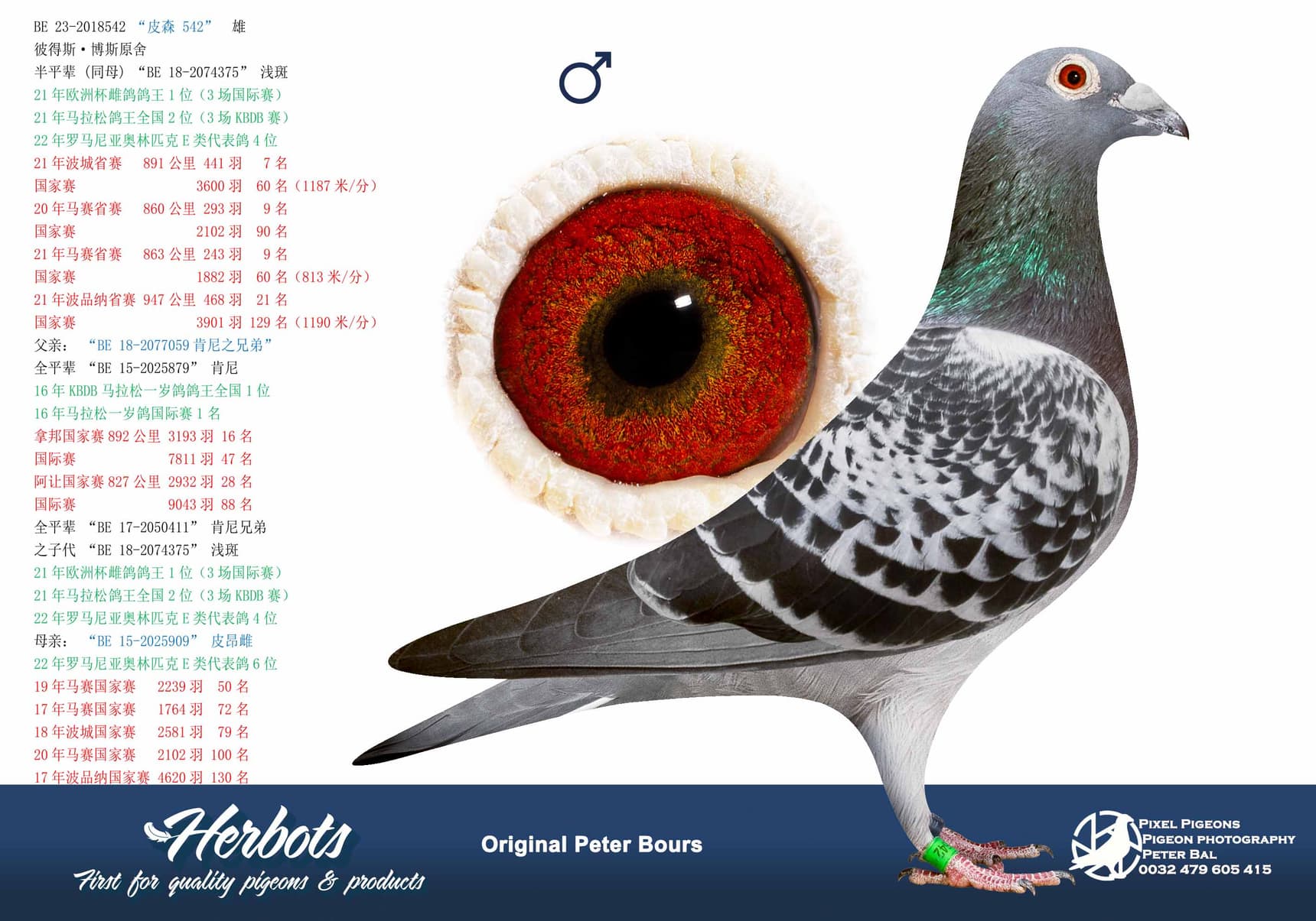 His father is “De Marseille” who won 41 Int.Nat Marseille at Peter’s and is present in this auction. He has the blood of Remy Speltdoorn x Marcel Aelbrecht via Kristiaan Hennes. When you hold this pigeon in your hands you feel exactly a 4 year old cock. He is still in excellent top condition.