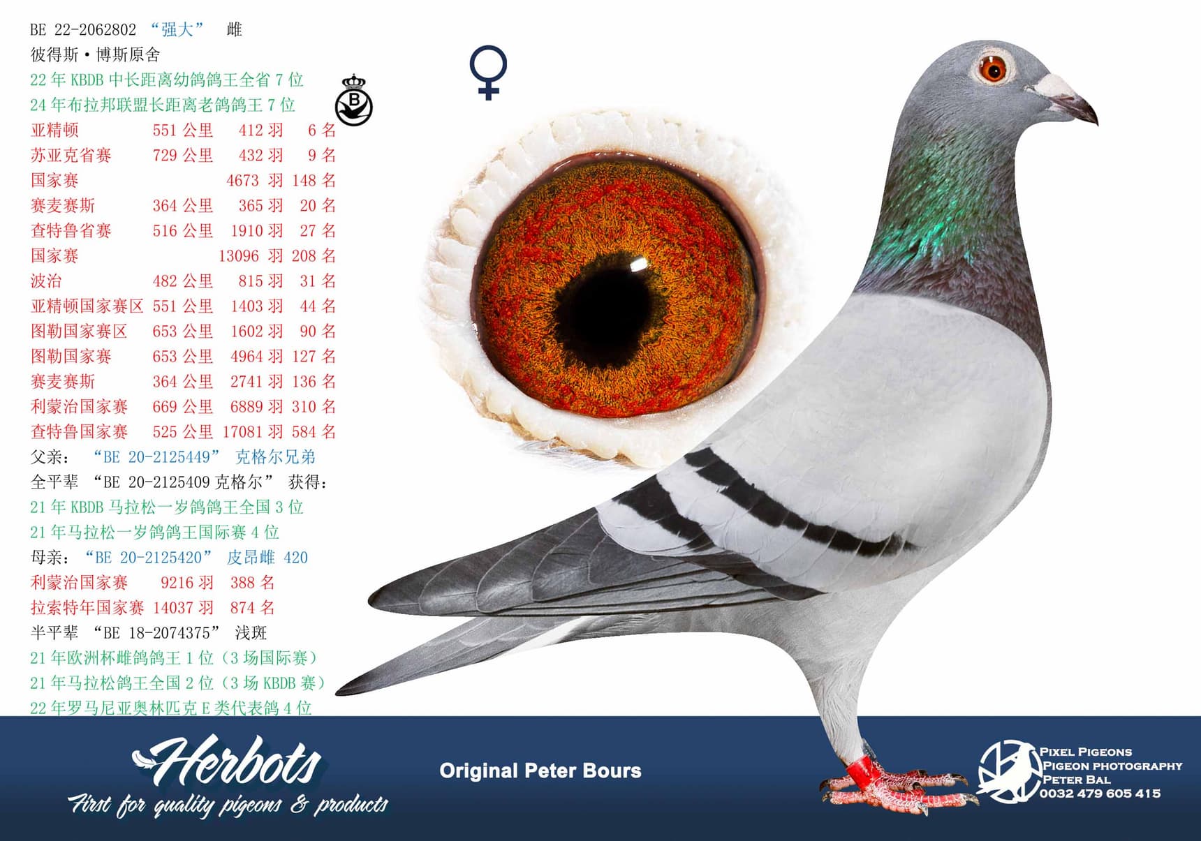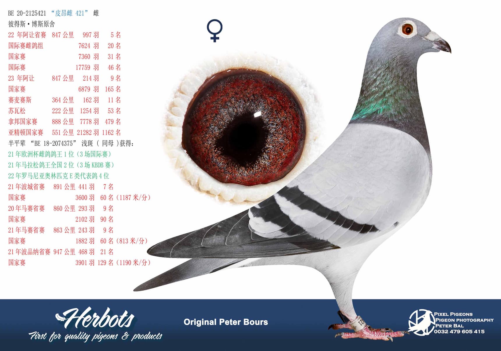 After “Kenji” there were of course other top pigeons on the extreme long distance that Peter himself has raced. For example, there was top hen “De Lichte” who won 1st European Ace Pigeon Hens 3 International flights 2021 - 2nd National Ace Pigeon extreme long distance over 3 International flights 2021 - 4th Olympiad Pigeon Cat.E Romania (season 2020-2021). She was bred from a brother of “Kenji” and her mother of wonder hen “Pientje”. Several children from this old stock hen are still in this auction.