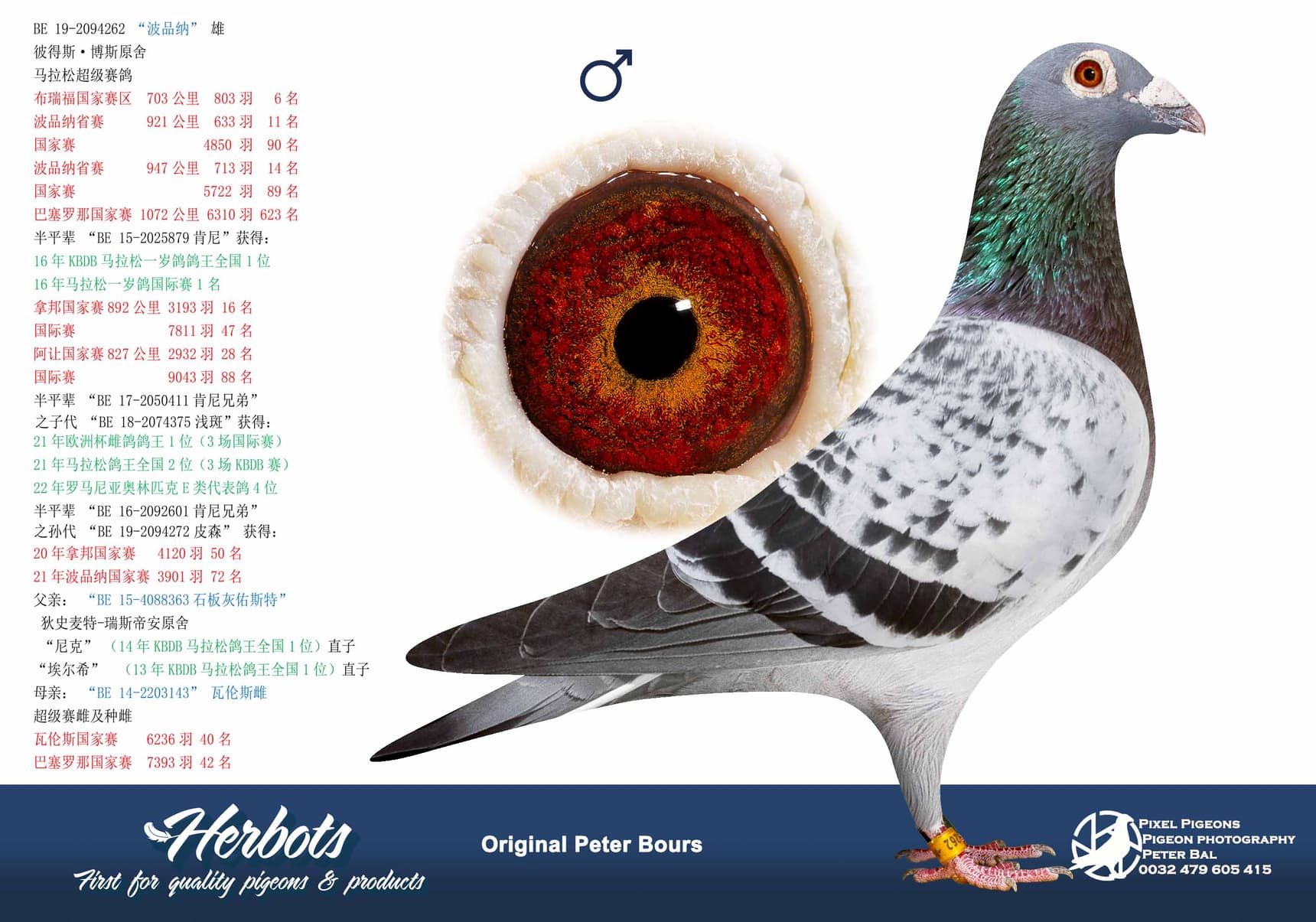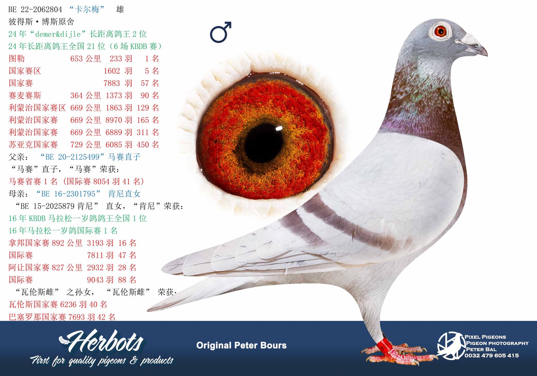This top cock is a grandson of “Kenji” and became 2nd Ace Pigeon long distance in Demer & Dijle in 2024 and 21st Nat Ace Pigeon long distance old over 6 KBDB races.