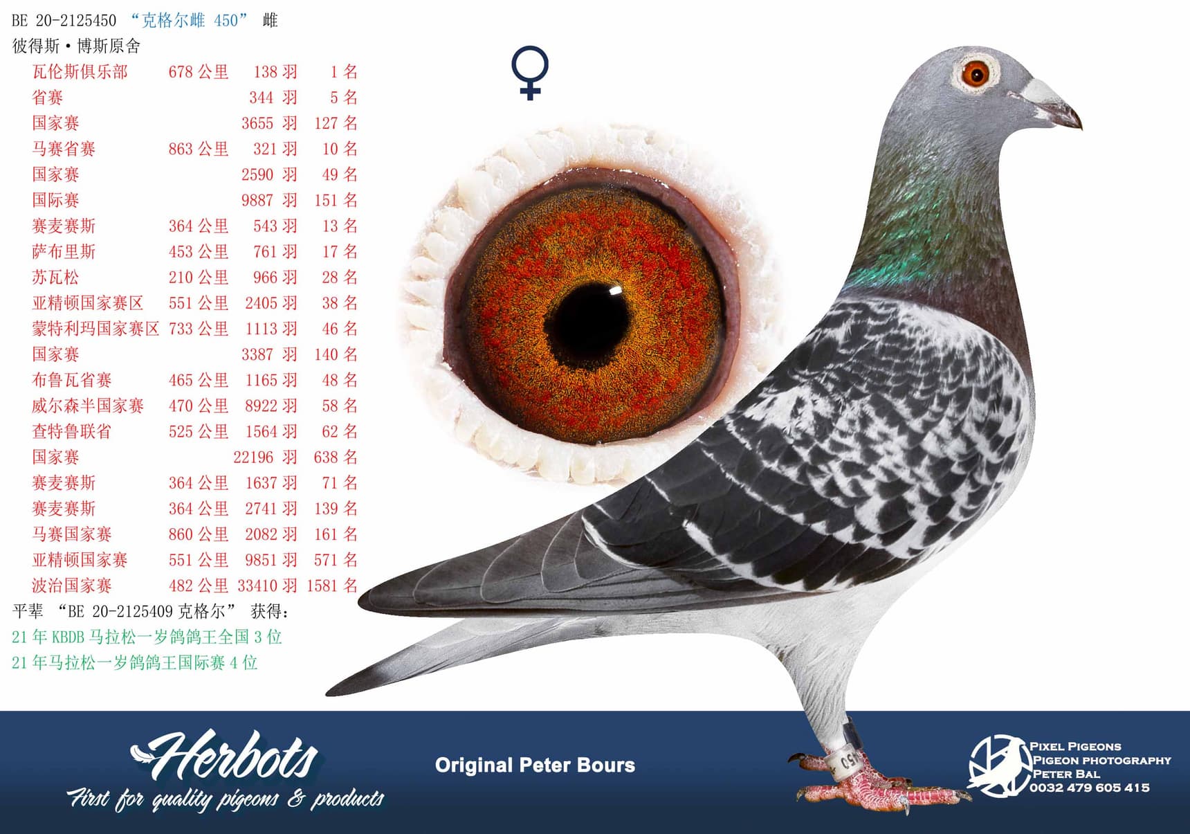 This hen won 46 Int.Nat Agen 17,759d 847km.