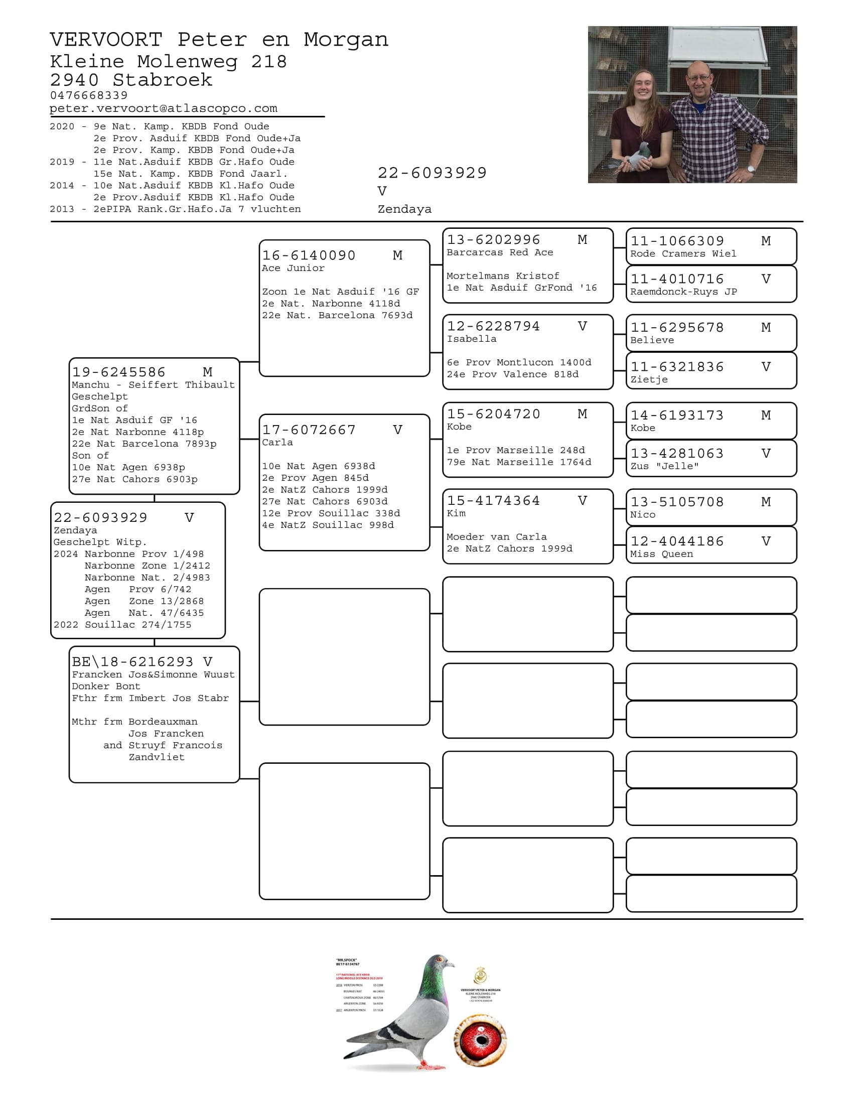 Their checkered white feathered hen fell on the board around 09h03 with a speed of 936.45 m/m, making her the fastest of 498 old birds in the province of Antwerp. As mentioned earlier, this performance made her the 2nd fastest of 4,983 old birds nationally, and the 5th fastest pigeon of 10,536 old and yearlings combined. Earlier this year, "Zendaya" already confirmed her good form by winning the 6th Prov. Agen against 742 old birds (47th Nat. against 6,435 old birds).We can't say this is very surprising considering the pedigree of this hen. Zendaya's sire is "Manchu", sired by Thibault Seiffert, who is a grandson of Kristof Mortelmans' 1st Nat. ace pigeon Great Long Distance 2016, and also winner of 2nd Nat. Narbonne against 4,118b and 22nd Nat. Barcelona against 7,693b. Also, Manchu's mother "Carla" is the winner of, among others, the 10th Nat. Agen against 6,938d and the 27th Nat. Cahors against 6,903 pigeons.