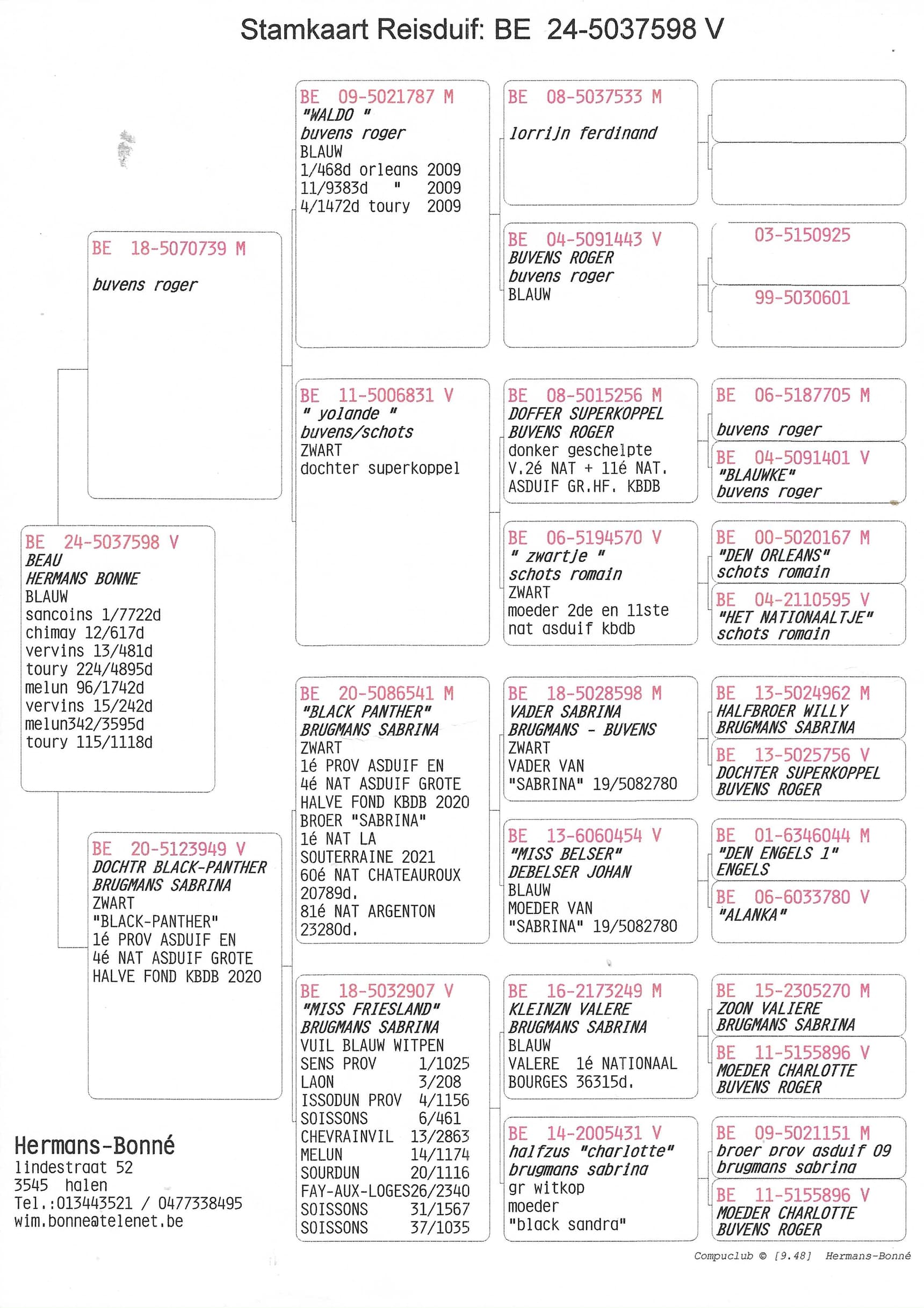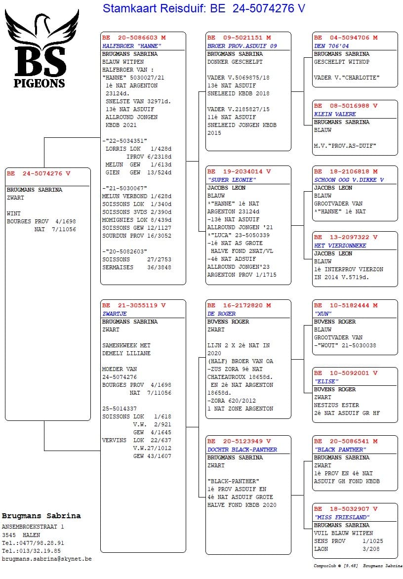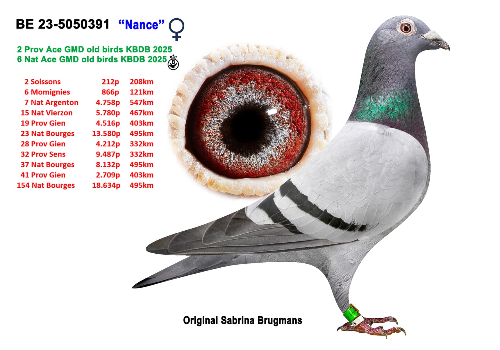 The mother is an original pigeon from Sabrina and a full sister of "Black Sandra" (2nd Nat. Chateauroux 12,888 p. – 3rd Nat. Chateauroux 33,833 p.)