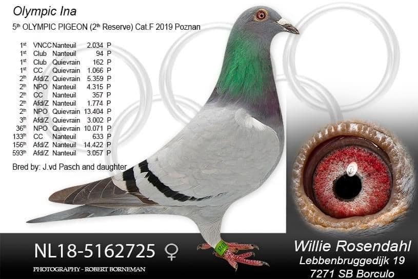 This top hen “Olympic Leanne” won 1st Olympiad Pigeon Cat.G Poznan 2019, she won 1/844p – 3 /3,227p – 4/1,432p – 10/4,419p – 10/3,461p. She is 100% Van de Pasch descent with Olympic Ranomi, Hurricane 289, 3 x Jupiter and Olympic Argentonneke in her pedigree. Before that he also had an Olympiad pigeon with “Olympic Jan”, which became 2nd Olympiad Pigeon Cat.D Budapest 2015. This “Olympic Jan” was a direct son of base breeding hen “Mother Olympic Ranomi”.