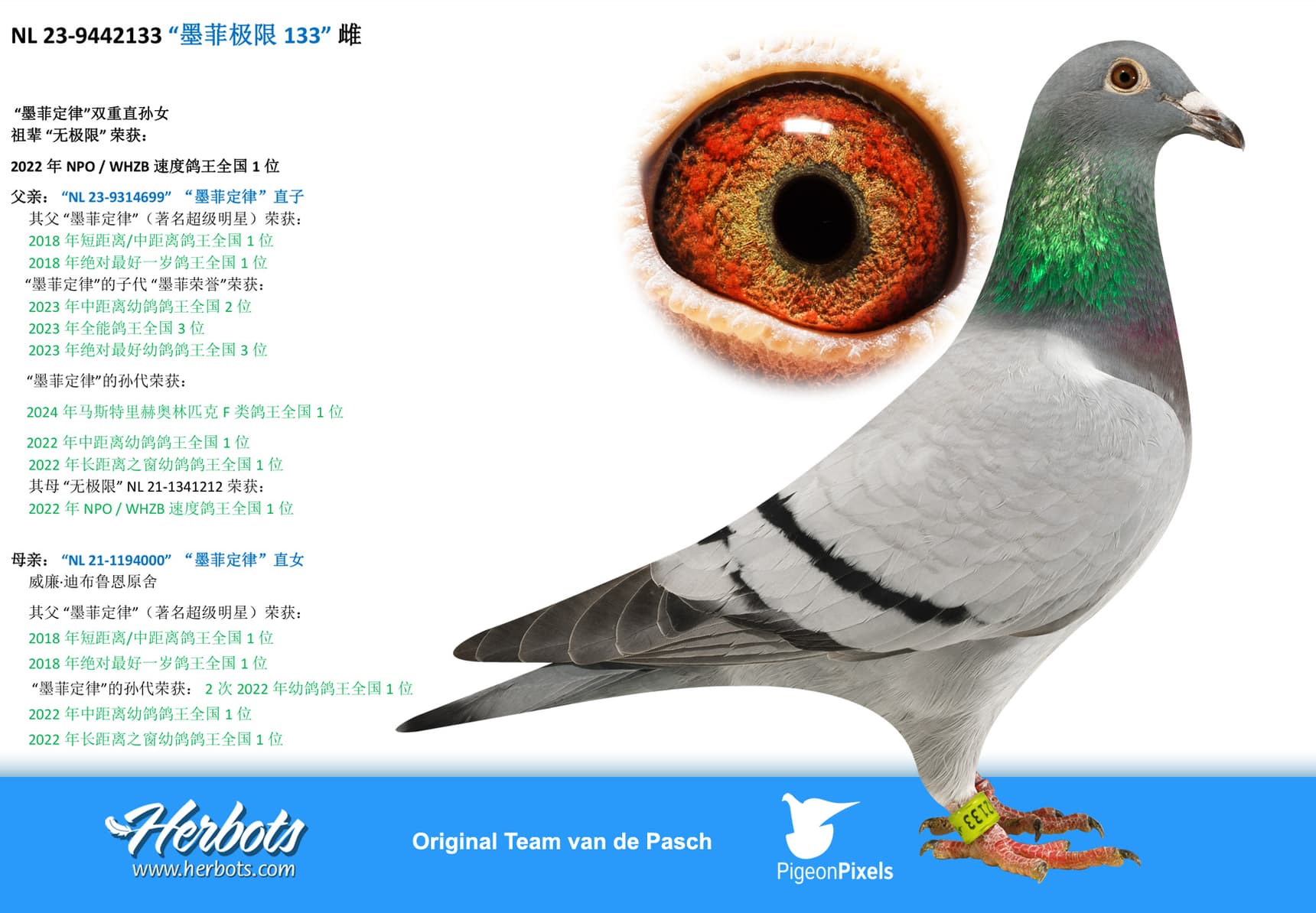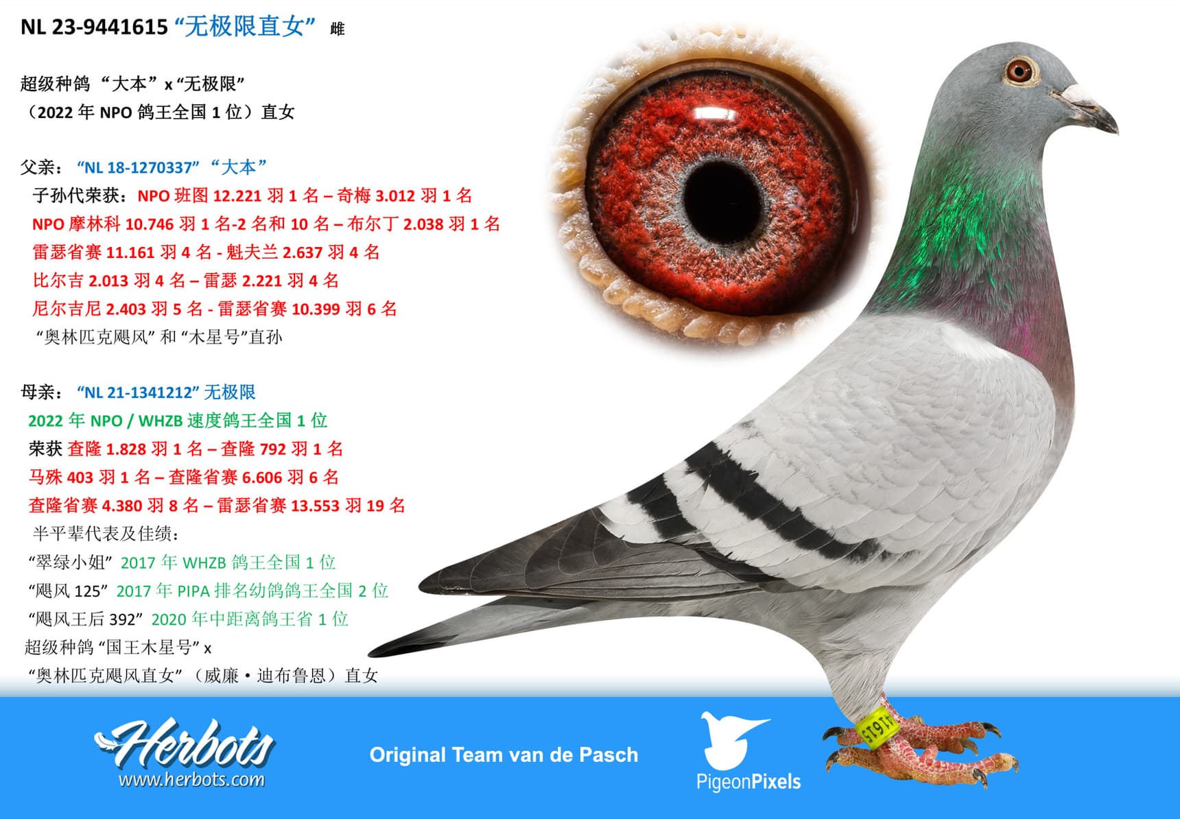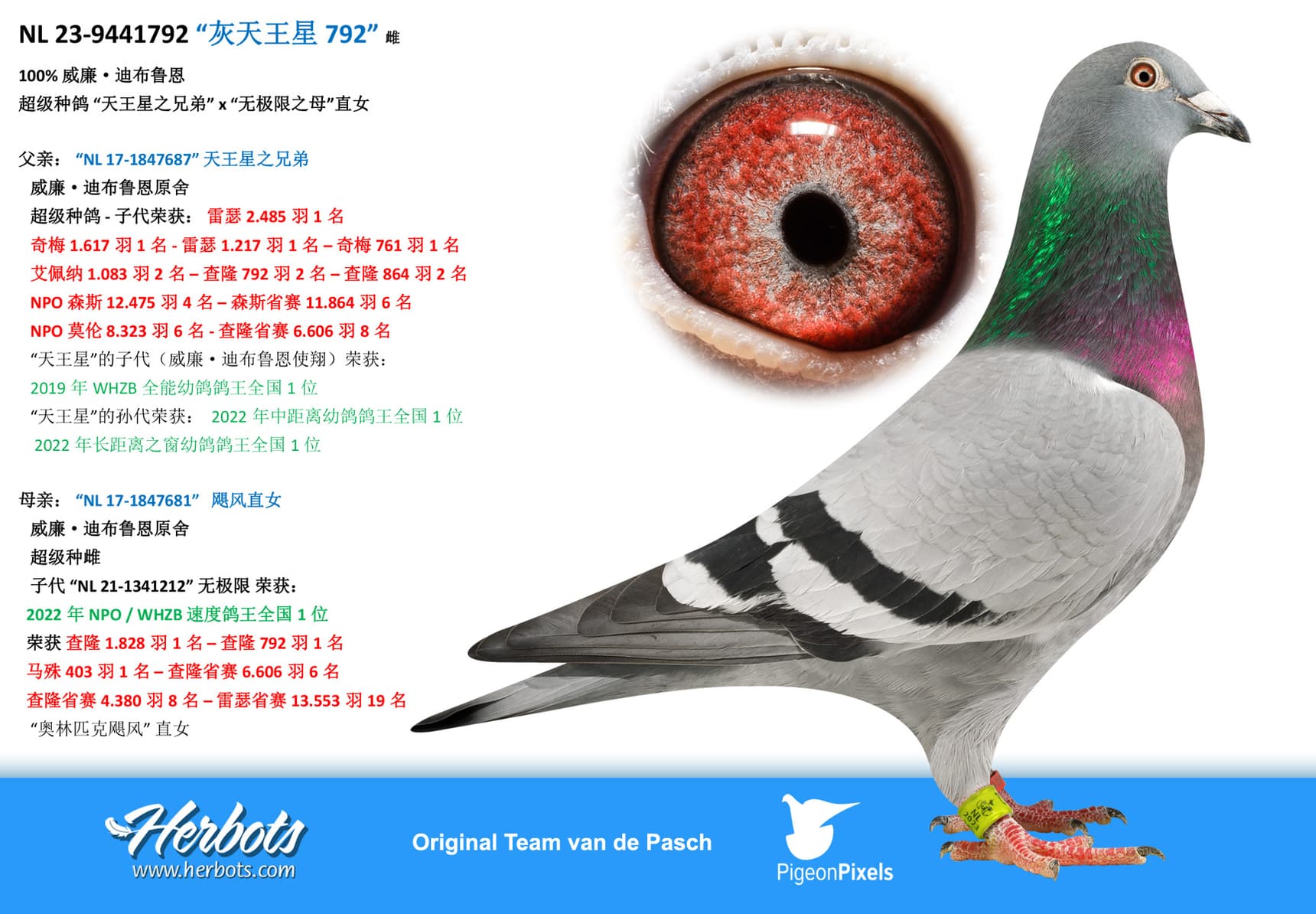 She is mother of “NL 22-8594406” 6 Nat Ace Pigeon Yearlings “The Very Best 2023”