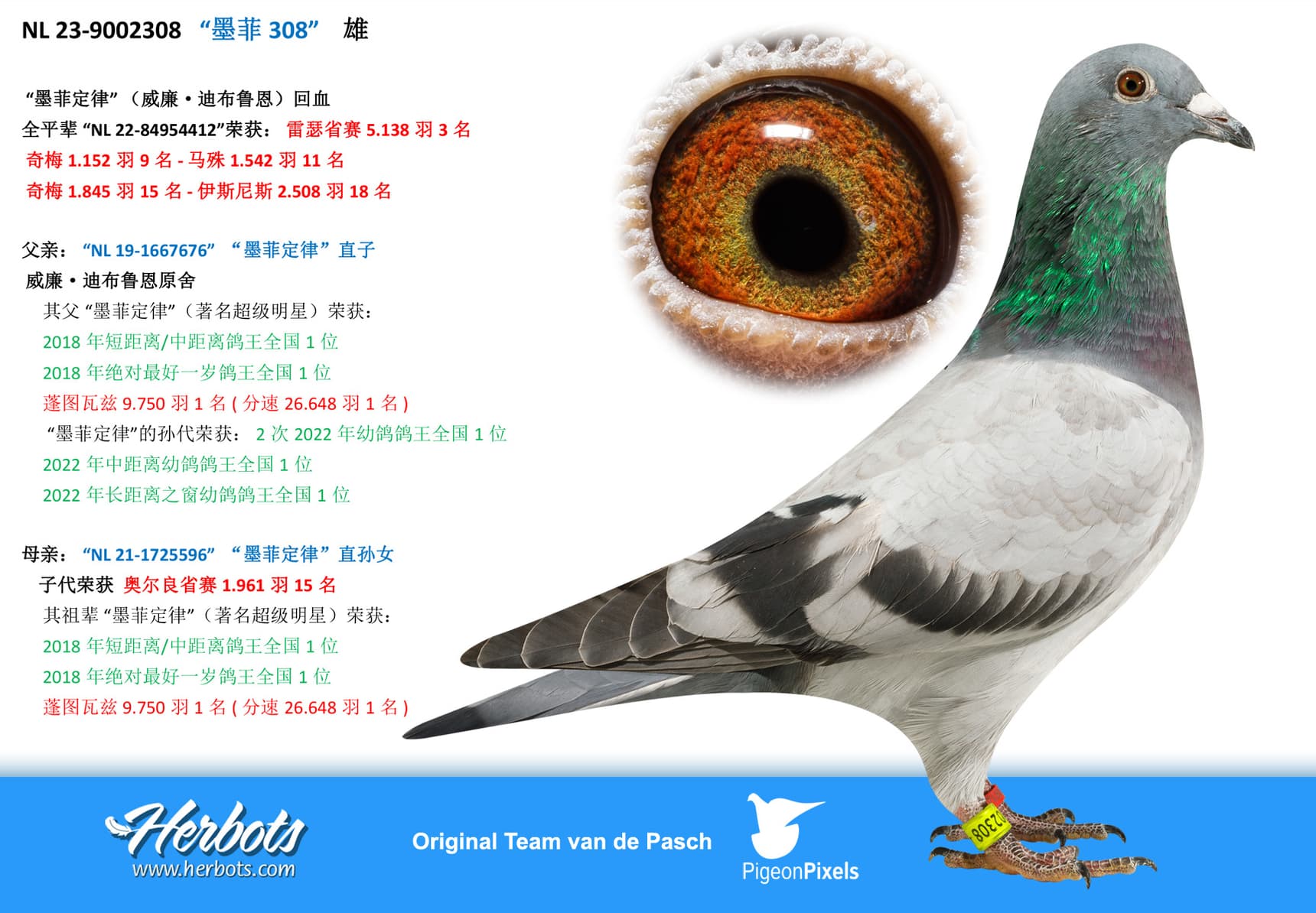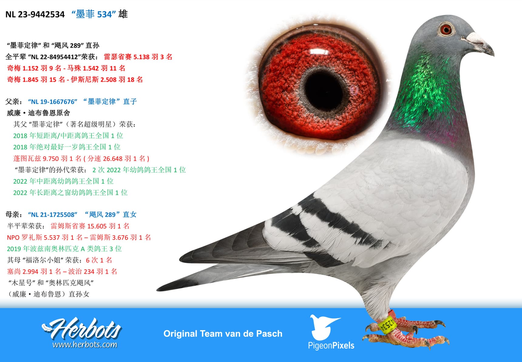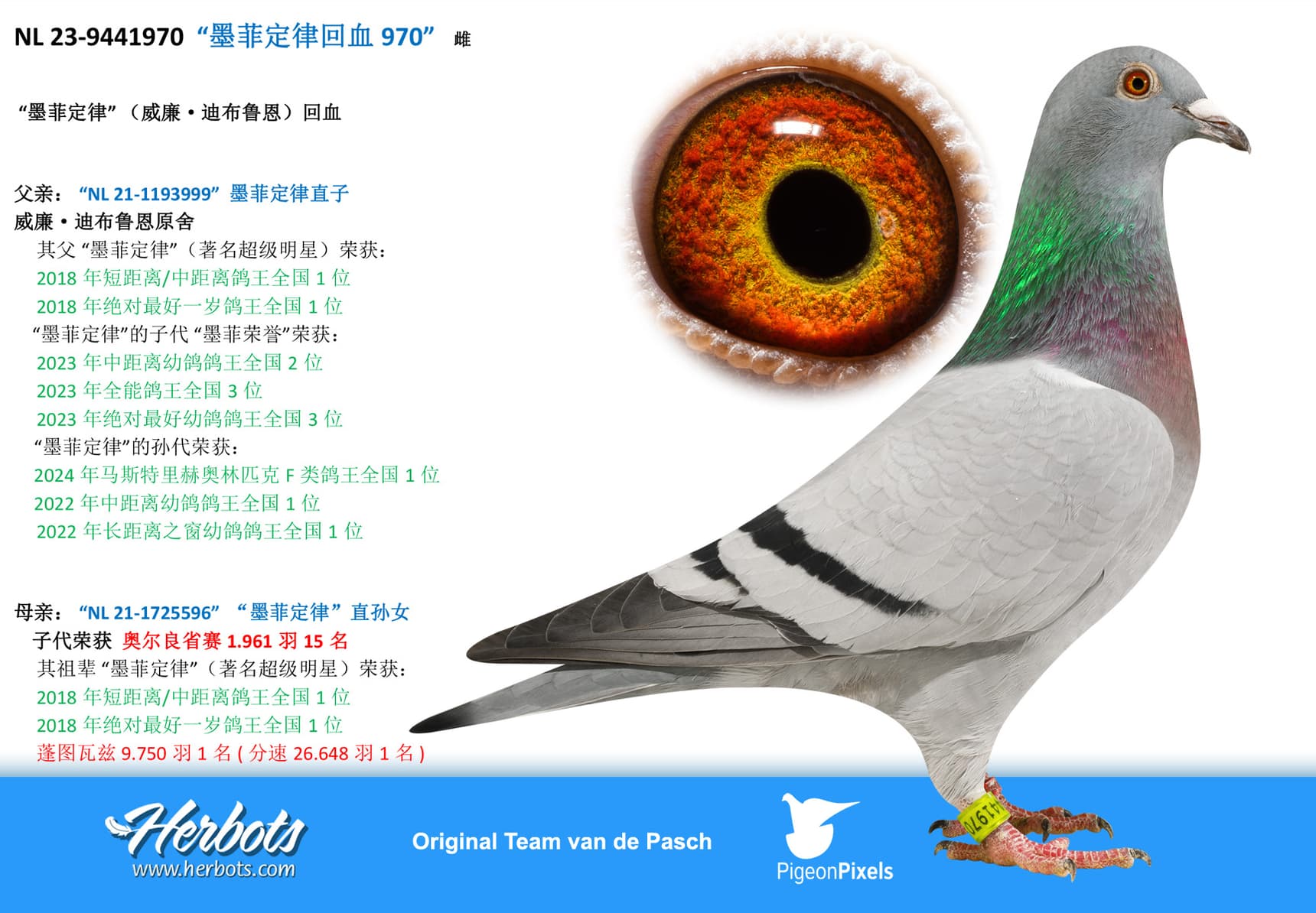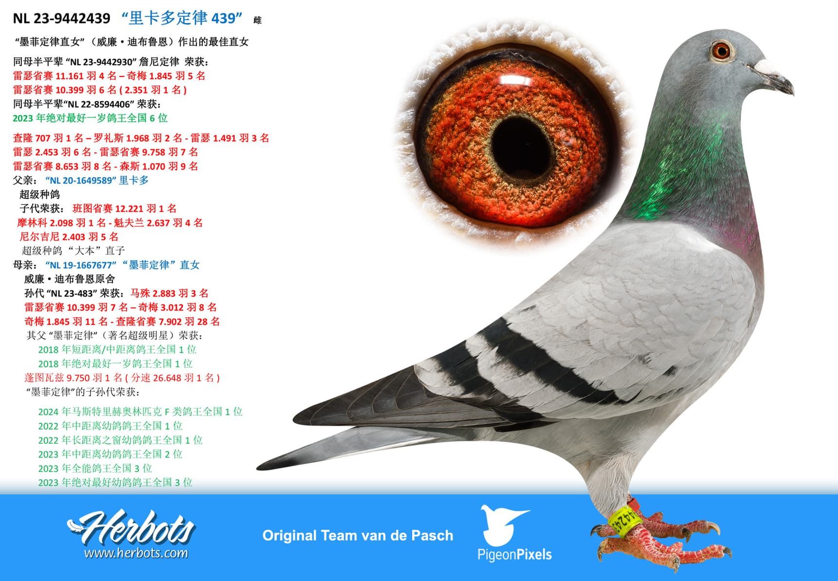 She is mother of “NL 22-8594406” 6 Nat Ace Pigeon Yearlings “The Very Best 2023”