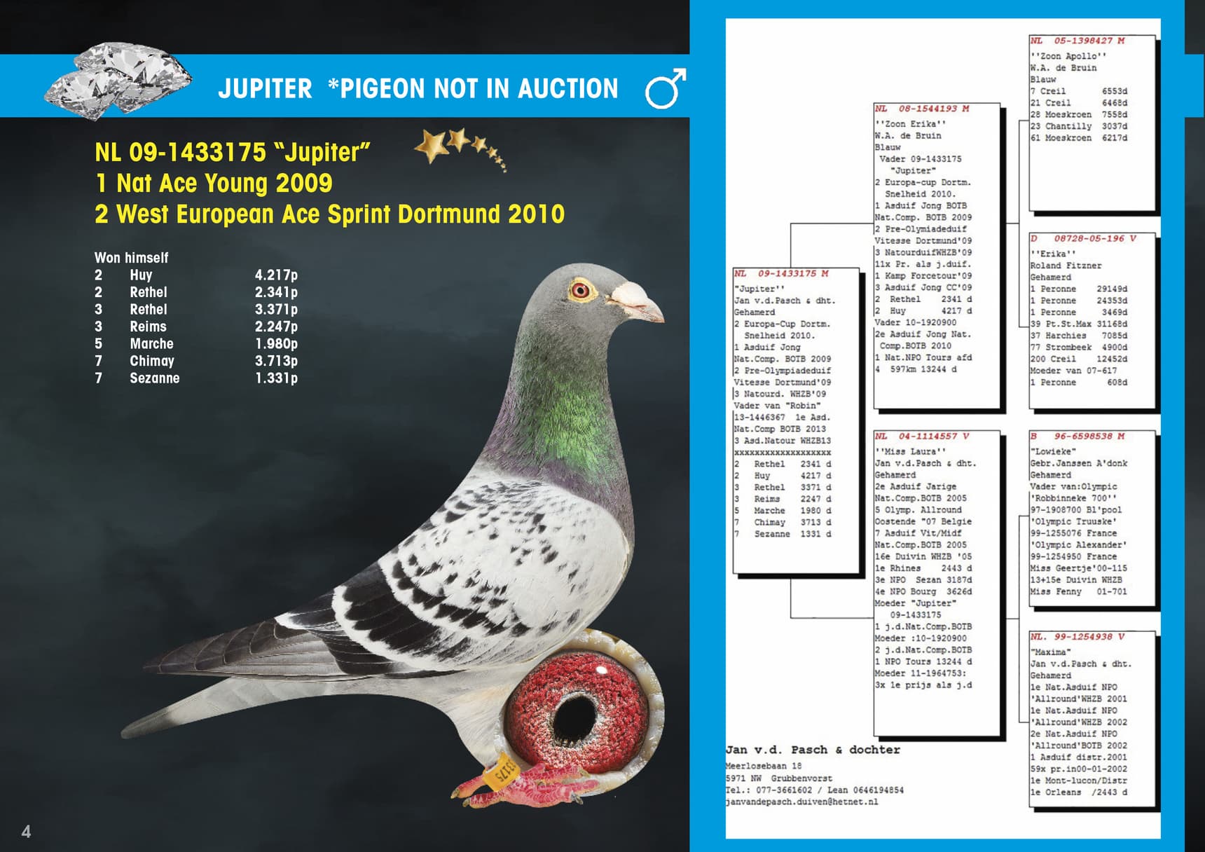It all started thanks to “Lowieke” BE 96-6598538, this pigeon was original from Janssen Arendonk and was coupled to “Maxima” NL 99-1254938. “Maxima” won 1st Nat. Ace Pigeon All Round NPO WHZB 2001. Their daughter was “Miss Laura” NL 04-1114557 who became 5th Olympiad Pigeon All Round 2007 and she was coupled to a cock “Son Apollo” from Willem De Bruijn. This was the first contribution of Willem De Bruijn pigeons that would be a golden move for the Van de Pasch loft. Together they became the parents of “Jupiter” NL 09-1433175. This top racer became 1st National Ace Pigeon Youngsters 2009 and 2nd West European Ace Pigeon Sprint 2010. The offspring of this wonder racer is still into almost all top pigeons. A strain of pigeons that continues to win generation after generation and can fly 1st prices against thousands of pigeons.