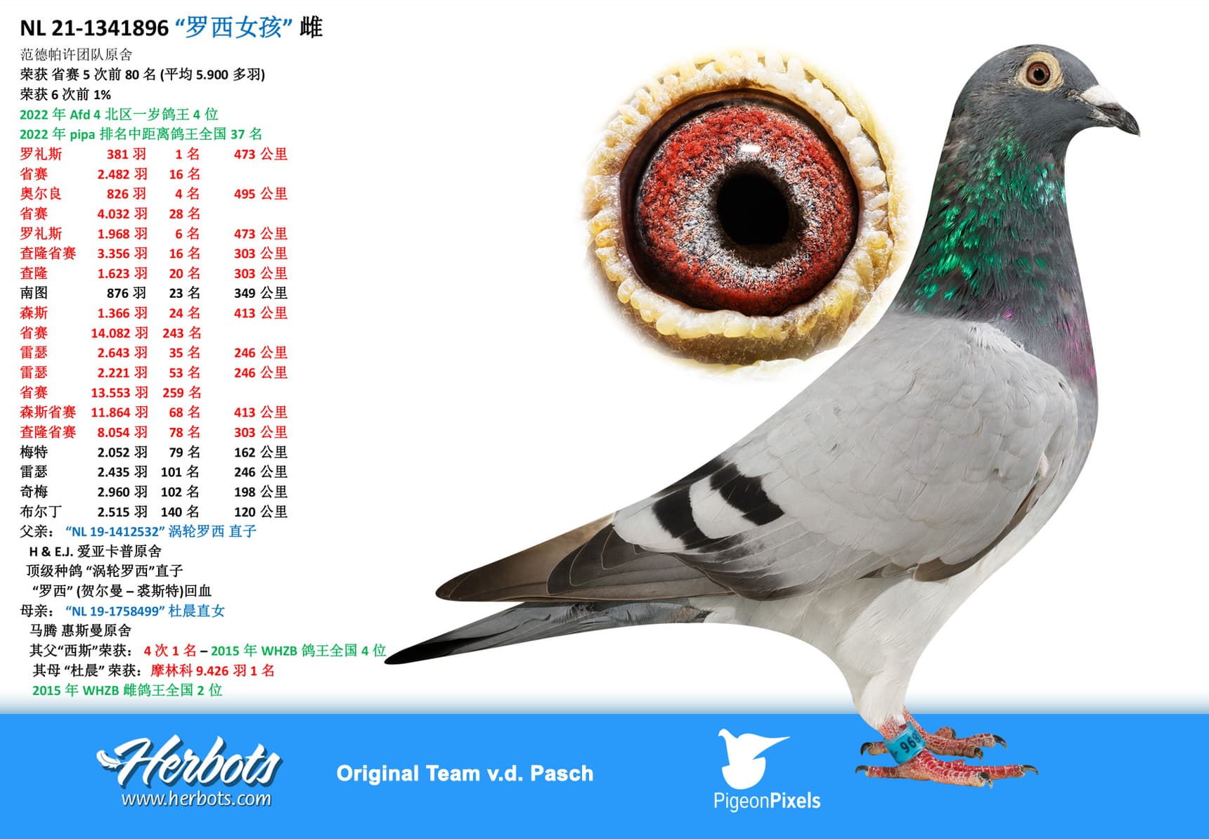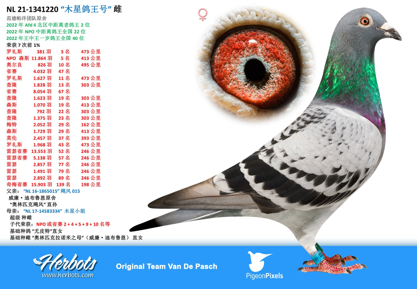 The ace pigeon “NL 21-1342212” No Limit is a daughter of 2 children who come further from their 2 best breeding lines of their colony. This is the super breeder "Jupiter" coupled to "Mother Olympic Ranomi" who were then crossed with the "Olympic Hurricane" line of Willem De Bruijn.