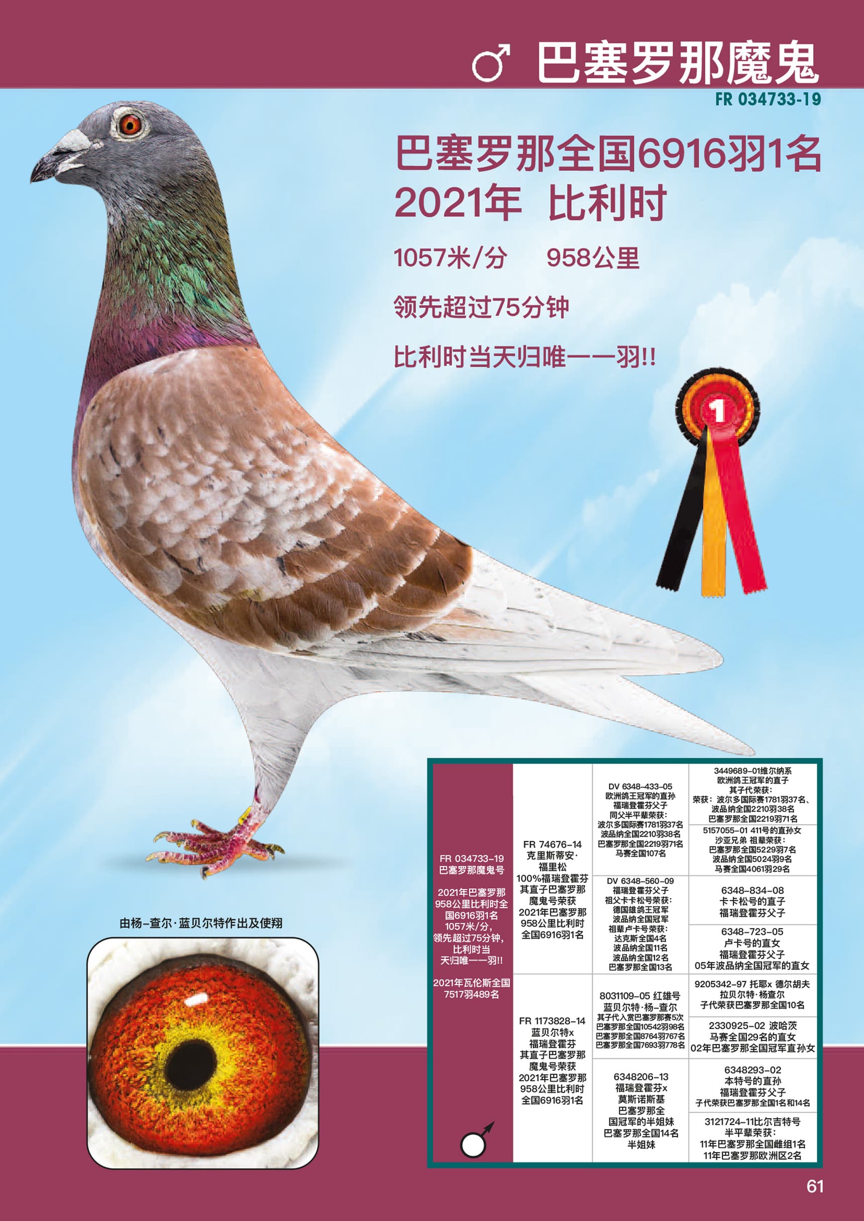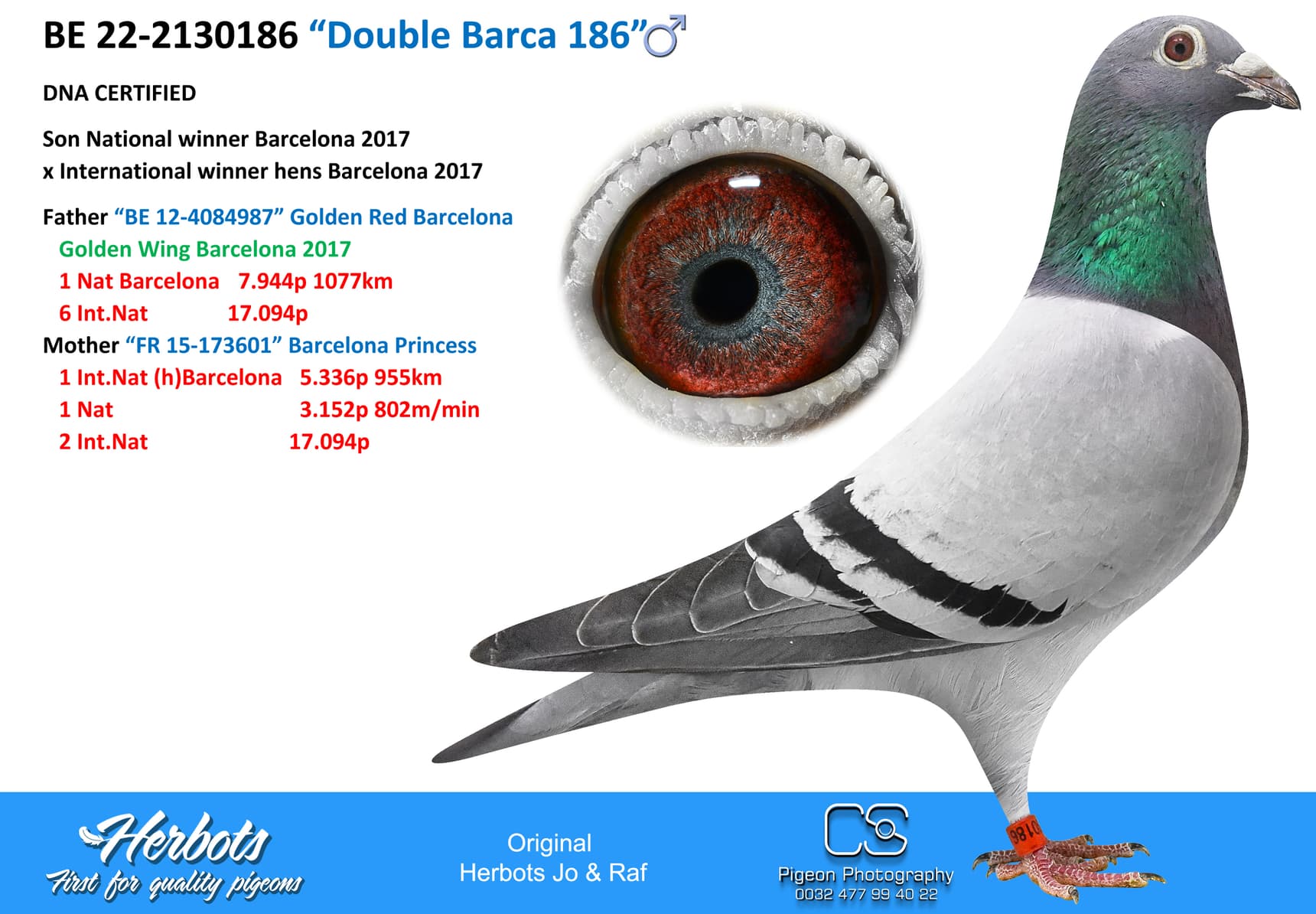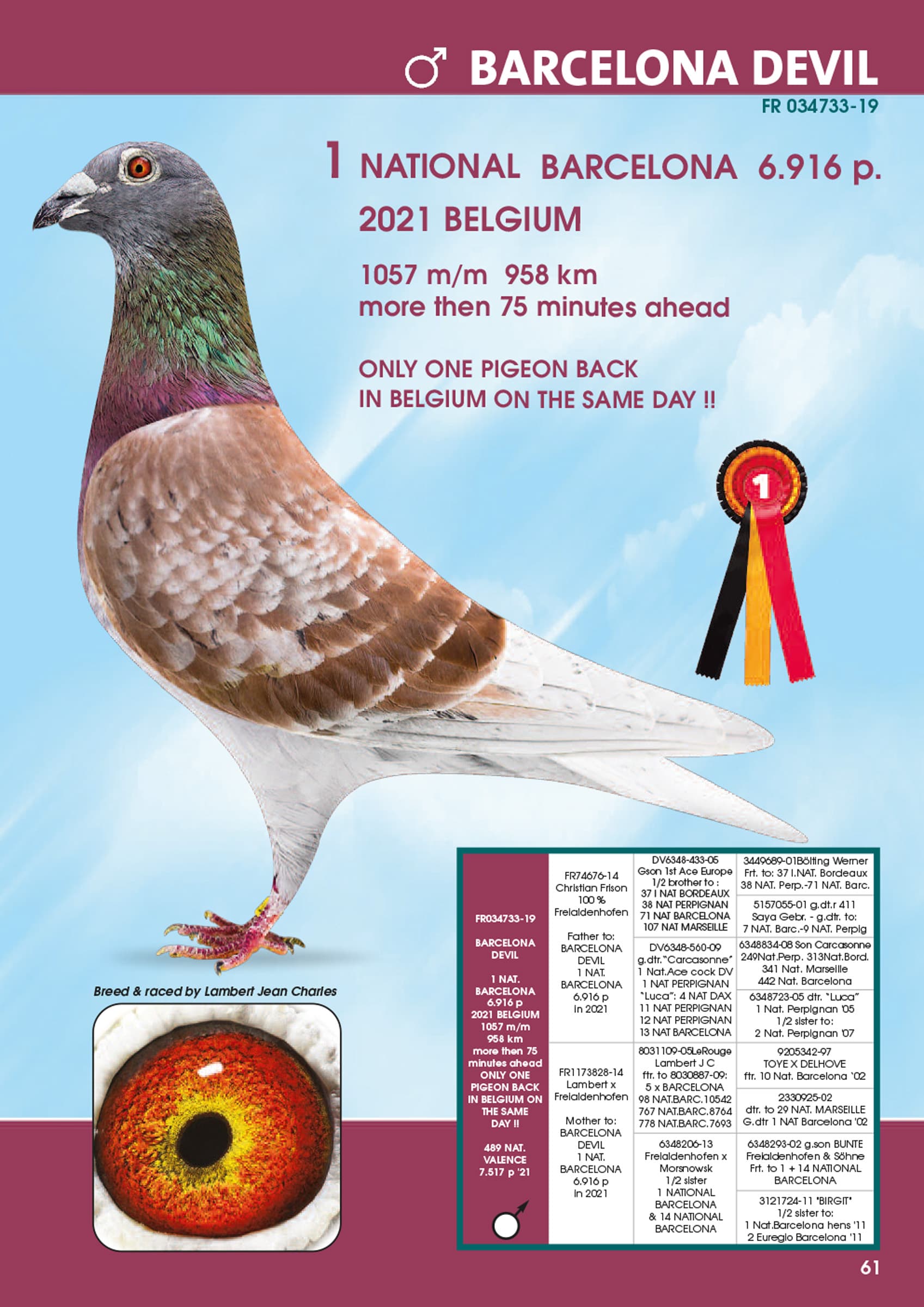 This top cock won the national Barcelona competition for Belgium in 2021 and came home to the lofts of Lambert Jean Charles on the same day of liberation. This topper was also the only pigeon in Belgium that reached its loft the same day, which is already a very strong achievement.