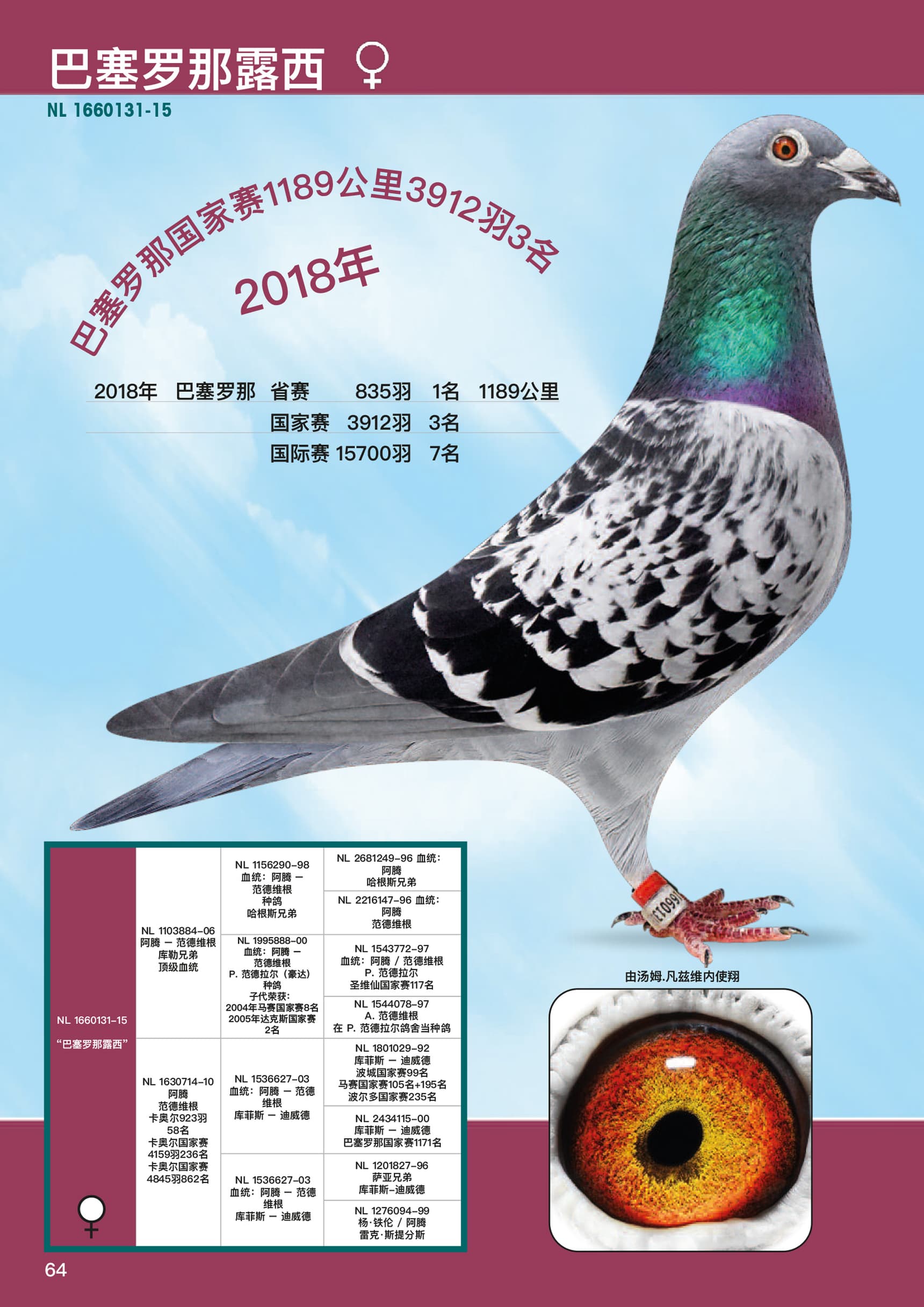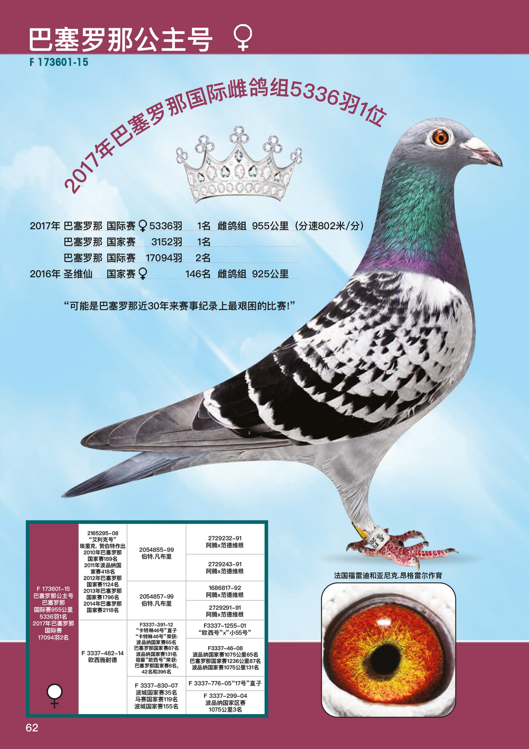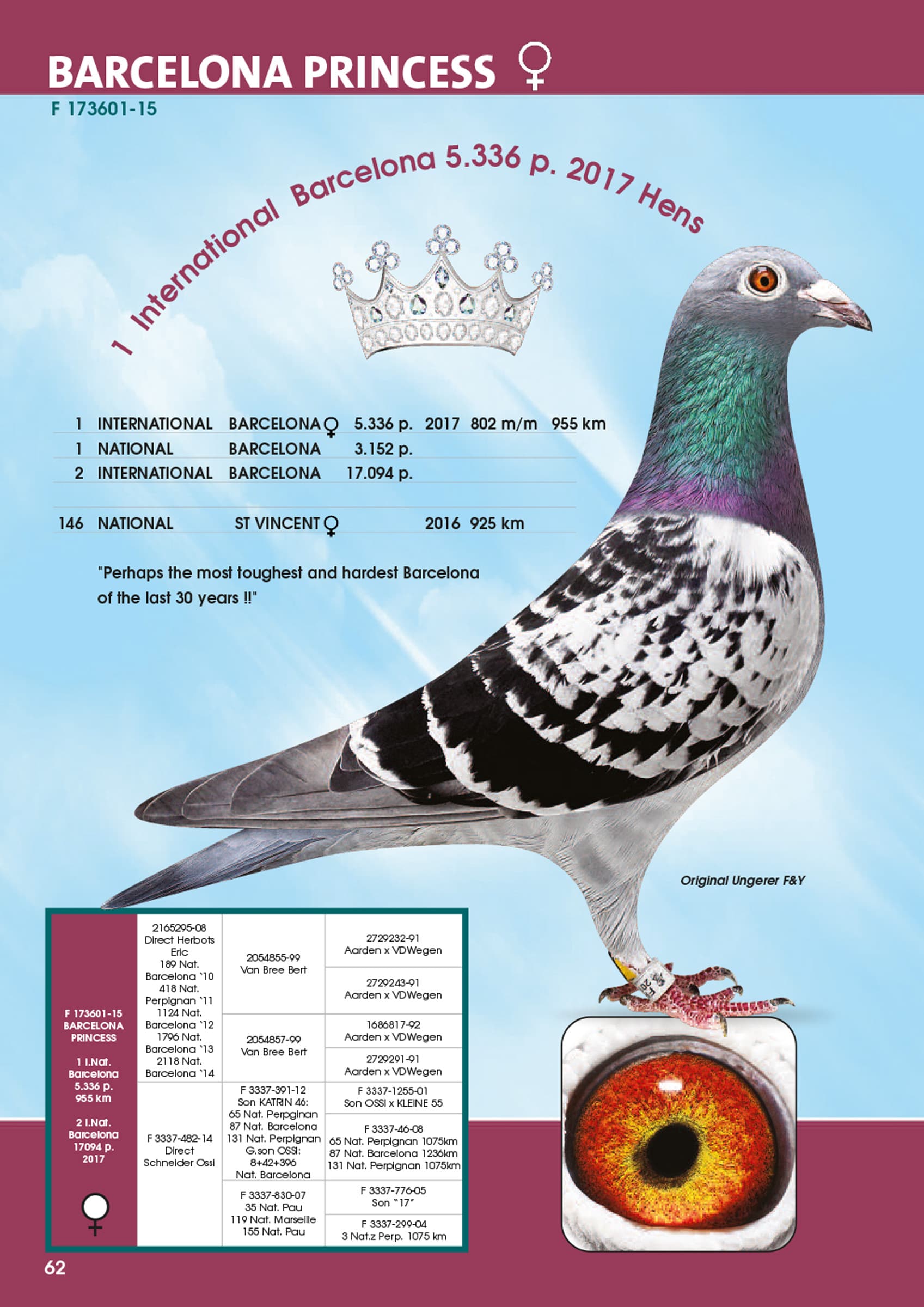 That same year of “Golden Red Barcelona” F & Y Ungerer also won 1st National against 3,152 pigeons and 1st International hens against 5,336 pigeons in France. Unfortunately she had to tolerate 1 pigeon in front of her against all pigeons and she became silver against 17,094 pigeons.