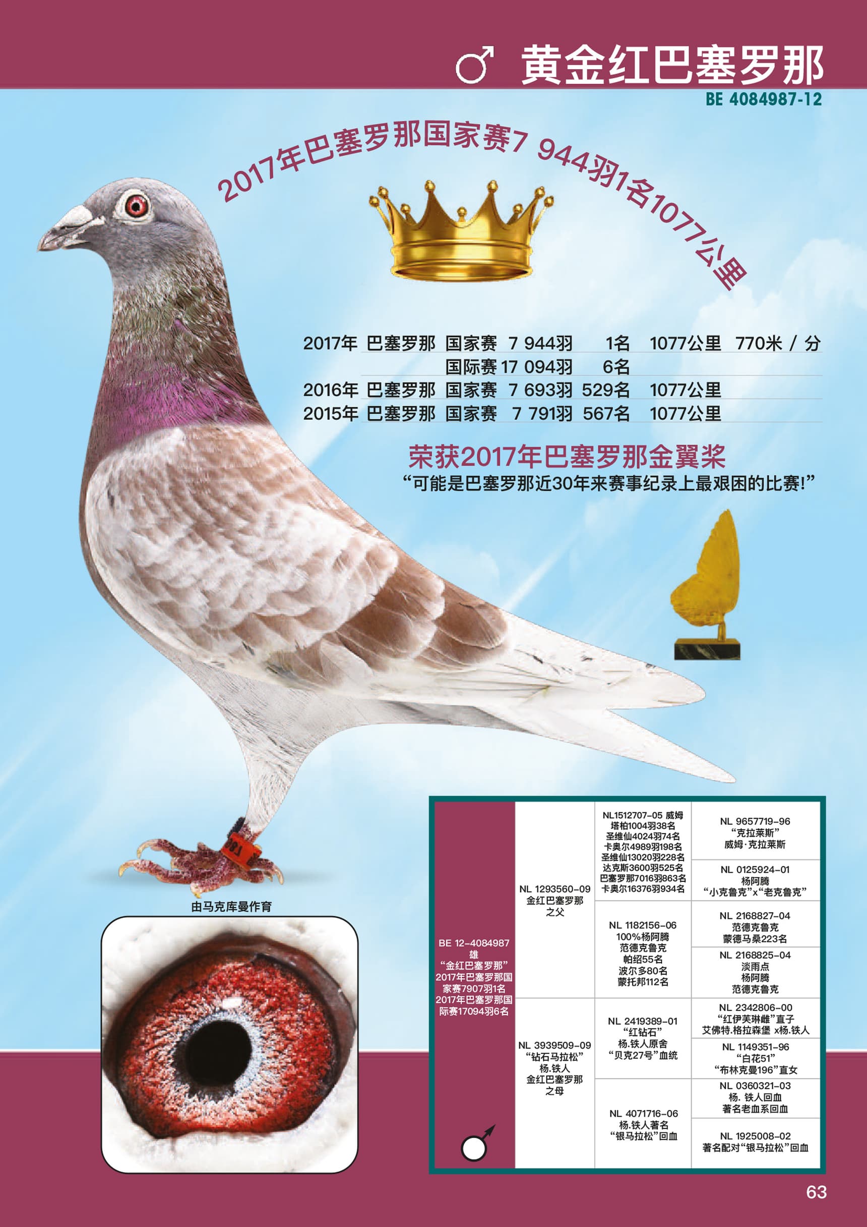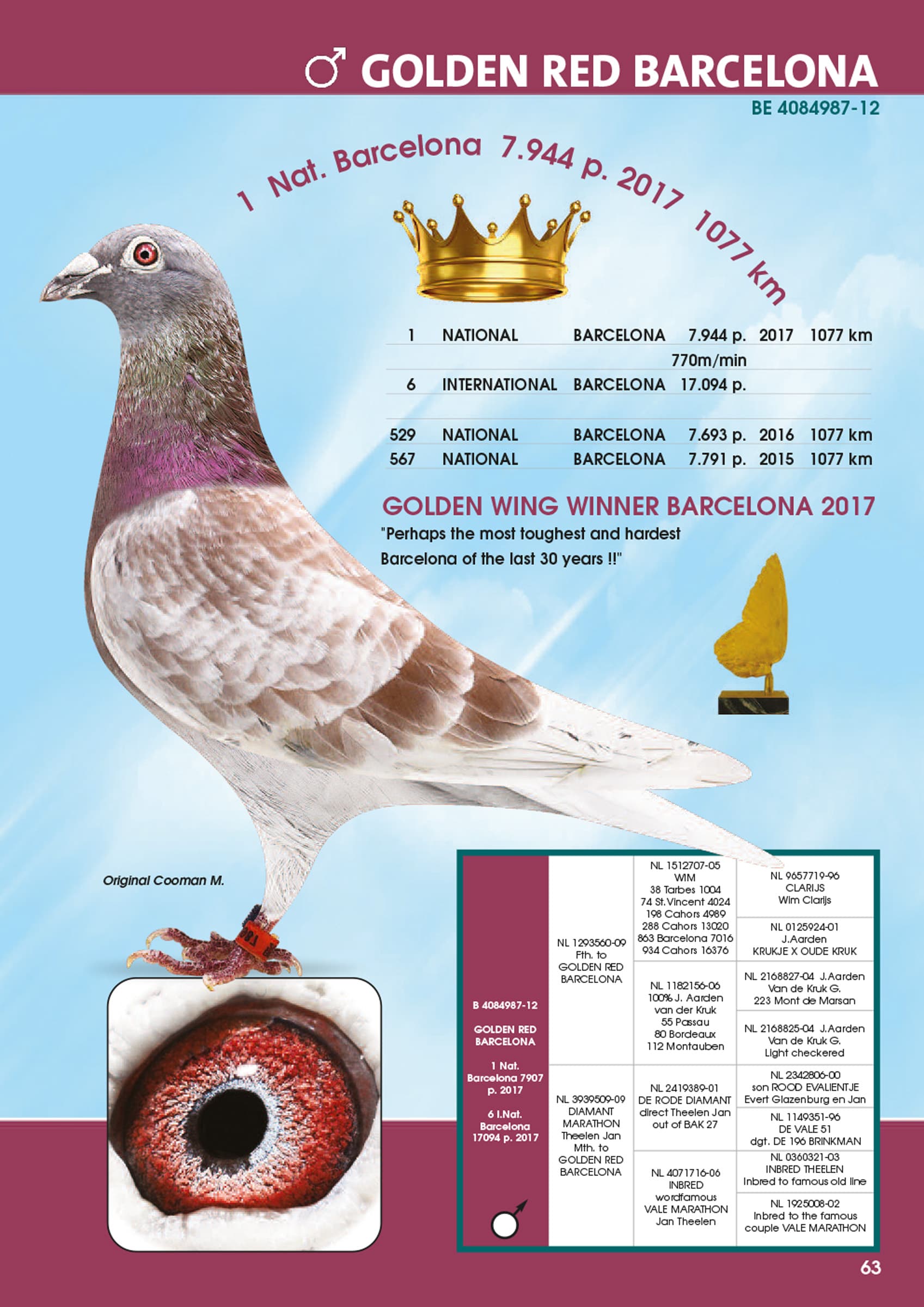 This top cock won 1st National Barcelona against 7,944 pigeons in 2017 at a speed of 770m/min over a distance of 1077km. Perhaps the toughest edition in the last 30 years. The