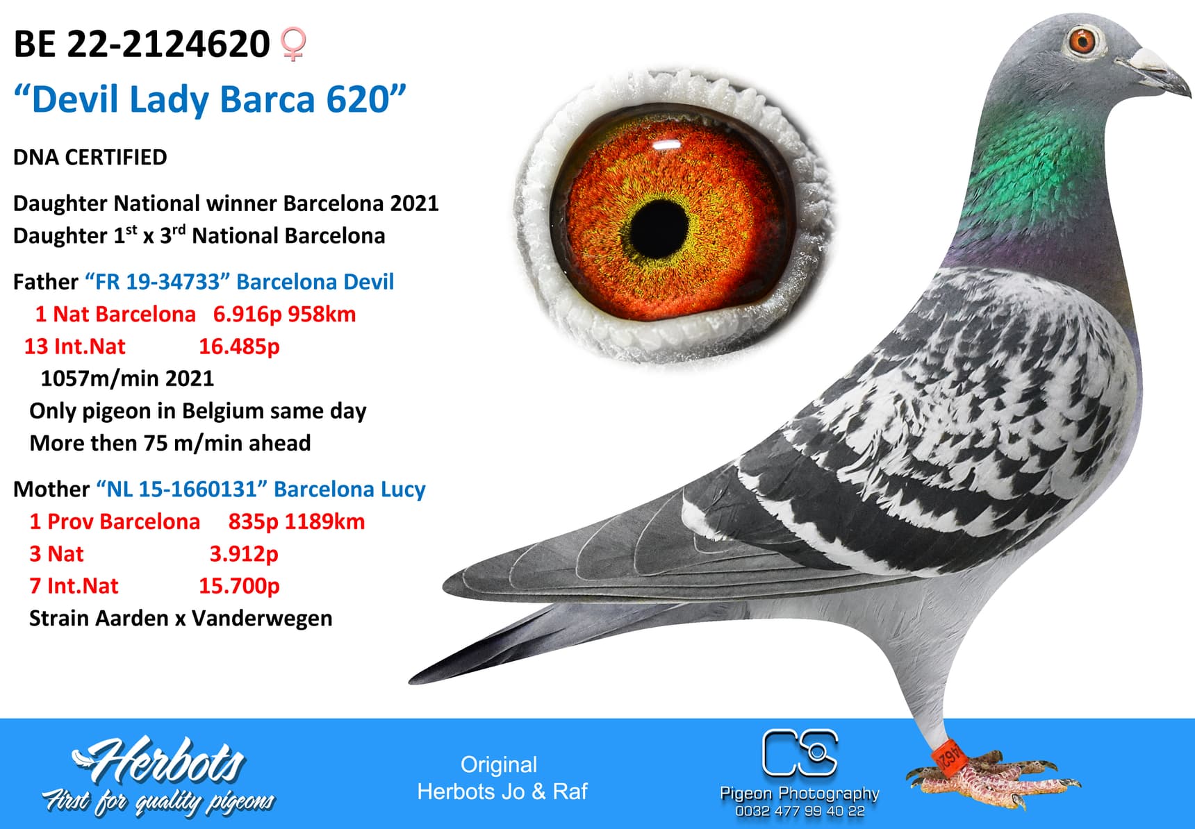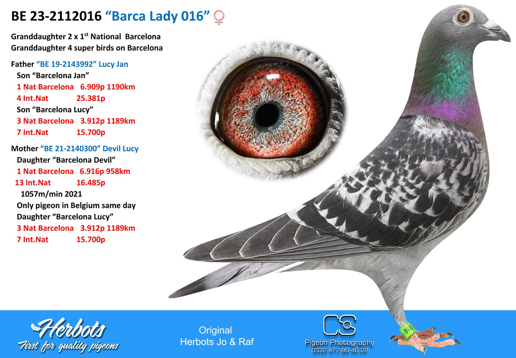 This hen won in 2018 from Barcelona 1st Provincial Barcelona against 835 pigeons ( 3rd National against 3,912p and 7th International against 15,700 pigeons ) and this over a distance of no less than 1189km. Her blood is mainly Aarden and Vanderwegen, which were crossed here.
