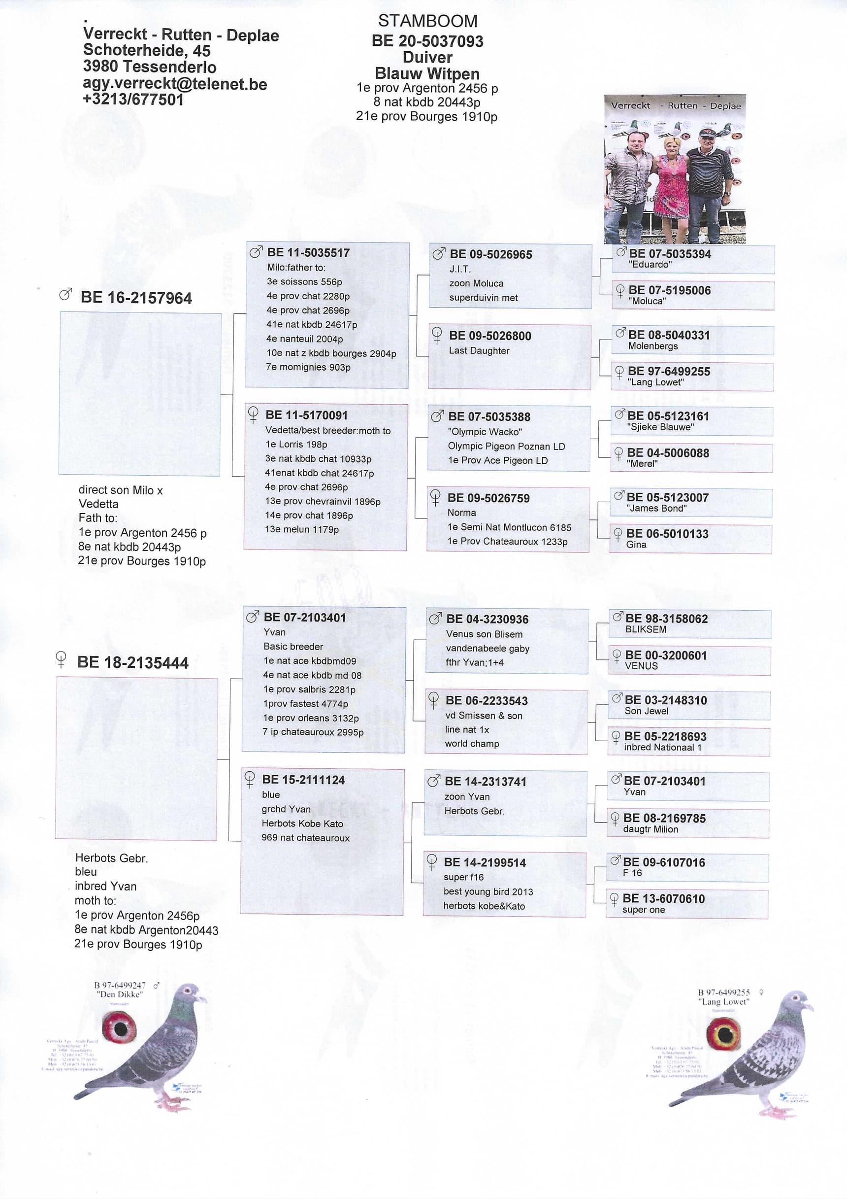 In Tessenderlo, the Verreckt – Rutten – Deplae trio hit the mark on Argenton, against the wind and masses they clocked a yearling cock who flew far ahead in the provincial competition and achieved 8th place nationally against 20,443 yearlings. Once again proof of their rock-solid foundation that they can build on. In the next national race from Issoudun they won silver and bronze with the old birds and 2 x top 10 provincial with the yearlings. Their racing team is in order, that much is certain. Their counter of provincial victories under this name is currently at 9, but in this condition there will certainly be something more.