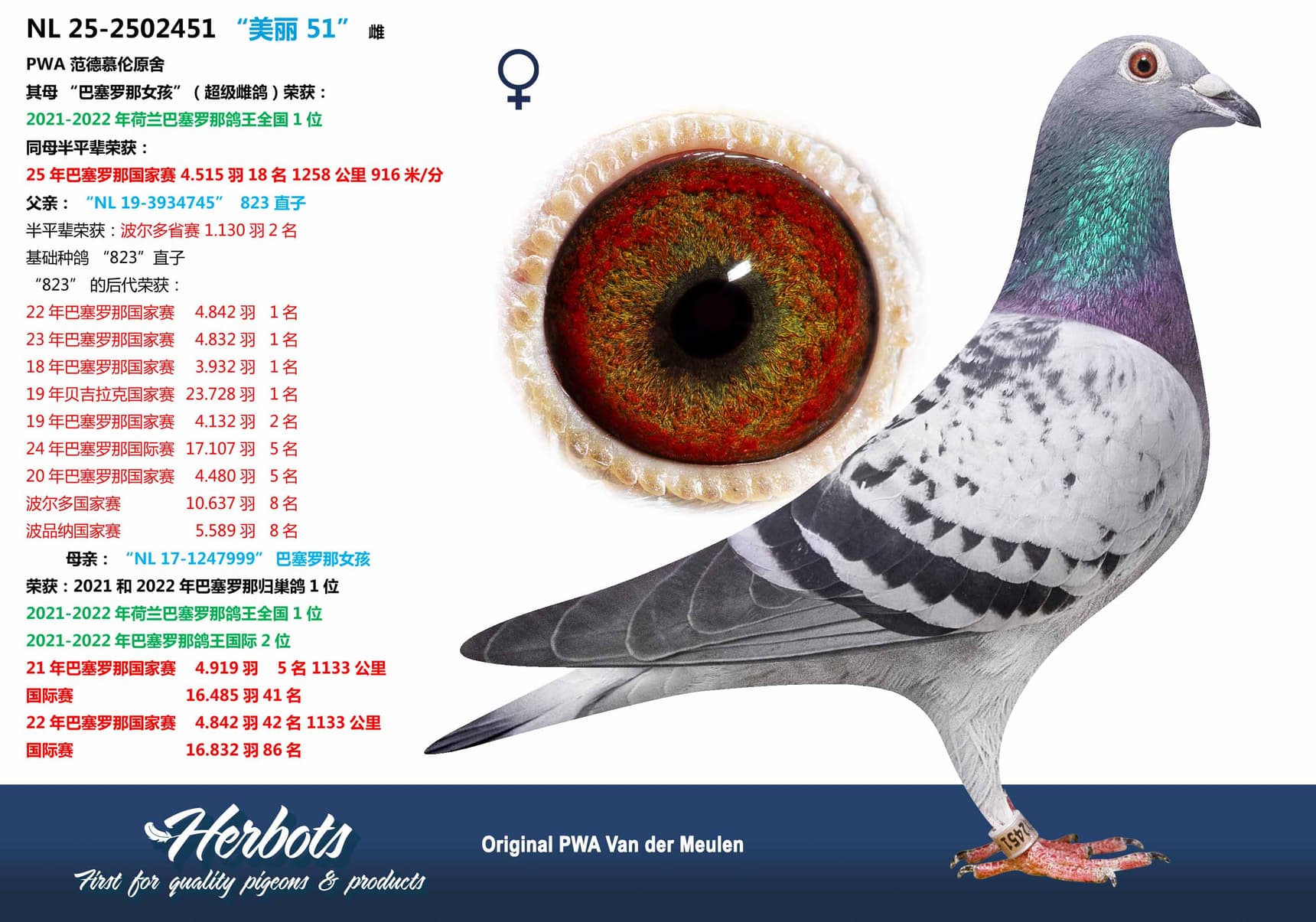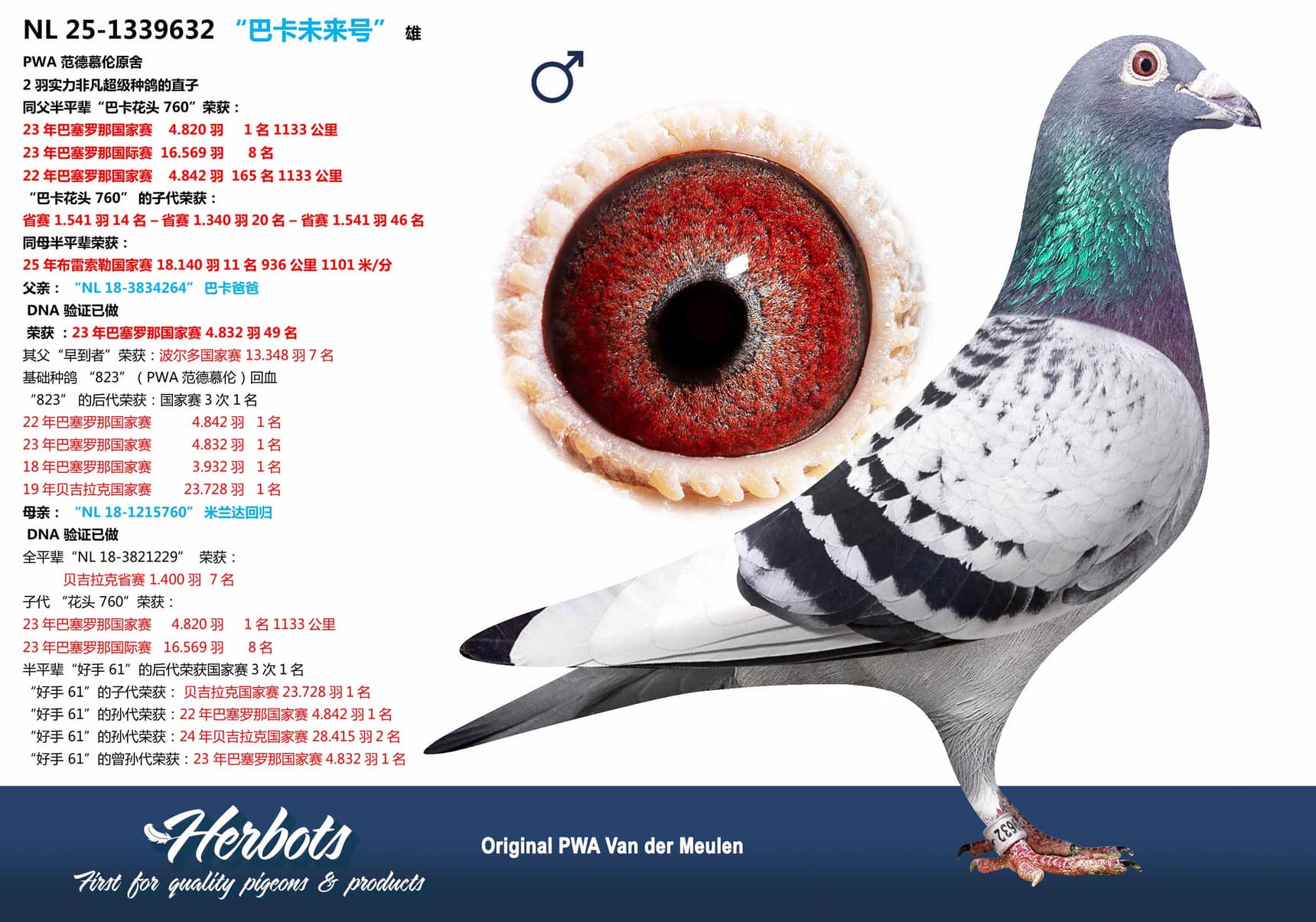 The winner himself, "Bonte 760," also won 165th National Barcelona against 4,832 pigeons in 2022. Her sire is inbred to stock sire "Superkweker 823" and is a grandson of "Crack 61." The dam of "Bonte 760" is a daughter of "116," this super breeding hen is the dam and grandmother of four 1st National winners and was often the regular partner of stock sire "Superkweker 823."