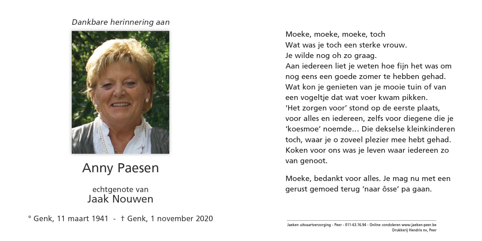 I skipped a heartbeat when Miet told me the sad news this morning. I was feeling sick for a minute and was stunned. Dirk spoke to us about mama only a few days ago, about how it went up and down but that she always got the strength to fight back. Then so sudden, having to give away such a sweet mother unexpectedly must hurt very bad. We will always remember Annie as a caring mother, the mother hen that took care of her goslings as no other ! She was always ready waiting with sandwiches when you came for a visit, a cup of coffee, some tea, a coke, nothing was too much…She spent her entire live in taking care of others but lately she needed help herself, unfortunately she lost this unfair battle way too soon.