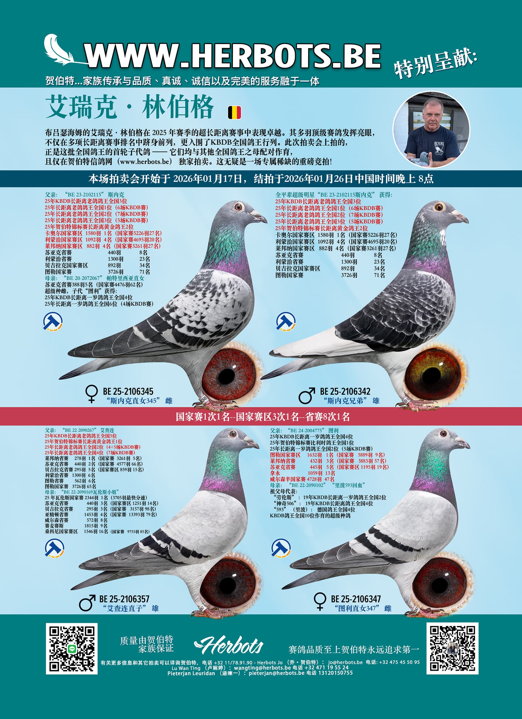 布吕瑟海姆艾瑞克·林伯格在 2025 年赛季的超长距离赛事中表现卓越。其多羽顶级赛鸽发挥亮眼,不仅在多项长距离赛事排名中跻身前列,更入围了KBDB全国鸽王行列。此次拍卖会上拍的,正是这批全国鸽王的首轮子代鸽 —— 它们均与其他全国鸽王之母配对作育,且仅在贺伯特信鸽网(www.herbots.be) 独家拍卖。这无疑是一场专属稀缺的重磅竞拍!