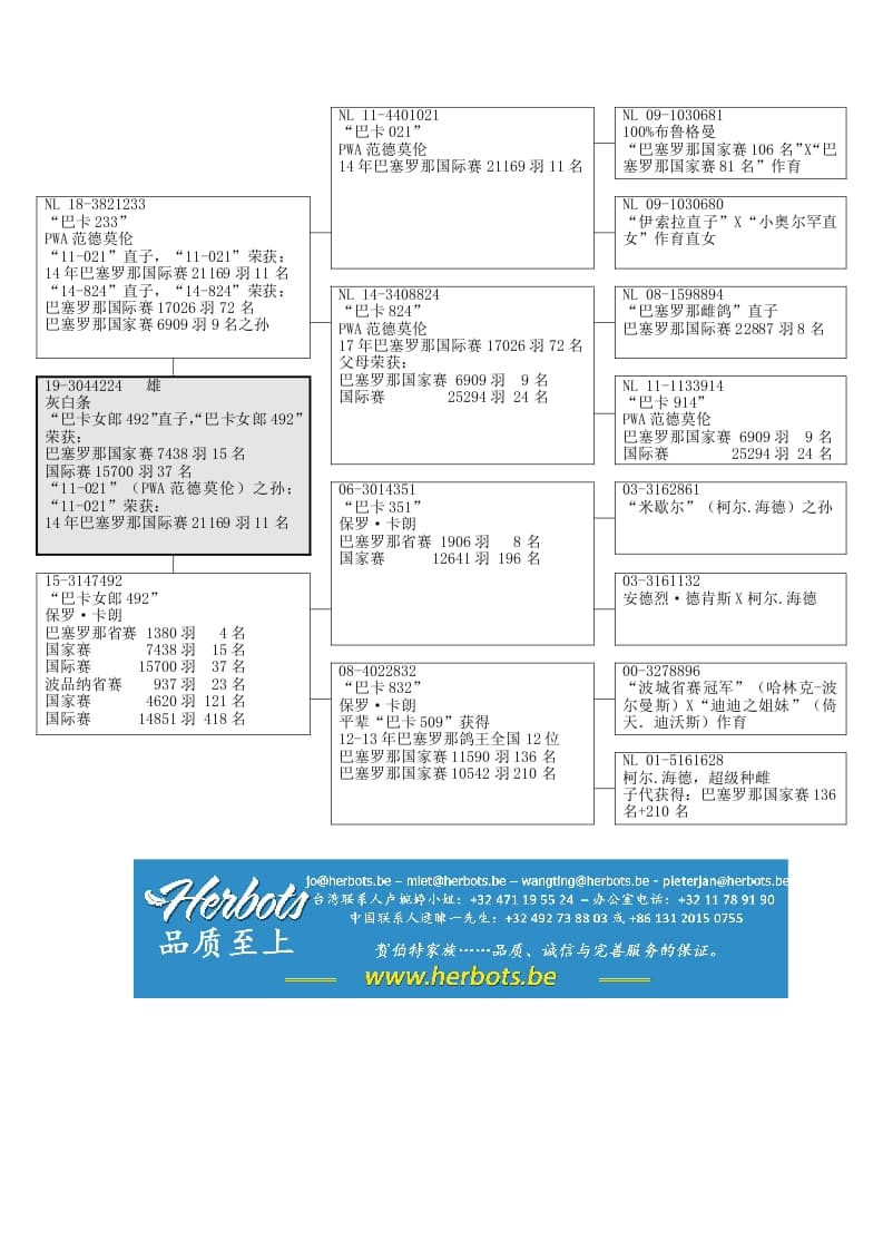 父亲:NL 18-3821233“巴卡233”“11-021”直子,“11-021”荣获:巴塞罗那国家赛1150公里5423羽10名母亲:BE 15-3147492“巴卡女郎492”巴塞罗那省赛1053公里 1380羽 4名国家赛 7438羽 15名国际赛 15700羽 37名波品纳国家赛912公里 4620羽 121名